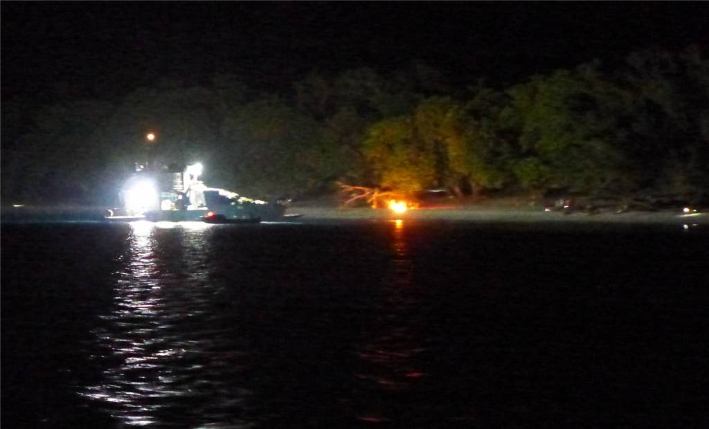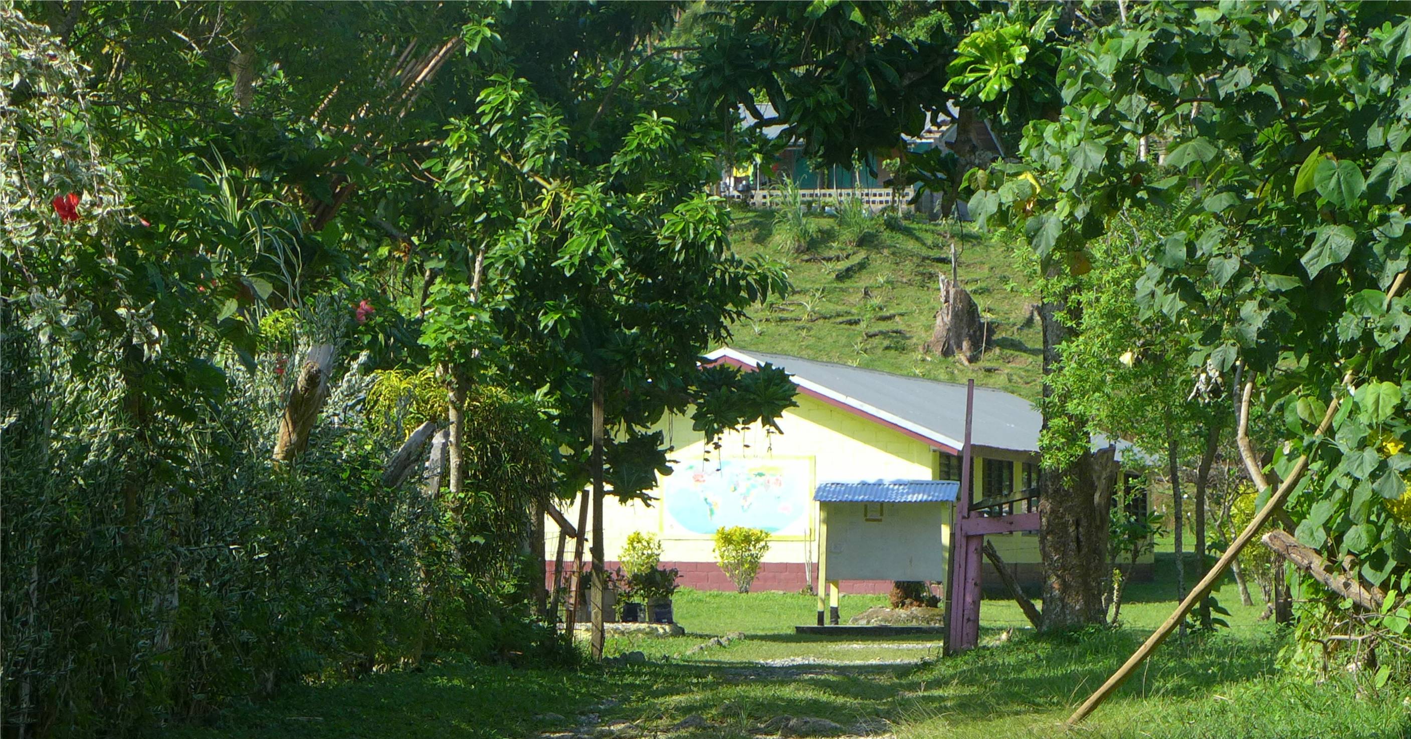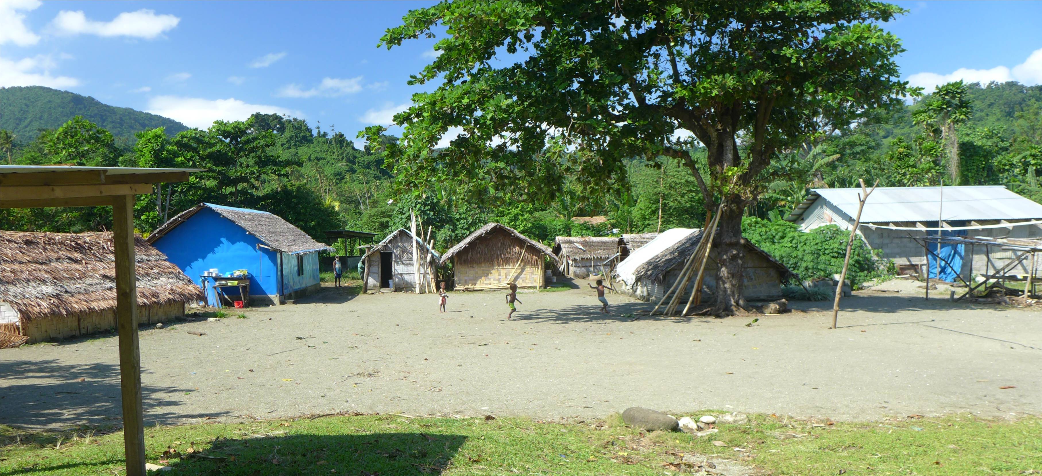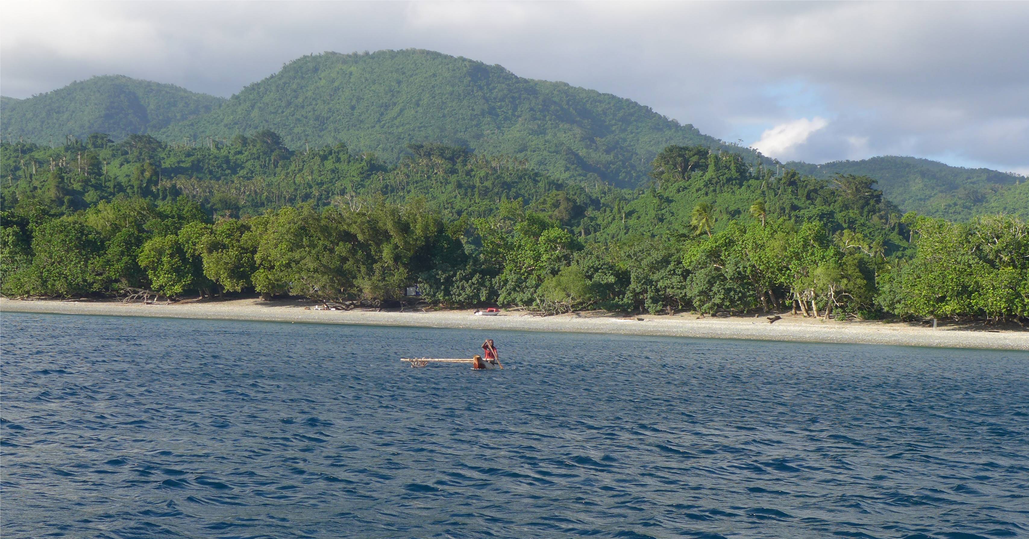 In der großen Bucht liegen drei Dörfer und es gibt einen erstaunlich regen Bootsverkehr. Da sind zum einen die kleinen Motorboote, die durch die Bucht flitzen und zum anderen die kleinen Frachter. Als wir ankommen liegt ein Schiff vor Anker und Waren werden auf kleine Boote umgeladen. Am zweiten Abend fährt ein Frachter zwischen uns und dem Strand durch. Es ist stockdunkel und wir sind froh, dass wir kurz vorher das Ankerlicht eingeschaltet haben. Das Schiff hat eine Klappe am Bug und fährt einfach auf den Strand. Das ganze Dorf ist auf den Beinen. Taro in Säcken wird verladen, immer kommt noch jemand mit einem Sack auf dem Rück angerannt. Und auch in unserer letzten Nacht ankert wieder ein Schiff in der Bucht.