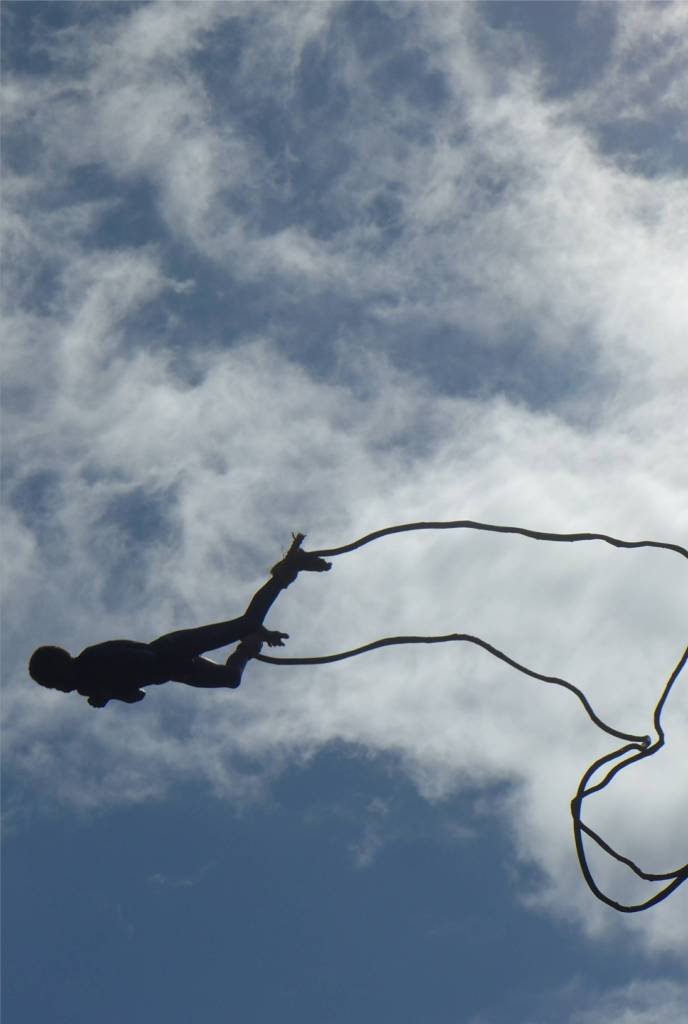 Sofort nach dem der Springer auf der Erde aufgekommen ist, wird er von anderen Männern aufgerichtet, die Lianen werden von den Fußgelenken geschnitten und er wird vom Ladeplatz geleitet. Die Lianen sind zwar flexibel und auch der Absprungplatz gibt nach, trotzdem sieht es gefährlich aus und ist es auch. Die Lianen enden nur einen halben Meter über dem abfallenden Landeplatz. Der Springer kommt also immer auf der Erde auf.