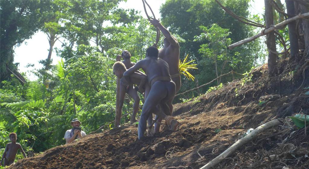 Zurück zum Sprung. Einige Männer lockern den Boden in der Landezone immer wieder auf. Die vorbereiteten Lianen werden sortiert. Die ausgewählten Lianen wurden am Tag zuvor geschnitten, die Enden werden zerfasert, um sie an die Knöchel zu knoten. Diese Enden sind mit Bananenblättern umwickelt. Der Springer steigt auf den Turm und klettert auf seine Absprungvorrichtung, andere Männer helfen nun die Blätter zu entfernen und die Lianen zu befestigen. Sorgfältig wird kontrolliert, dass die Lianen sich nicht am Turm verhaken, der Chief überwacht das Ganze vom Boden aus.