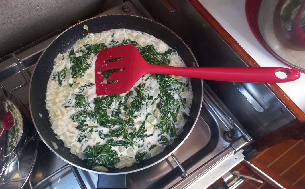 Die Blätter habe ich gründlich gewaschen, in Streifen geschnitten und blanchiert (sicher ist sicher, Vanuatu hat eine Vielzahl unerfreulicher Parasiten im Angebot). Dann habe ich Zwiebelstückchen und Knoblauchscheiben in Olivenöl angedünstet, die Blätter hinzugegeben, das Ganze mit reichlich Kokosmilch abgelöscht und mit Salz und Pfeffer gewürzt.
