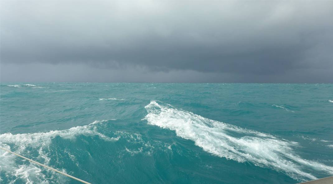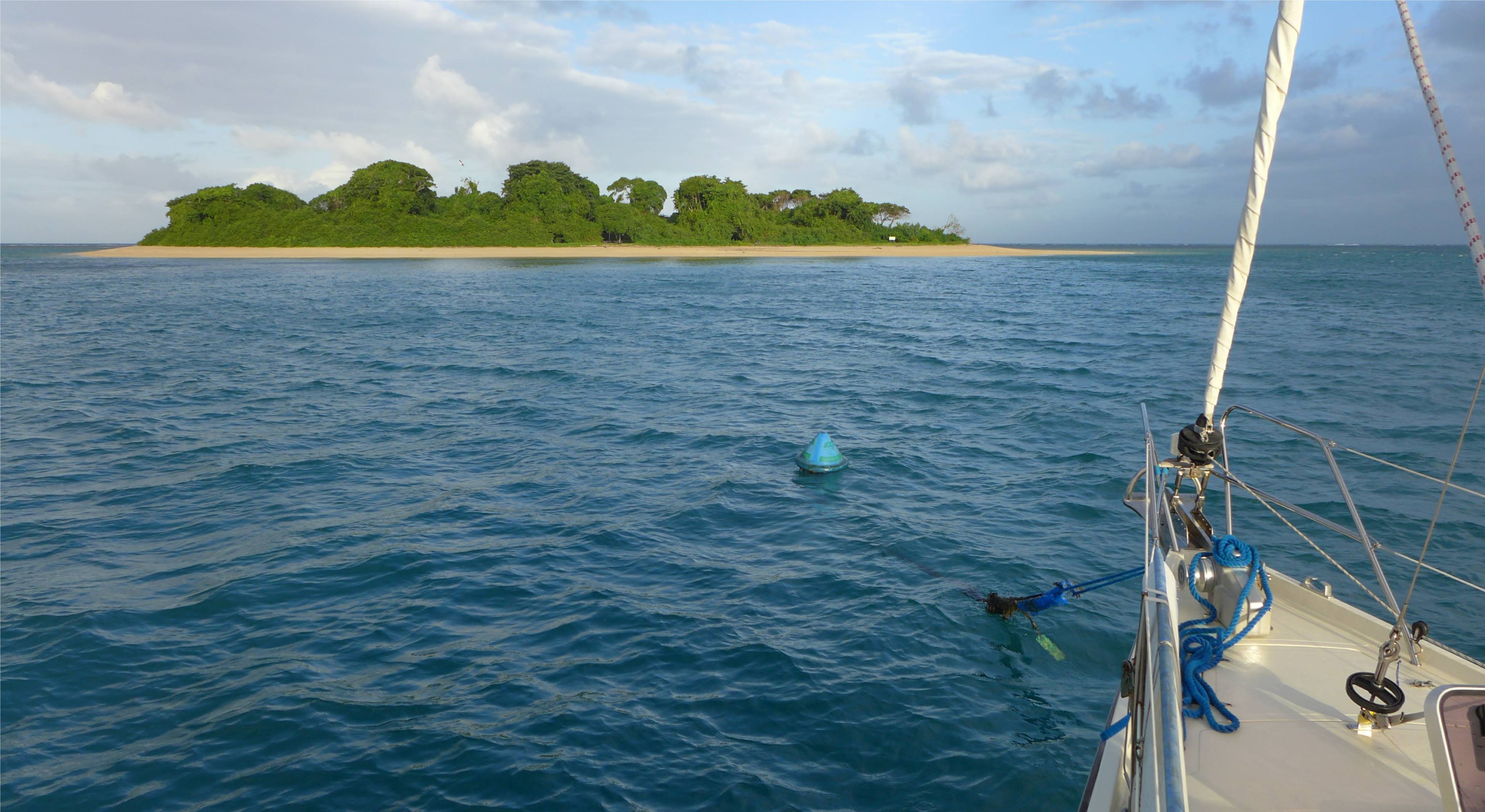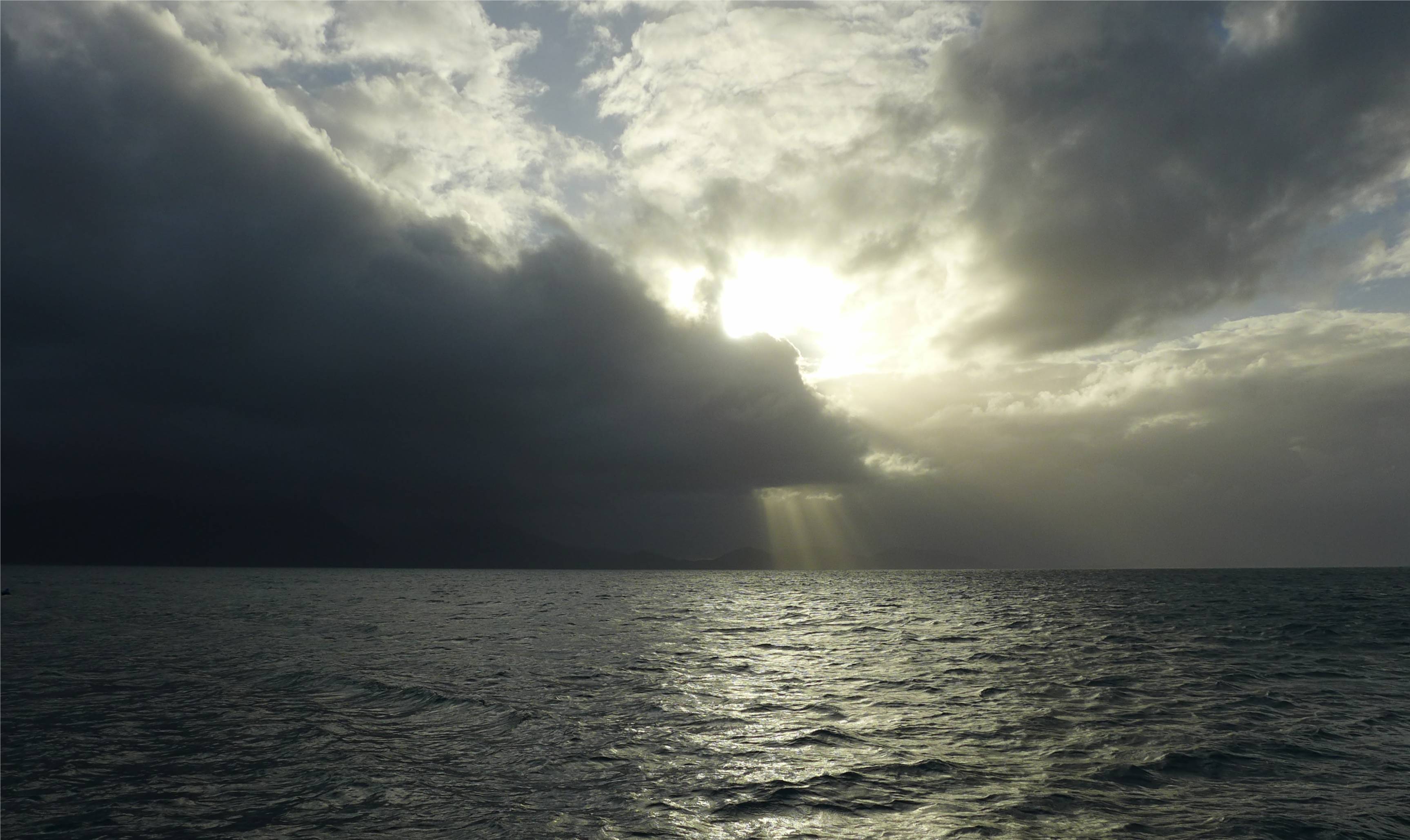 Der Sonntagmorgen wirkt mit dunkelgrauen Wolken wenig einladend. Wir warten einen kräftigen Schauer ab, bevor wir die Boje loswerfen. Ich habe heute gleich meine Ölhose angezogen, der nächste Schauer kommt bestimmt. Es wird ein schneller aber sehr anstrengender Segeltag hinter dem berühmten Great Barrier Reef. Sprühregen und Schauer, an einem Kap ist der Wind plötzlich weg und dann gibt es wieder heftige Böen, dazu dieser teilweise hohe und steile Seegang, der sich auch gerne mal bricht. Nach 42 Meilen suchen wir uns eine Boje bei Hope Island aus. Wir sind wieder das einzige Boot und haben die freie Wahl. Wieder läuft abends der Schwell übers Riff, es ist jedoch nicht so schauklig wie in der Nacht zuvor.