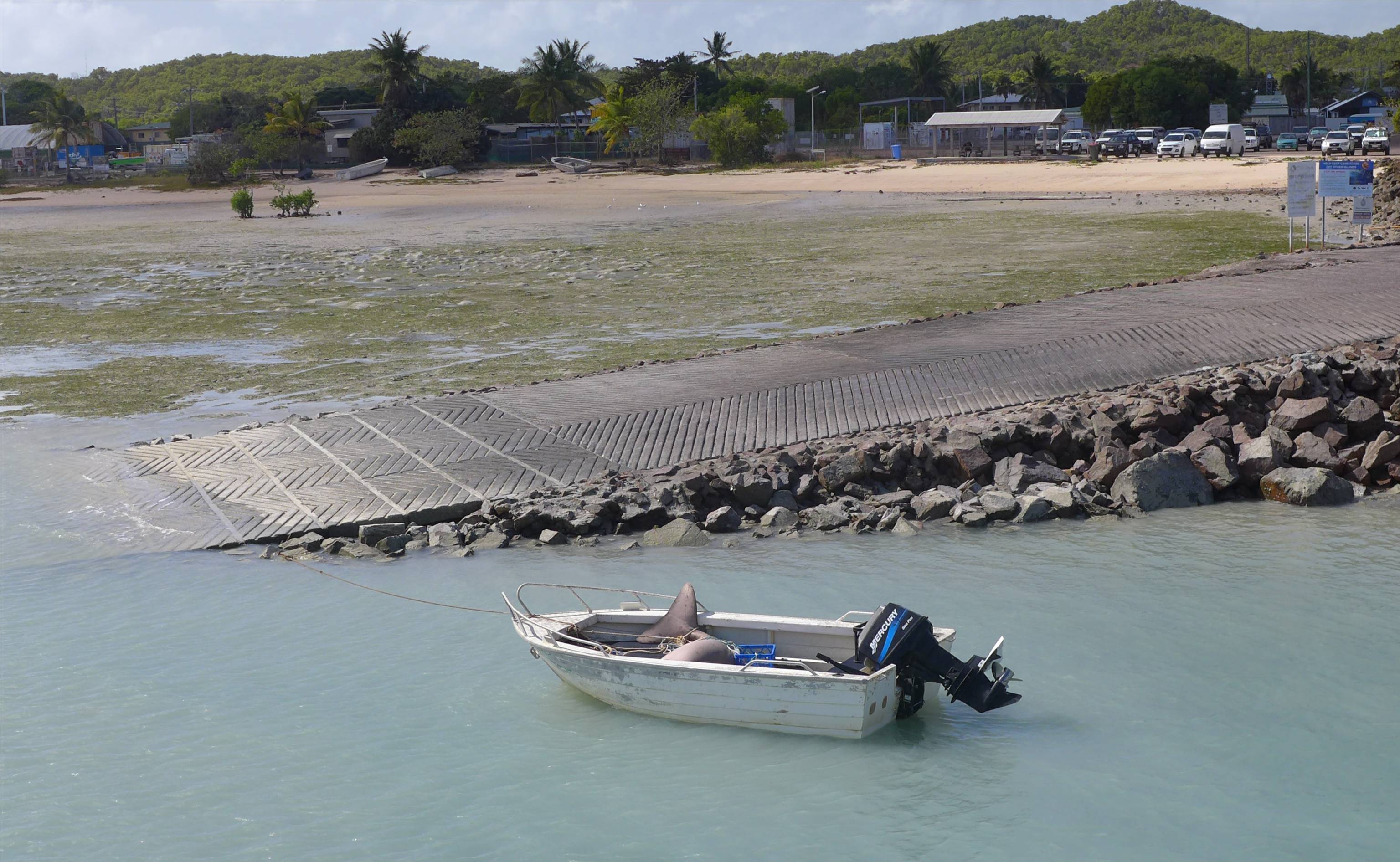 Am Anleger sehen wir ein kleines Motorboot mit einem toten Dugong. Erst dachte ich, das Dugong hätte sich in einem Fischernetz verheddert und wäre ertrunken, aber dann lerne ich, dass die Torres-Strait-Insulaner (die indigene Bevölkerung der Region) Dugongs und Schildkröten jagen dürfen. Das wusste ich nicht. Eine ganze Familie klettert zum Dugong ins Boot, die Eltern, 2 Kleinkinder, ein Baby, der Kinderwagen und die Einkäufe stapeln sich auf dem großen Tier.