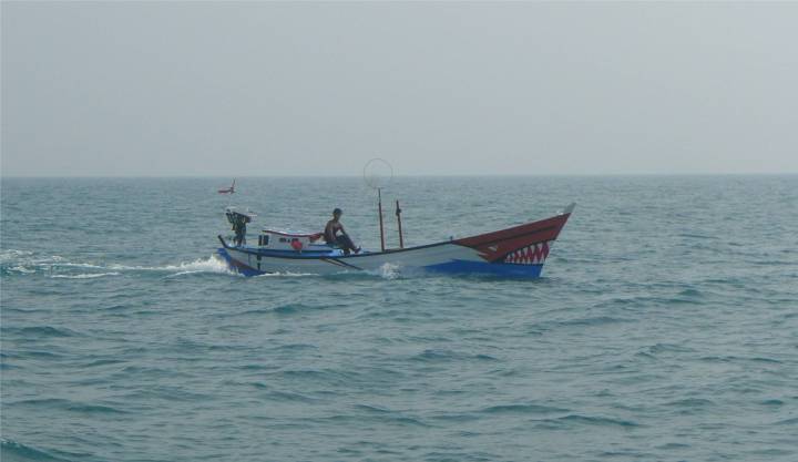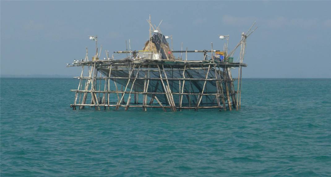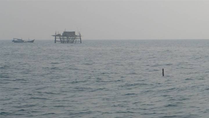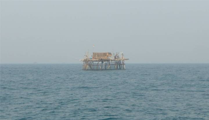 Als es hell wird, sehen wir, dass es sich bei einigen Fischern, die wir für Boote gehalten haben, um hölzerne Plattformen auf Stelzen handelt. Hunderte von diesen Konstruktionen mit einer Schutzhütte oben drauf und einem Netz darunter stehen in einer Wassertiefe von 25m viele Meilen vor der Küste. Kein Wunder, dass diese Fischer sich nicht bewegt haben! Wir können sie sehr gut umfahren.
