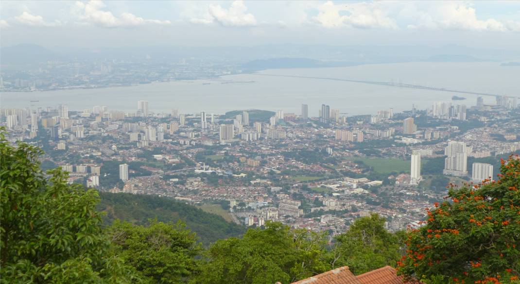 Eineinhalb Stunden stehen wir in der Schlange um innerhalb von 5 min unser Ziel zu erreichen. Oben angekommen, hat man einen fantastischen Ausblick über Georgetown. Es gibt Restaurants, Kioske, Fotostopps (Foto mit Papagei vor Leinwand oder Foto im Herz vor echtem Ausblick) und alle möglichen Bespaßungen. Uns interessieren die Spazier- und Wanderwege. Kaum hat man das Gewusel hinter sich, ist es ruhig, man kann den Blick genießen und die niedrigeren Temperaturen auf knapp 800m genießen. Die Wege führen meist im Schatten durch dichte Vegetation, an den wohl am schönsten gelegenen Häusern Penangs und an spektakulären Ausblicken vorbei. Wir sehen viele Tiere wie schwarz-rote Hörnchen, Eidechsen, Affen, Schmetterlinge und eine große Anzahl Vögel.