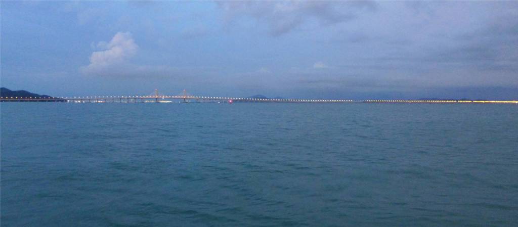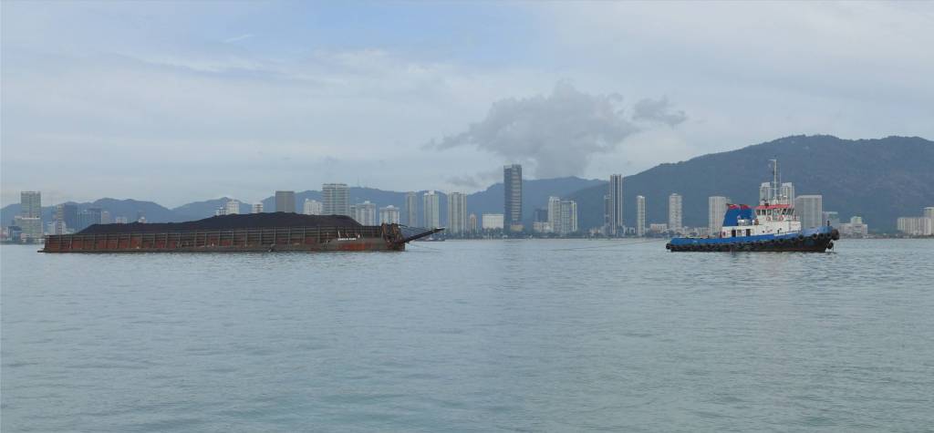 Von der Pier in Butterworth (am Festland) legt gerade ein Containerschiff ab und vor uns dreht ein Schleppverband. Das sieht zunächst interessant aus, denn es scheint als ob er uns entgegen kommt, in Wirklichkeit treibt er aber mit der Strömung rückwärts. Schließlich gibt der Schlepper wieder Gas und beginnt die Barge, die er schleppt zu drehen. Das kommt auch in keinem Bootsführerschein vor. Zwei lange Brücken verbinden die Insel Penang mit dem Festland, beide haben eine Durchfahrtshöhe von 28m, genug Platz für uns. Ganz im Süden der Ostküste Penangs finden wir einen guten Ankerplatz. Nachts haben wir eine schöne Aussicht auf die Lichter der 24 km langen, südlichen Brücke.