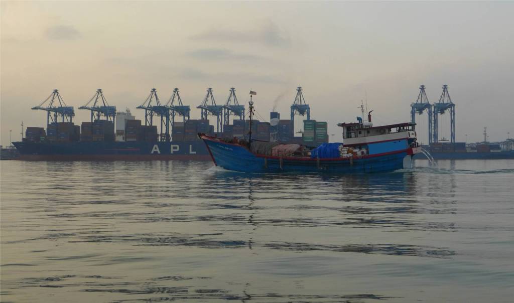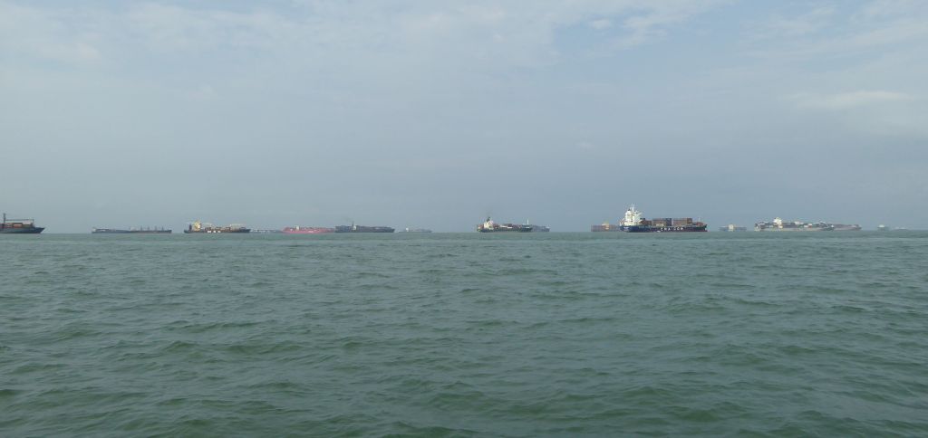 Wir fahren entlang der kilometerlangen vollbesetzten Containerpier und müssen einem indonesischen Frachter ausweichen, der beschlossen hat auf unserer Seite zu fahren. Ein spannender Kontrast: indonesisches Holzschiff mit der Ladung in Säcken, neben vielen modernen großen Containerschiffen. Südlich von Port Klang liegen über 50 Schiffe im Ankerfeld. Der Hafen ist voll, sie warten alle auf ihren Liegeplatz. Wir schlängeln uns zwischen den Ankerliegern hindurch.