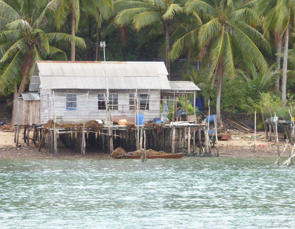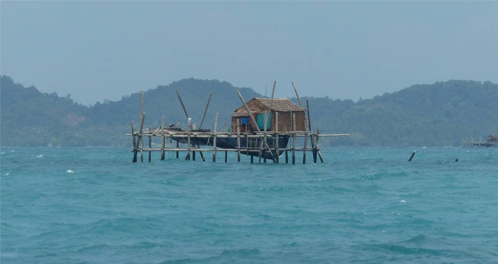 Auf der Fahrt nach Kentar kreuzen wir durch ein Feld mit Fischerhütten. Wir zählen 100! Die Hütten selbst sieht man gut, leider sind zwischen den Hütten lauter Bojen, die nur ab und zu in den Wellen auftauchen und einige einzelne Pfähle in unscheinbarem grau.