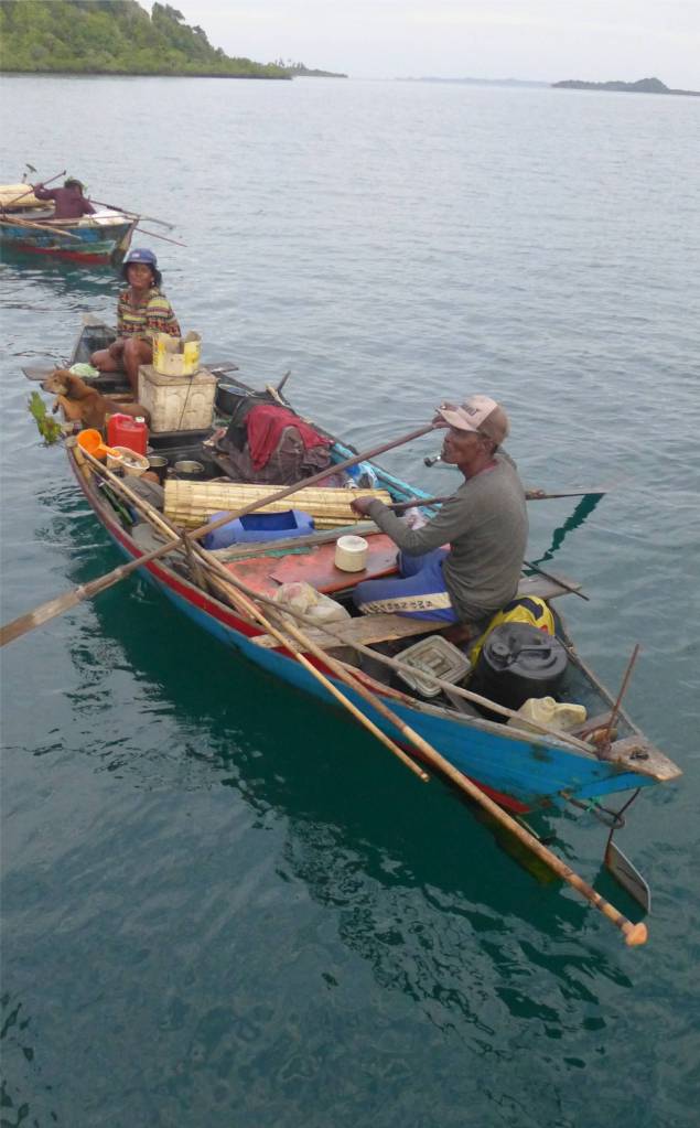 „Inga, wollen wir Fisch haben?“ Keine Ahnung, ich liege mit meinem Krimi noch im Bett, die Sonne ist gerade aufgegangen und Nobbi hat schon Kaffee gekocht. Neben Mari treiben zwei offene Boote, in jedem sitzt ein Paar, mit Hund und Papageien. Wir verstehen einander nicht, sie sprechen kein Indonesisch und kein Englisch. Aber, dass sie gerne Fisch mit uns tauschen möchten, verstehen wir. Nach und nach wird uns klar, dass die Menschen in ihren offenen Booten wohnen, ein offenes Feuer brennt in ihrem Holzboot und auf dem Feuer steht ein Topf. Die wenigen Dinge, die sie besitzen sind im Boot verstaut, Matten aus geflochtenen Palmenblättern sind aufgerollt und liegen quer auf dem Rumpf. Gerne würden wir mehr über ihr Leben erfahren. Einen Handel mögen wir nicht ausschlagen und bieten ihnen eine lange dicke Leine an, doch die Frau schüttelt den Kopf und zeigt auf einen Keks. Sie freuen sich über Oreos. Später ärgern wir uns, dass wir so schlecht vorbereitet waren, sicherlich hätten wir noch etwas gefunden, das wir leicht entbehren können und sie erfreut hätte. So stehe ich morgens um sieben mit einem Tintenfisch in jeder Hand an Deck. Zeit für Kaffee!