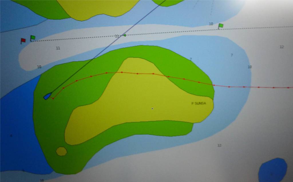 Nobbi fragt mich, ob ich nicht langsam mal in die Einfahrt einbiegen wolle. Ich verstehe ihn nicht, sieht doch alles super aus. Laut der Seekarte am Bord PC fahren wir nicht nur übers Riff, sondern mitten über die Insel. Die Karten auf Plotter und Tablett scheinen richtig zu sein. Kein Wunder, dass Nobbi nervös wurde. Nervös bin ich auch. Die Welle, die uns auf die kleine Insel zuschiebt, hinter der wir ankern wollen, ist steil und hoch. Danach wird es ruhiger. Am Ankerplatz liegt ein Fischernetz, wir finden noch davor einen Platz. Der starke Strom dreht uns so, dass wir mit dem Heck zum Schwell liegen und der Wind von der Seite kommt. In der Einfahrt brechen sich inzwischen die Wellen. Kein so ganz gemütlicher Platz. Abends lässt der Wind nach und der Strom kentert. Wir haben eine recht ruhige Nacht und trotzdem keine große Lust hier zu bleiben.