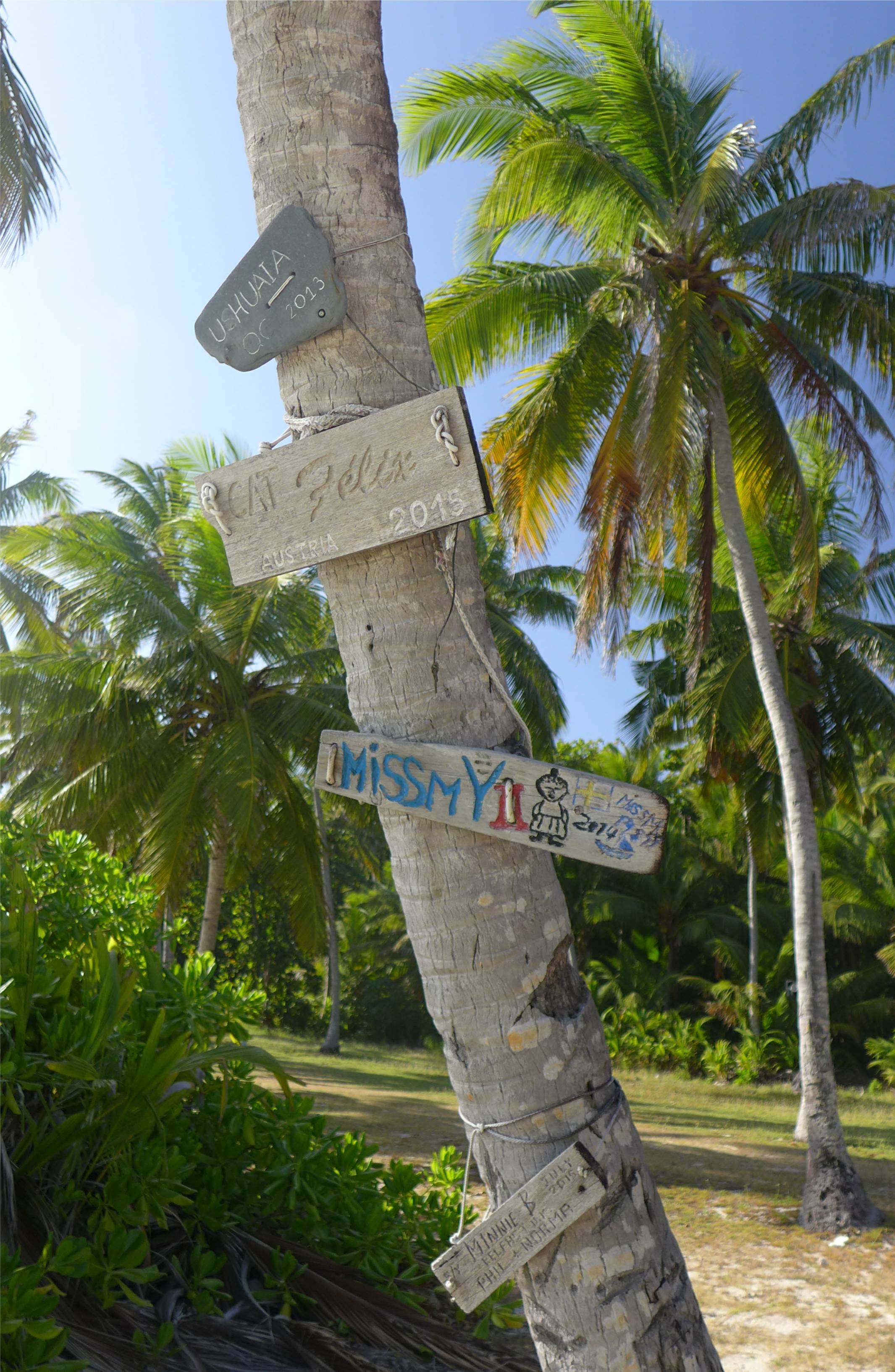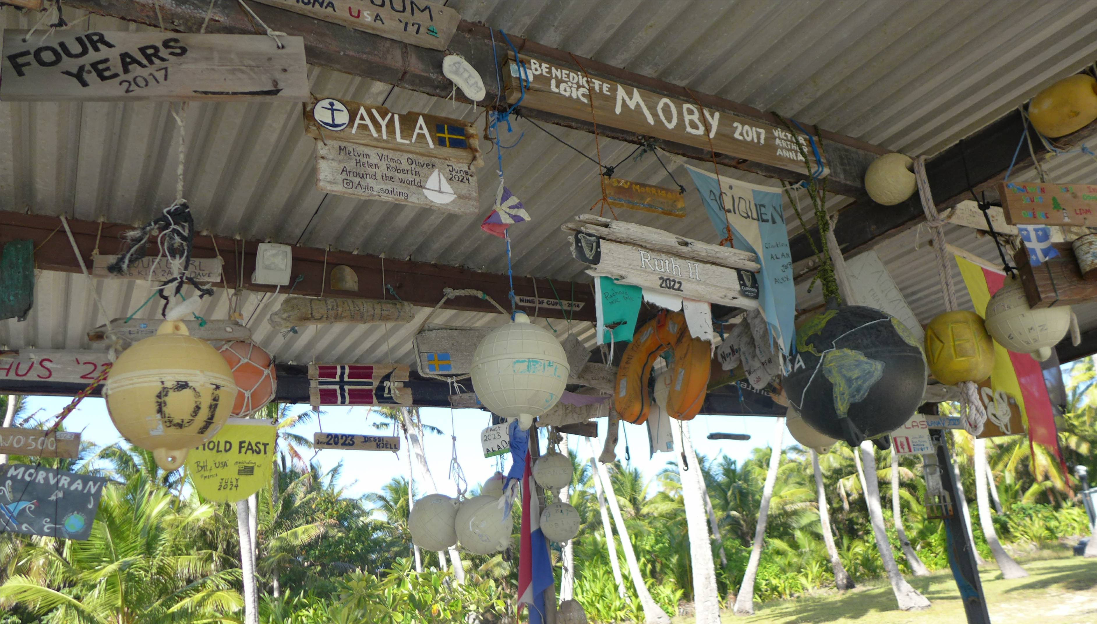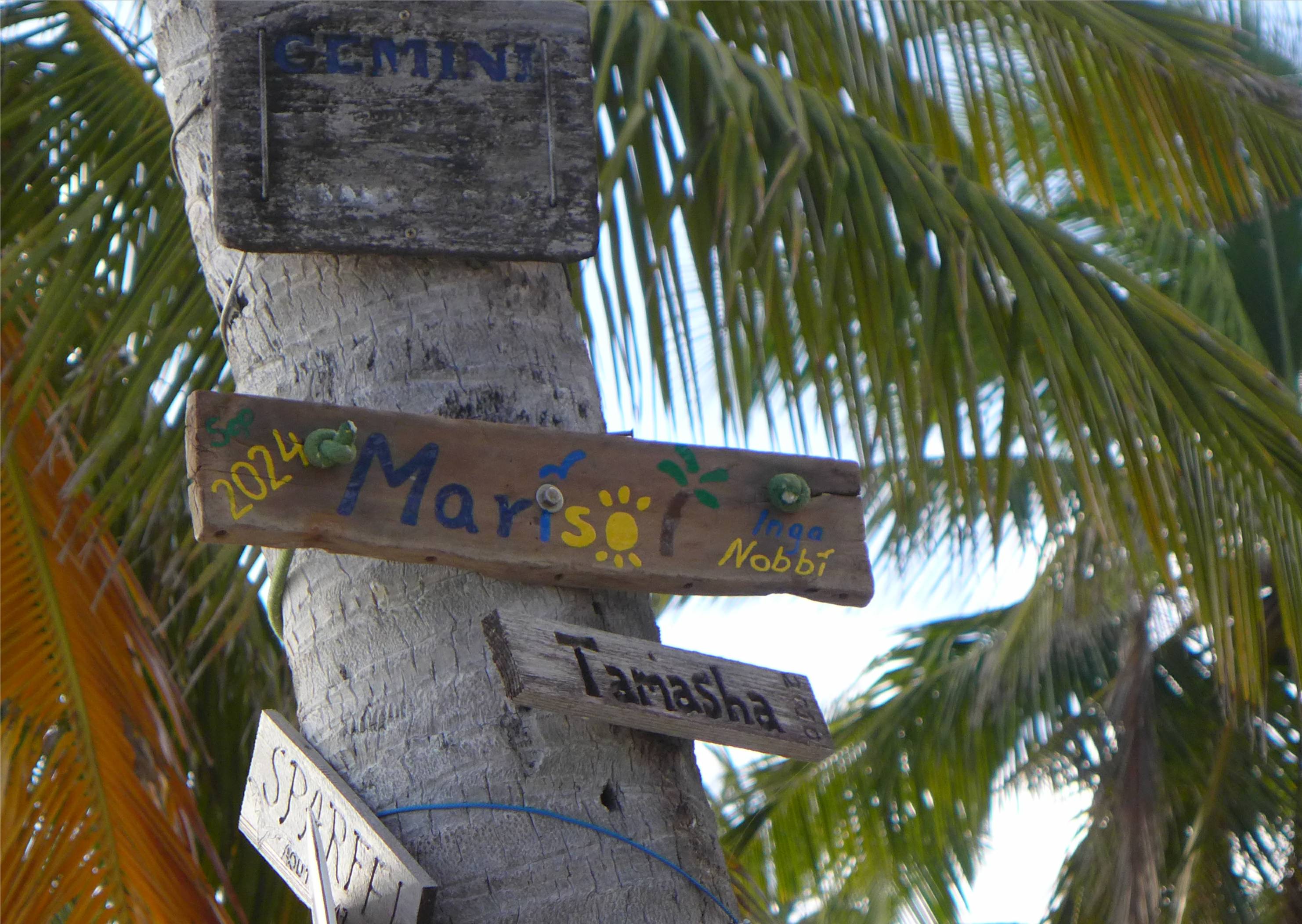 An einigen Orten ist es Tradition, dass Segler sich verewigen. Hier auf Cocos ist es üblich ein Schild mit dem Namen des Bootes zu malen und es an einer Palme oder am Yacht Club aufzuhängen. Die Bezeichnung Yacht Club könnte falsche Assoziationen wecken, es handelt sich um einen überdachten Sitzplatz mit Beleuchtung und einem großen Wassertank, in dem Regenwasser gesammelt wird.