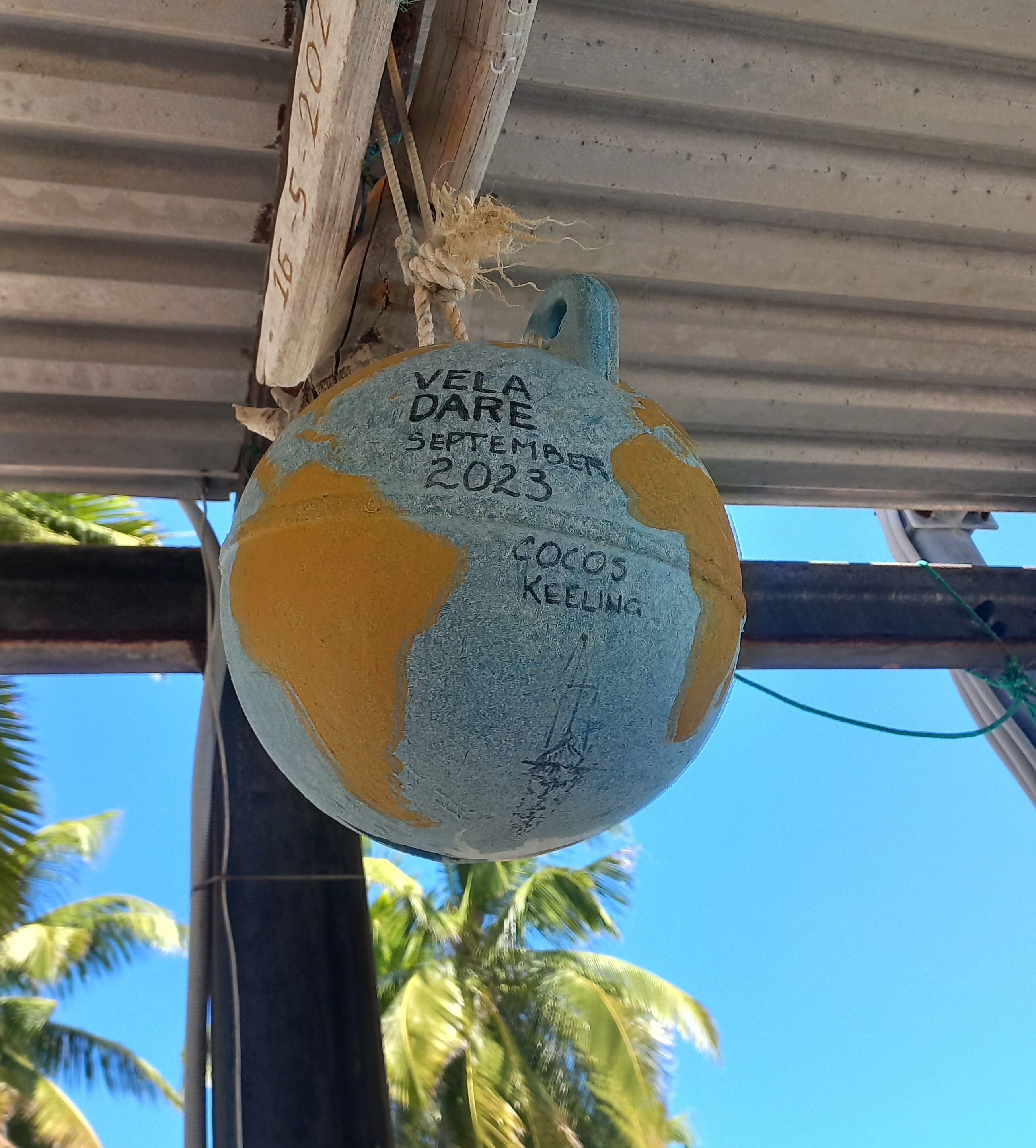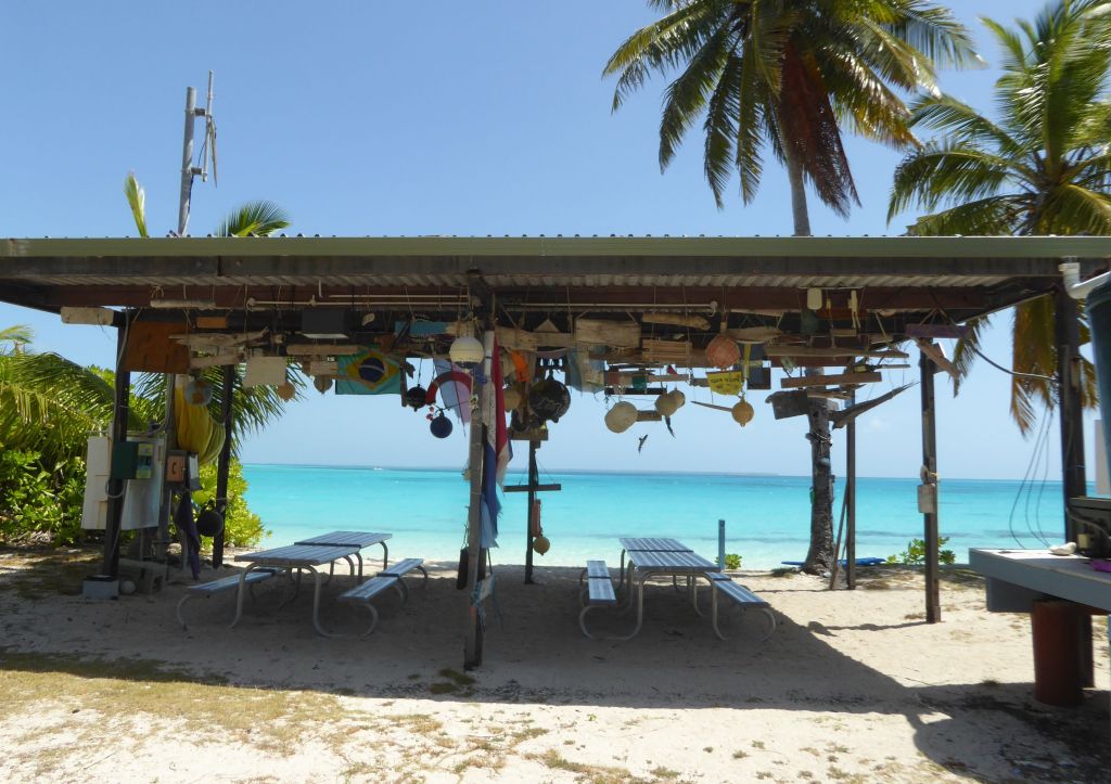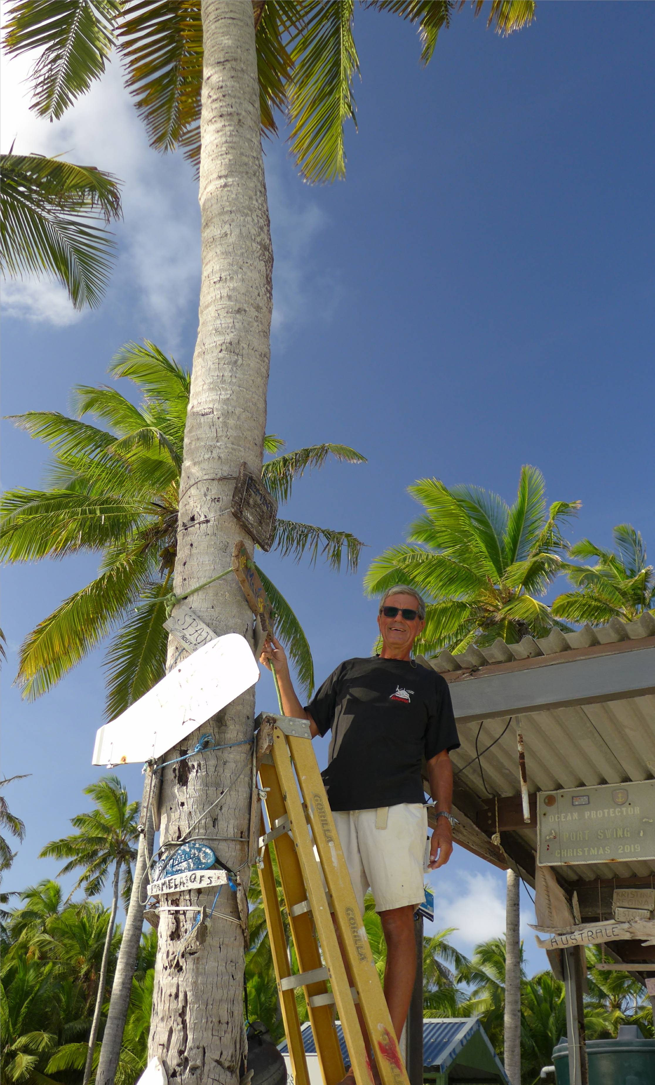 An einigen Orten ist es Tradition, dass Segler sich verewigen. Hier auf Cocos ist es üblich ein Schild mit dem Namen des Bootes zu malen und es an einer Palme oder am Yacht Club aufzuhängen. Die Bezeichnung Yacht Club könnte falsche Assoziationen wecken, es handelt sich um einen überdachten Sitzplatz mit Beleuchtung und einem großen Wassertank, in dem Regenwasser gesammelt wird.
