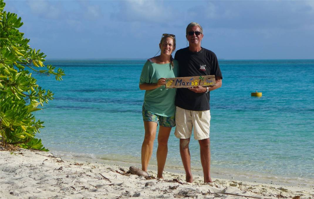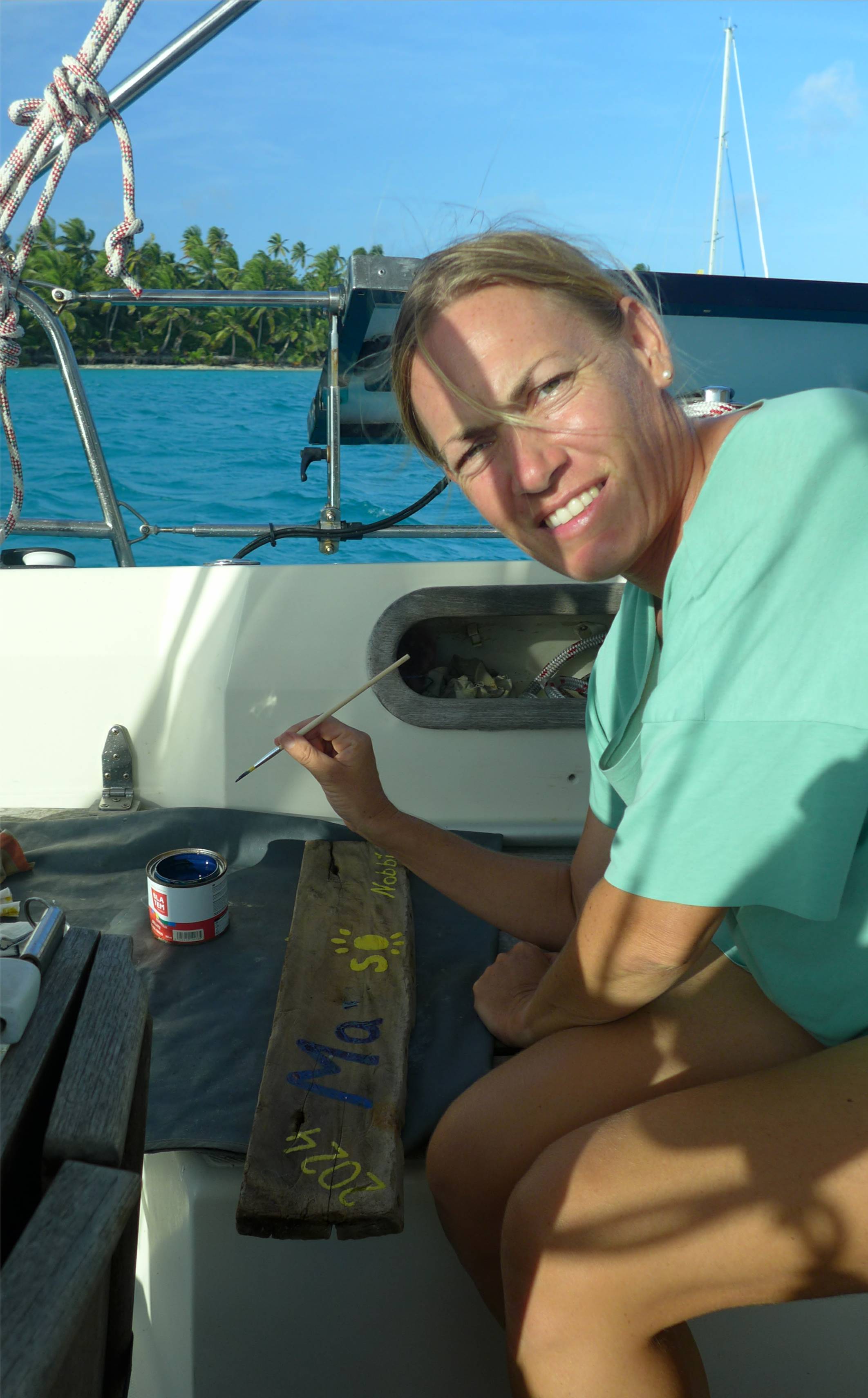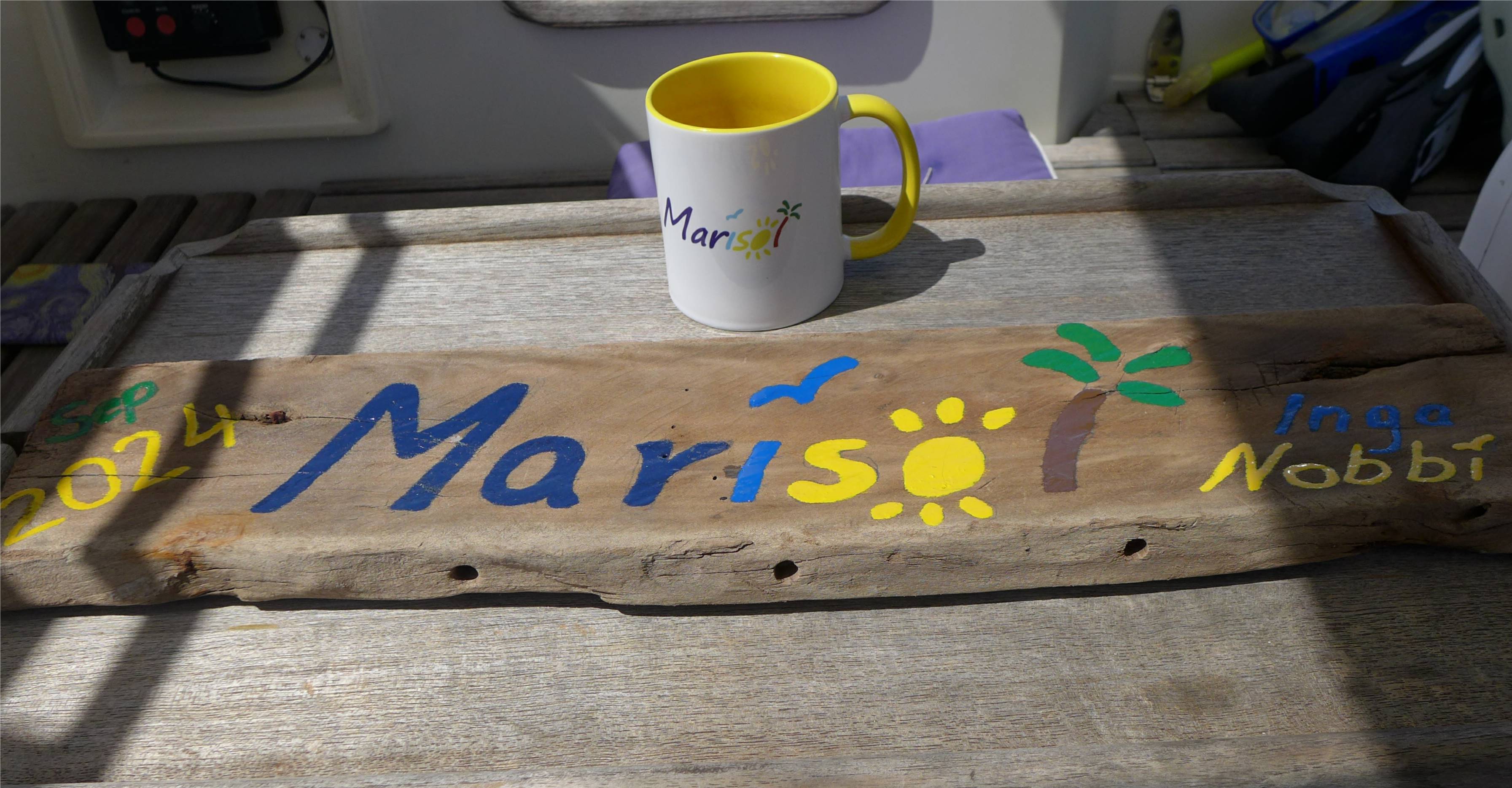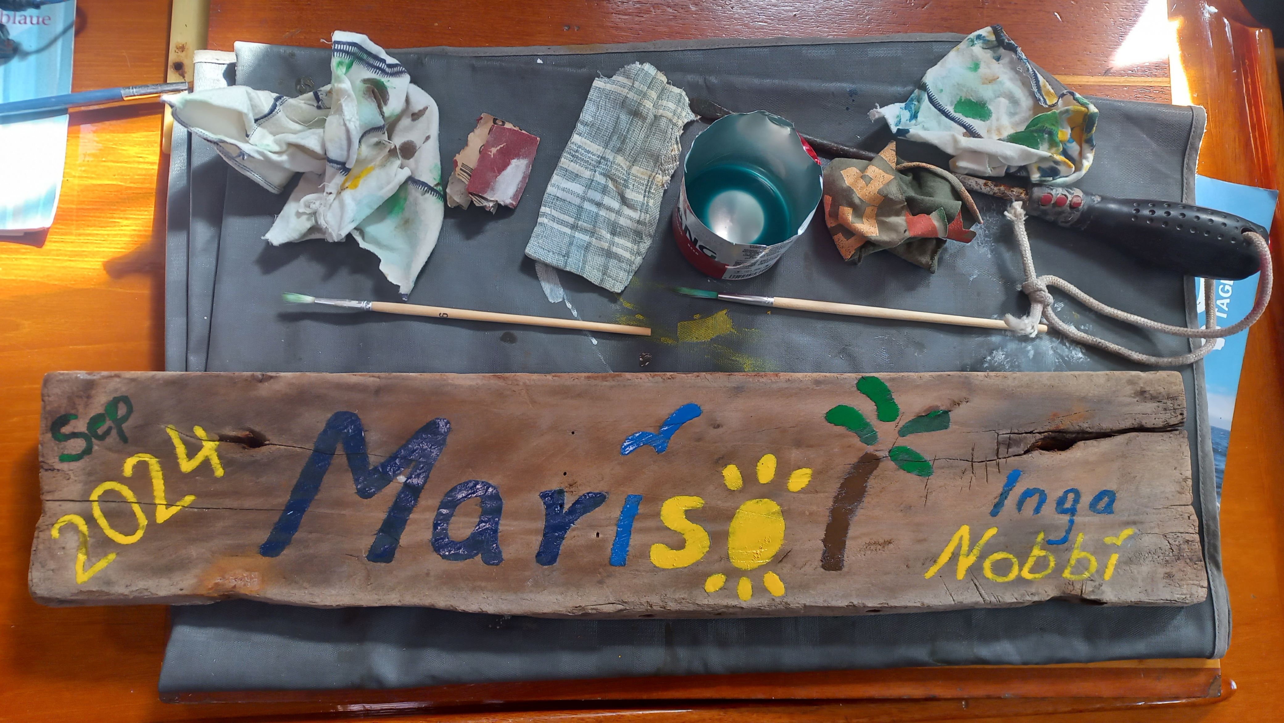 Natürlich werden auch wir aktiv und ich bemale ein Stück Holz mit dem Marisol Schriftzug. Mir macht es Spaß, auch wenn ich immer etwas Angst davor habe eventuell eine Farbdose umzukippen. Alle fünf Farben kommen zweimal zum Einsatz und so bin ich einige Tage immer wieder beschäftigt. Um unser Schild aufzuhängen leihen wir uns eine Leiter bei einer kleinen Baustelle. Nobbi hat neben einem Schraubbolzen auch eine Unterlegscheibe, einen Akkuschrauber, Bohrer, einige Leinen und Bändsel und noch weiteren Kleinkram eingepackt und so hängt unser Schild nun weit oben an einer Palme.