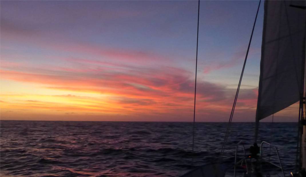 Nach dem vorangegangenen windigen Teil der Passage sind diese ruhigen Tage eine nette Abwechslung. Teilweise haben wir nur noch knappe 3Bft. Von achtern ist das auf dem Ozean ein bisschen wenig. Wir können geradeso segeln. Wir baumen die Fock aus, mal an Steuerbord, mal an Backbord und rollen sie etwas ein, Hauptsache sie schlägt nicht. Das nervt und macht das Segel kaputt.