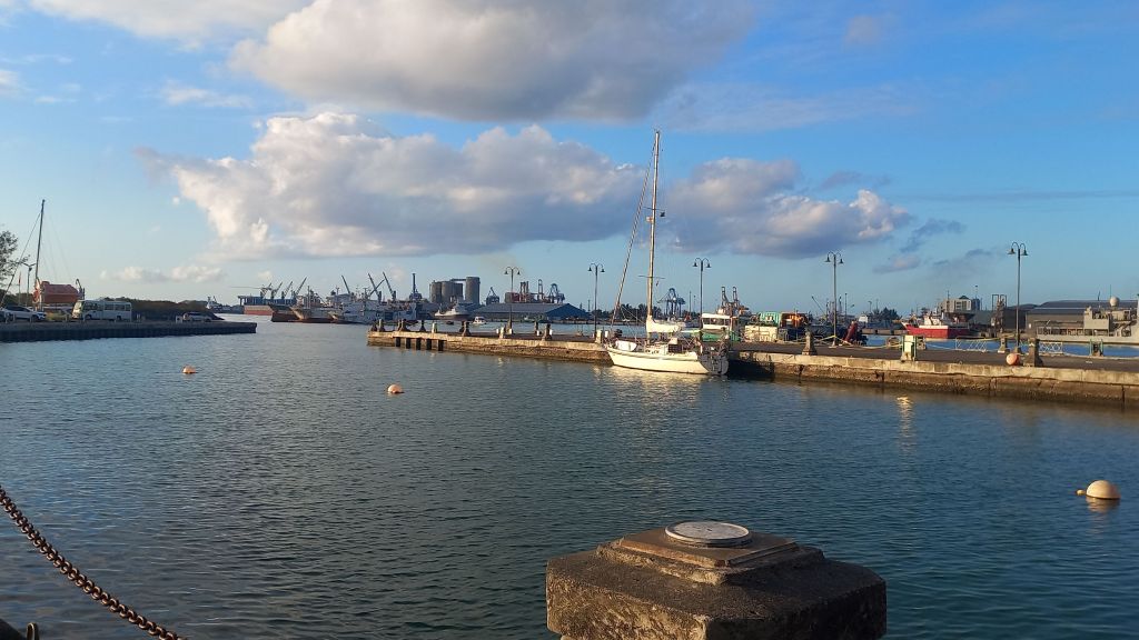 Uns gefällt der Platz mitten in der Stadt, auch wenn viel Dreck an Deck geweht wird und an einem Morgen mehrere Betonmischer auf der Pier stehen. Gelegentlich schickt ein Schlepper etwas Schwell, der trifft aber vor allem die andere Seite des Hafenbeckens. Zwischen 18 und 6 Uhr dürfen Schiffe weder ein noch auslaufen, so dass es nachts nur ganz selten ein paar Wellen gibt. Bei Niedrigwasser könnte Mari mit der Scherleiste unter eine Betonkante an der Pier geraten. Das gilt es zu verhindern. Ich habe einen geeigneten Autoreifen entdeckt und Nobbi dazu angestiftet, für diesen eine „Ortsveränderung“ zu organisieren damit wir mehr Abstand zur Pier wahren.