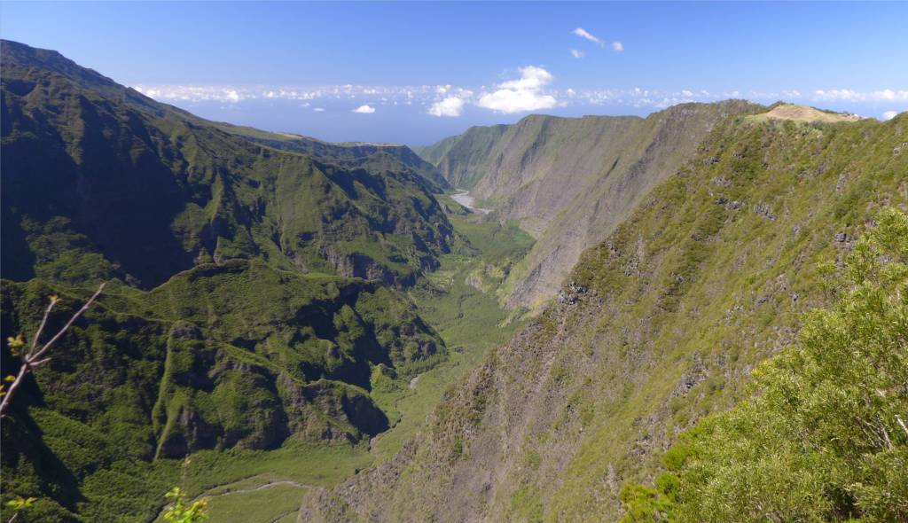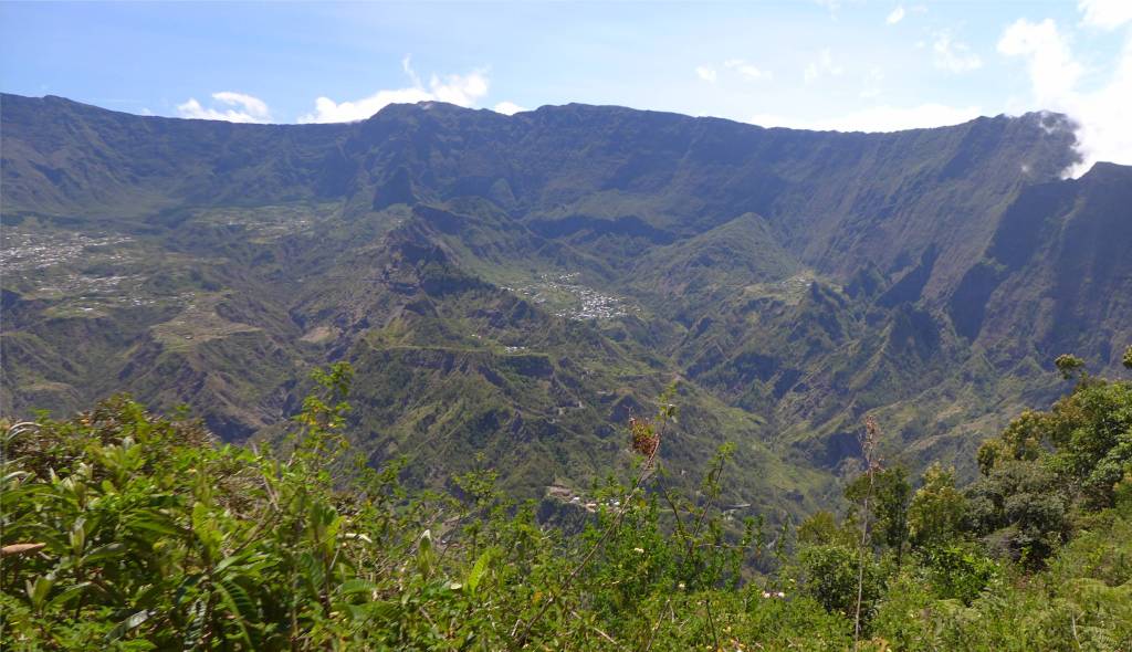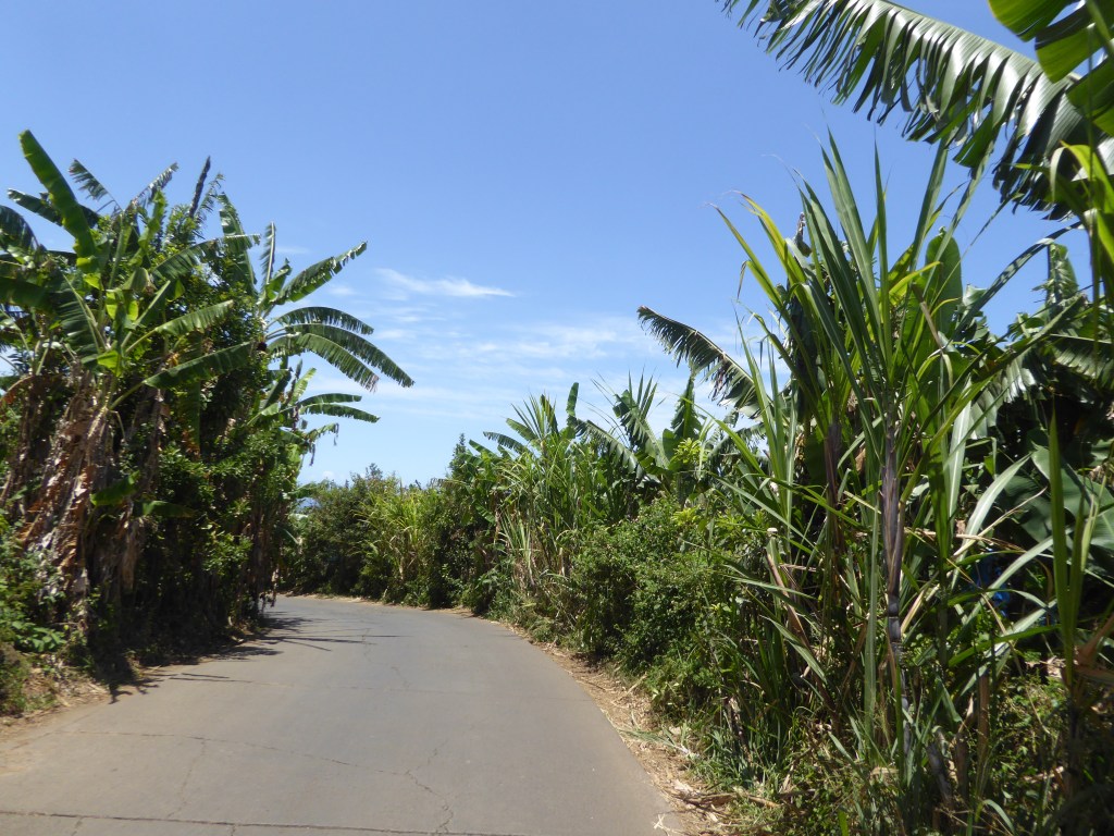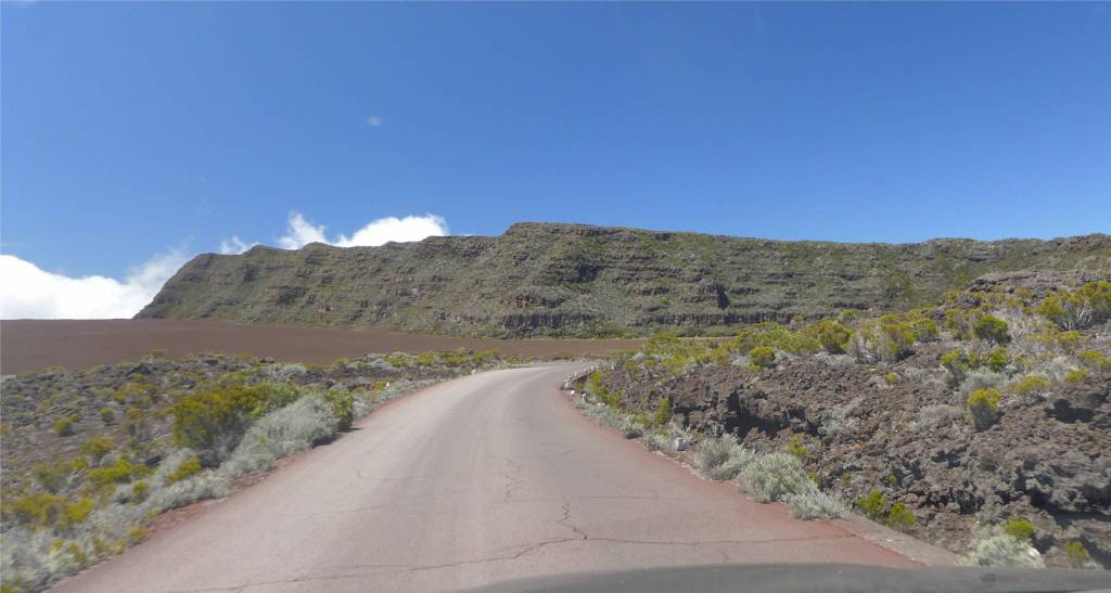 Wir fahren zunächst zum „Fenêtre des Makes“ auf 1504m bevor wir zu den sich ewig in kleinen Serpentinen windenden einsamen Straße kommen, nehmen wir eine „Abkürzung“ durch Zuckerrohr und Bananenplantagen. Es ist viel Verkehr in beide Richtungen, auf einer einspurigen Straße. Vor uns biegt ein großer Zucker-Laster ein, wir heften uns an seine Reifen und kommen so ganz hervorragend durch das Gewirr schmaler Wirtschaftswege. Das „Fenêtre“ wartet mit einer fantastischen Ausicht auf den „Cirque de Cilaos“ und den Piton des Neiges auf. Auch die zweite Caldera des Piton des Neiges ist beeindruckend und es gibt sogar noch eine dritte ähnlich spektakuläre. Der Piton de Neige ist mit 3070m der höchste Berg La Réunions und des Indischen Ozean. Trotz seines Namens ist er schneelos.