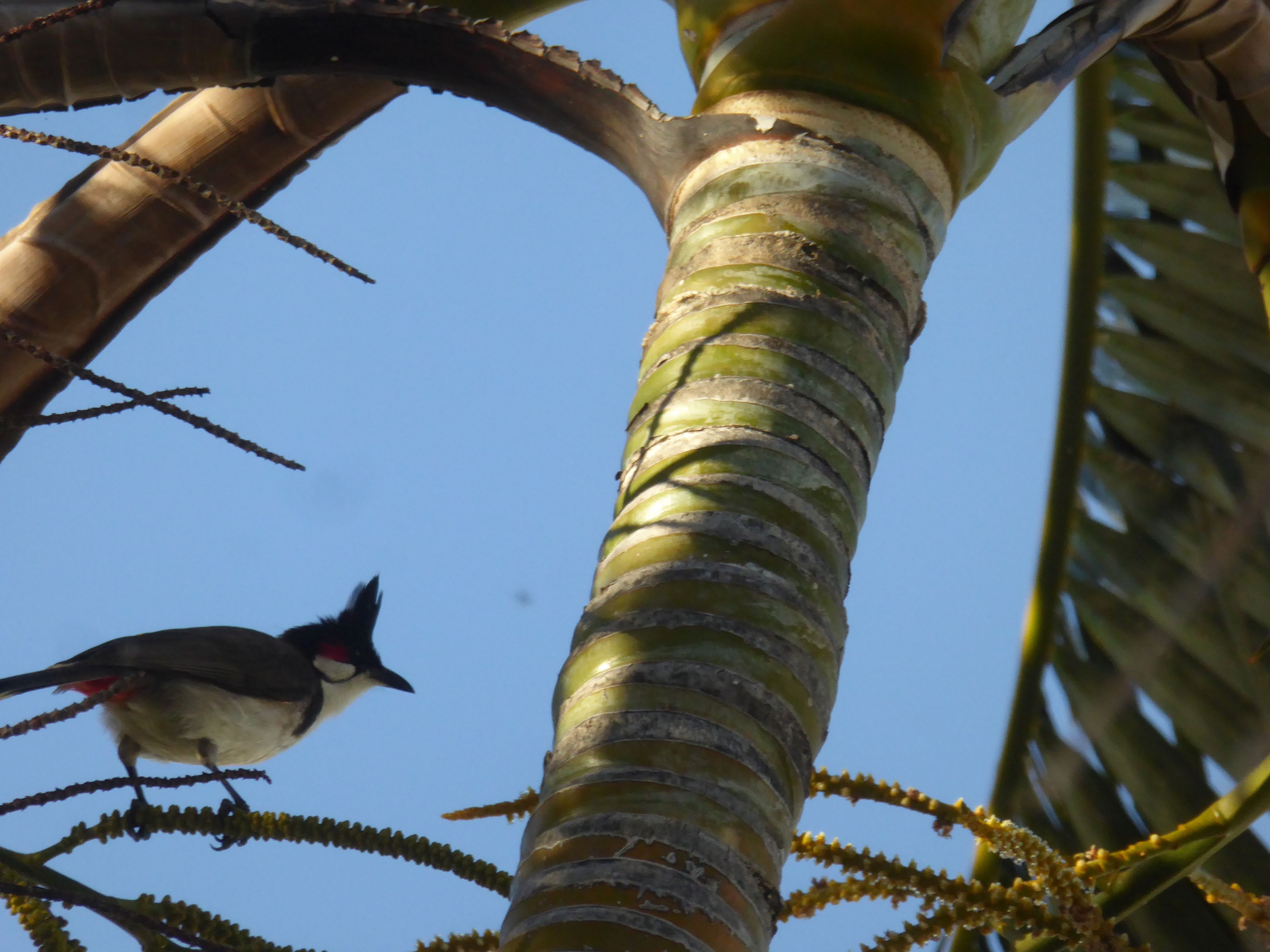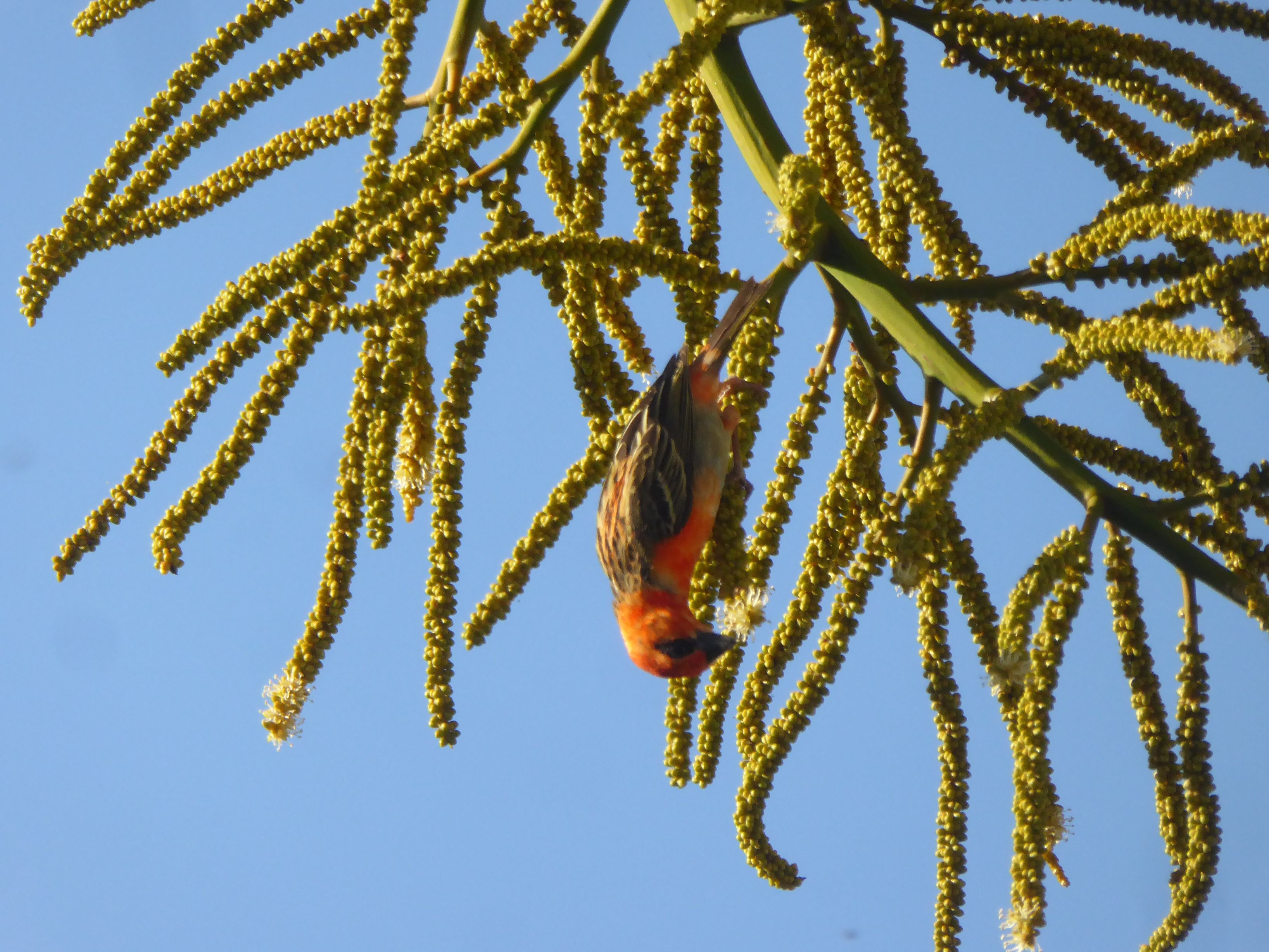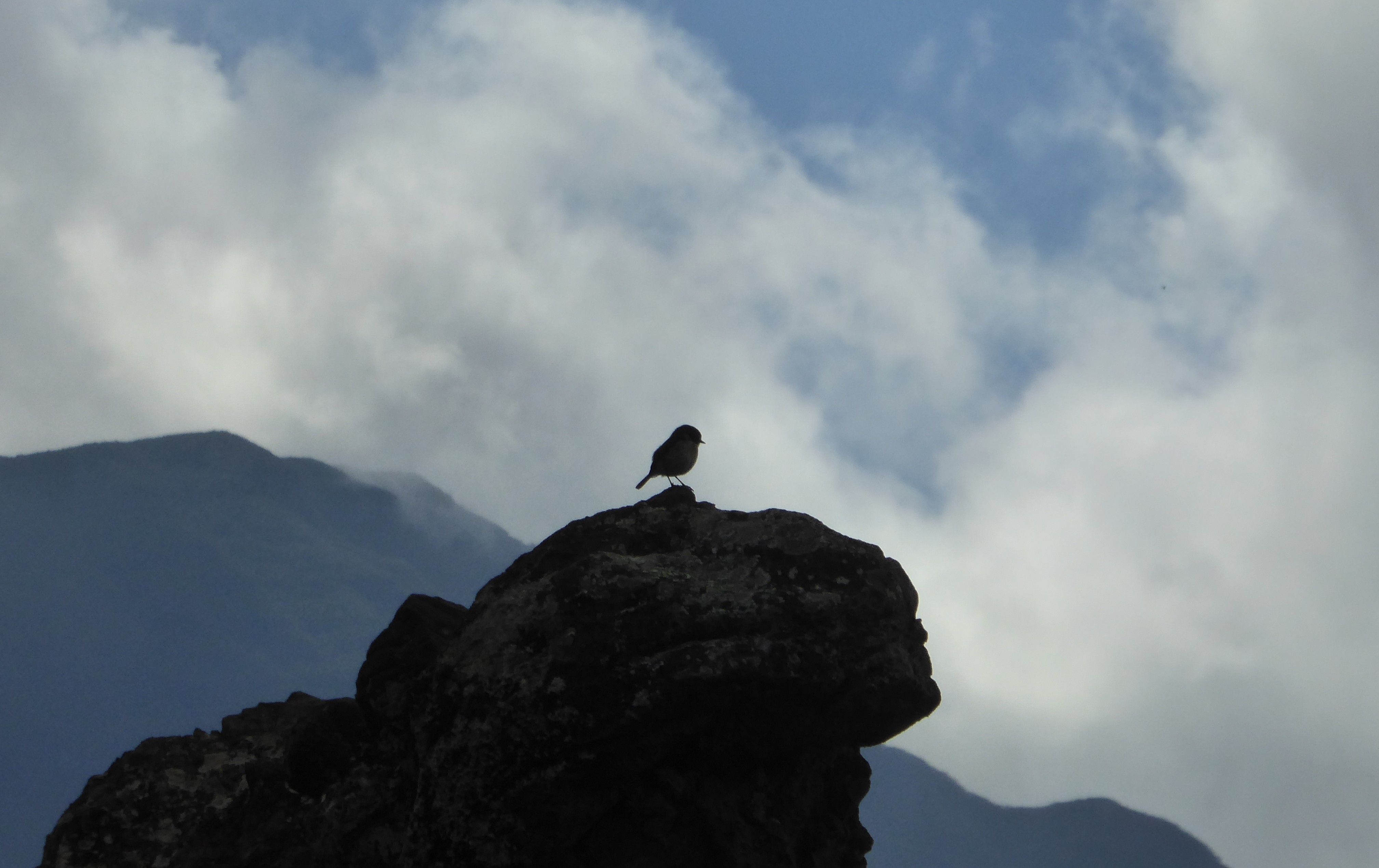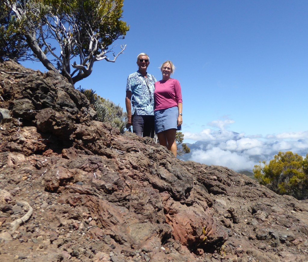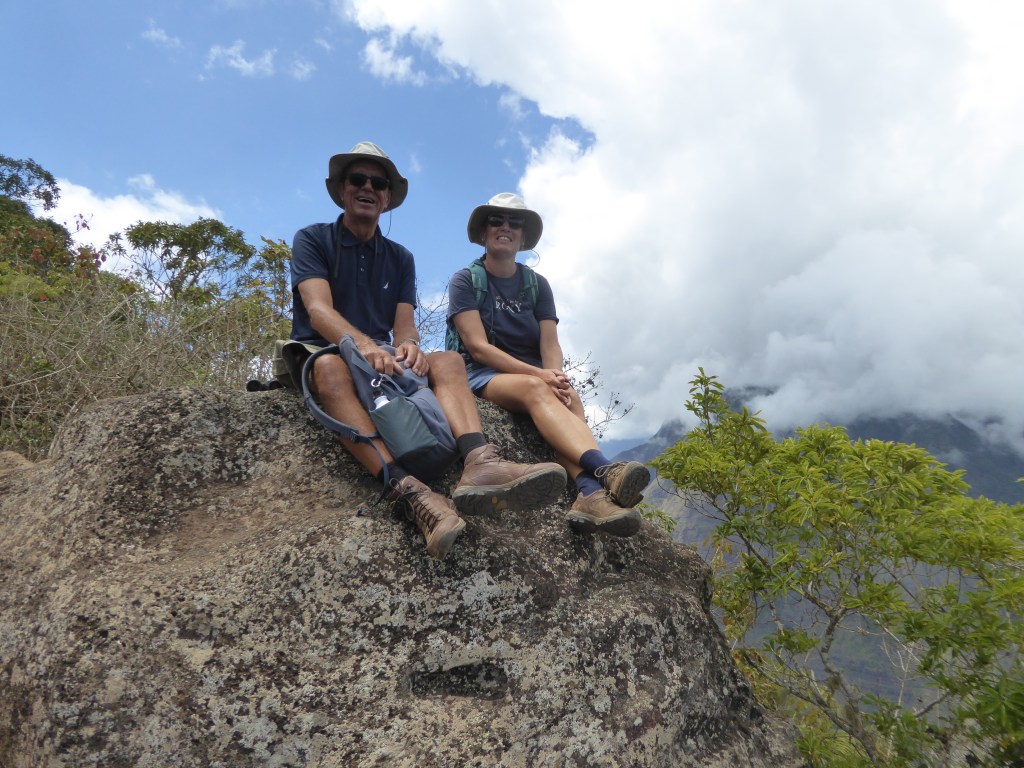 Von der Haltstelle zum Ausgangspunkt der Wanderung laufen wir 20 Minuten. Wir brauchen ein bisschen länger, weil wir die Webervögel mit ihren kunstvollen Nestern ausgiebig beobachten. Die ausgewählte Wanderung beginnt auf 1100 m, bringt uns auf 1300m und ist recht sportlich, einige Leitern und ein Draht zum Festhalten helfen uns über die ganz steilen Abschnitte. Die Mühen werden belohnt. Der Blick über den „Cirque de Mafate“, eine der drei Calderas des Piton des Neiges, ist beeindruckend. Einige der Dörfer in der Caldera sind bis heute nur zu Fuß erreichbar, kein Wunder bei dieser außergewöhnlichen Geografie. Die Wanderung folgt einem schmalen Grat und wir finden eine Bank mit Aussicht für unser Frühstück. Auf dem Rückweg ziehen nicht nur Wolken auf, auch die Anzahl der Wanderer nimmt stark zu. Gut, dass wir so früh unterwegs waren. Dies war sicher eine der schönsten Wanderungen, die wir bisher unternommen haben!