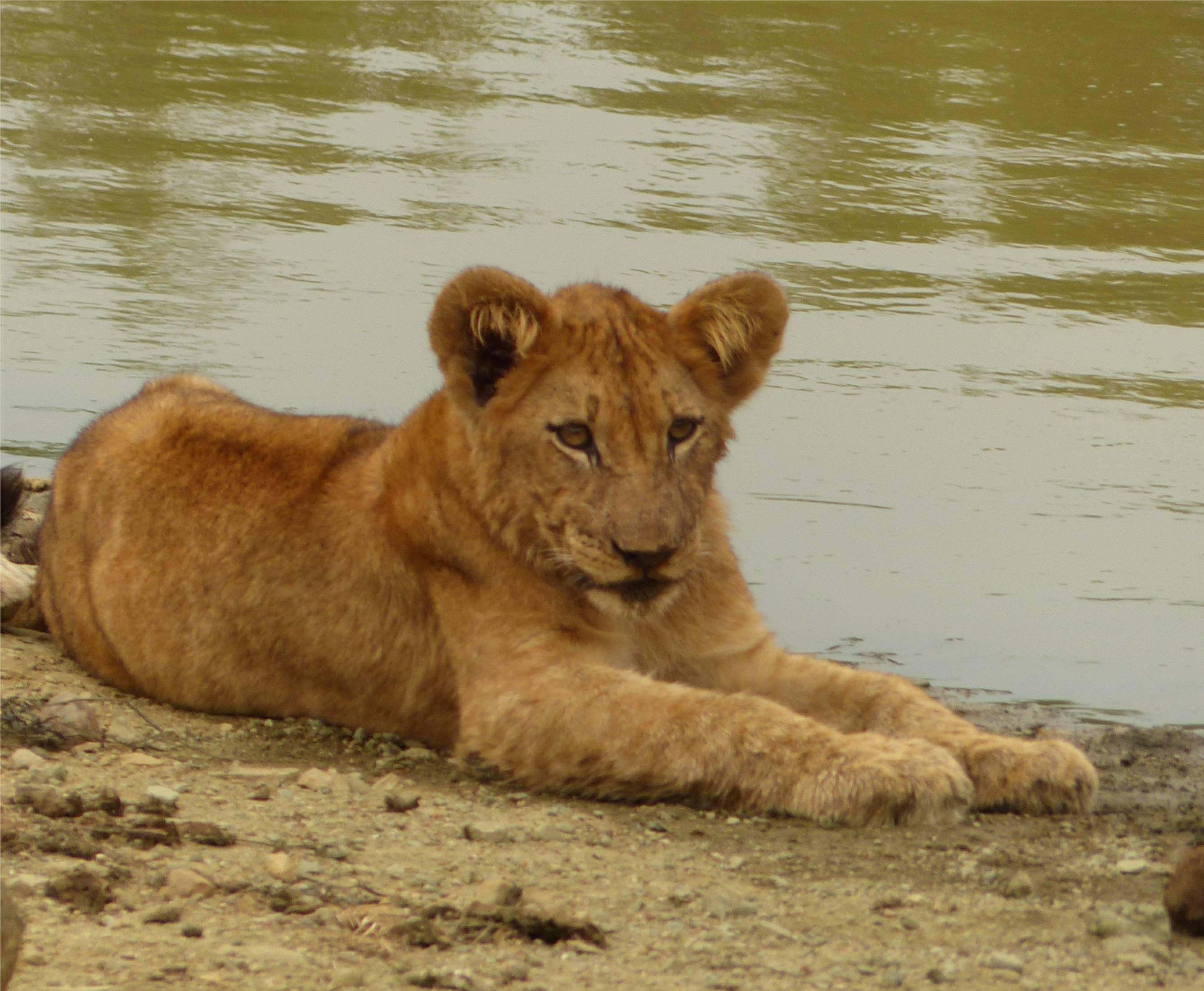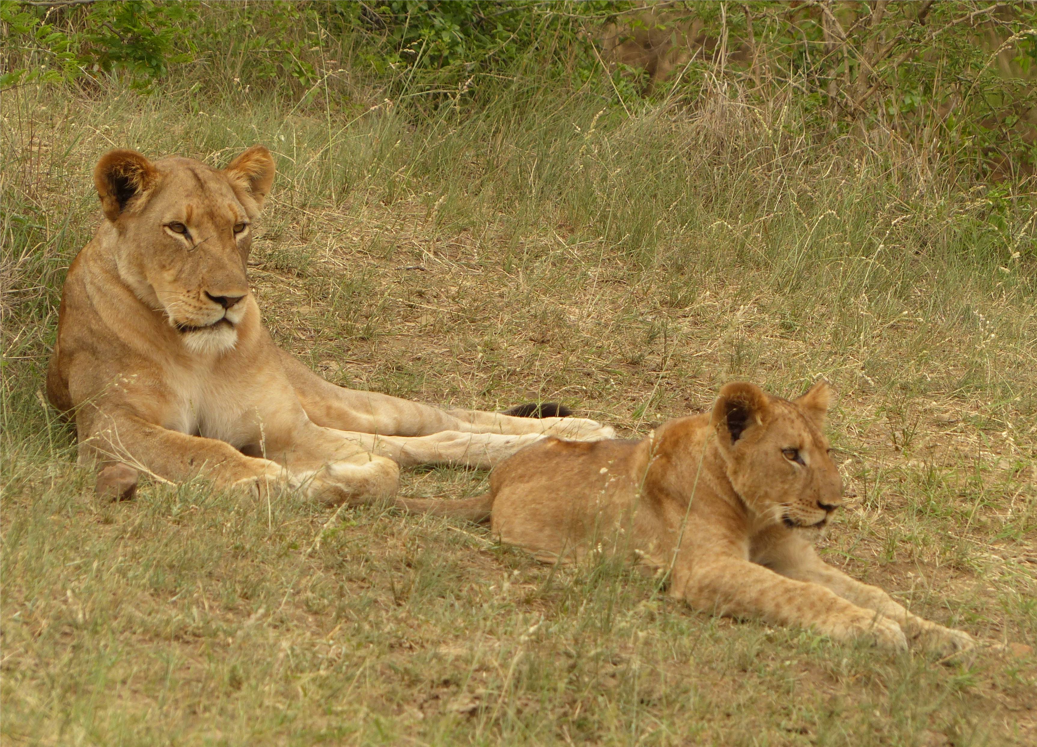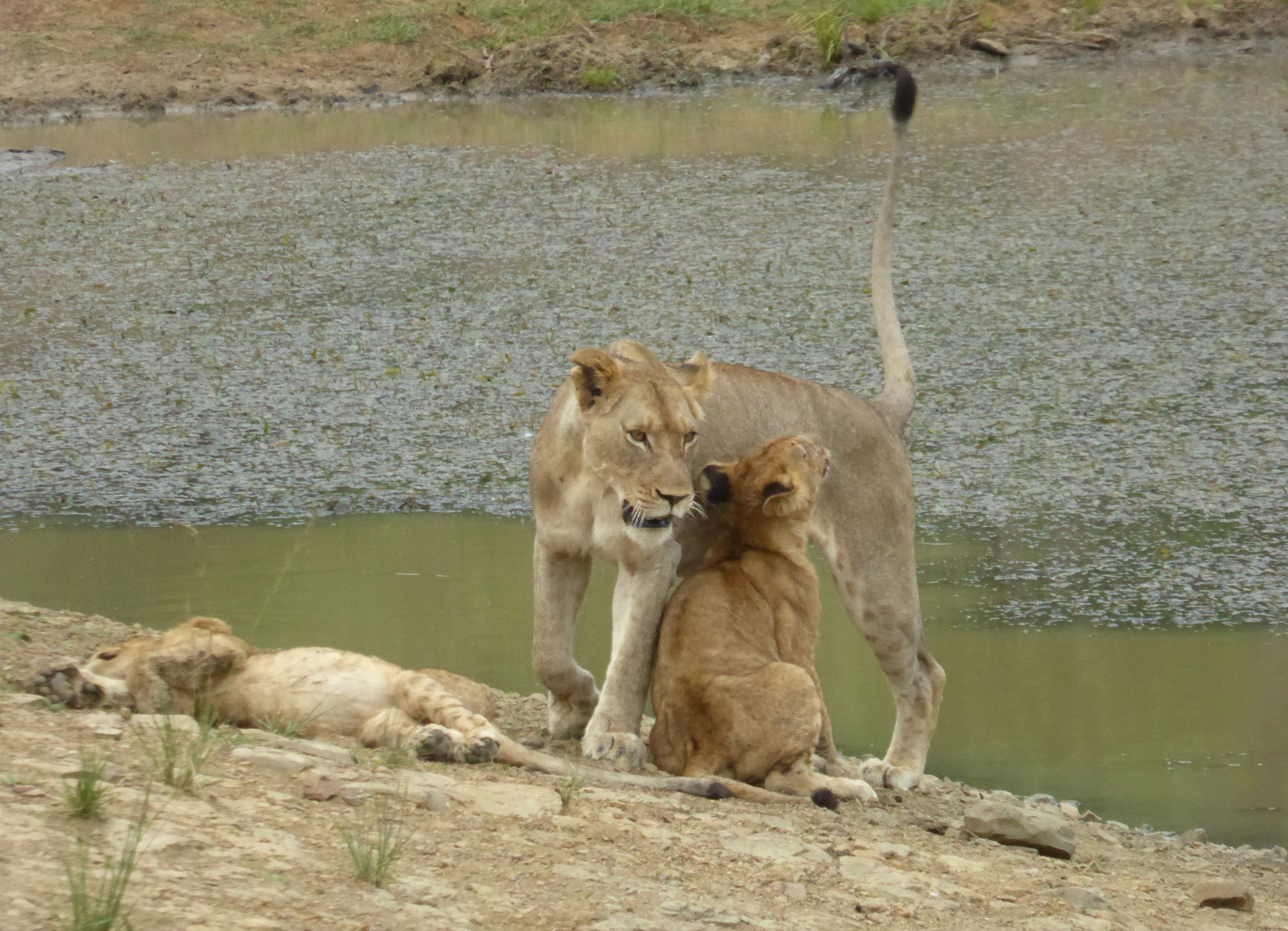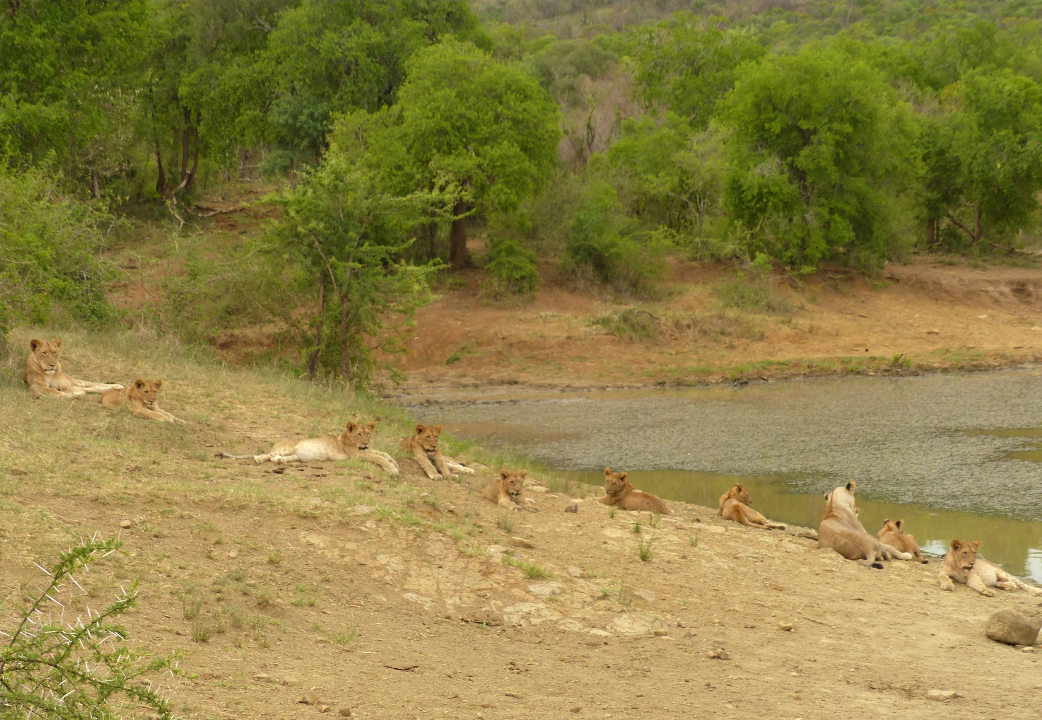 - Elf Löwen (zwei Mütter mit acht Jungen und der Tante) liegen im Gras am Wasserloch und lassen sich nicht von uns stören.