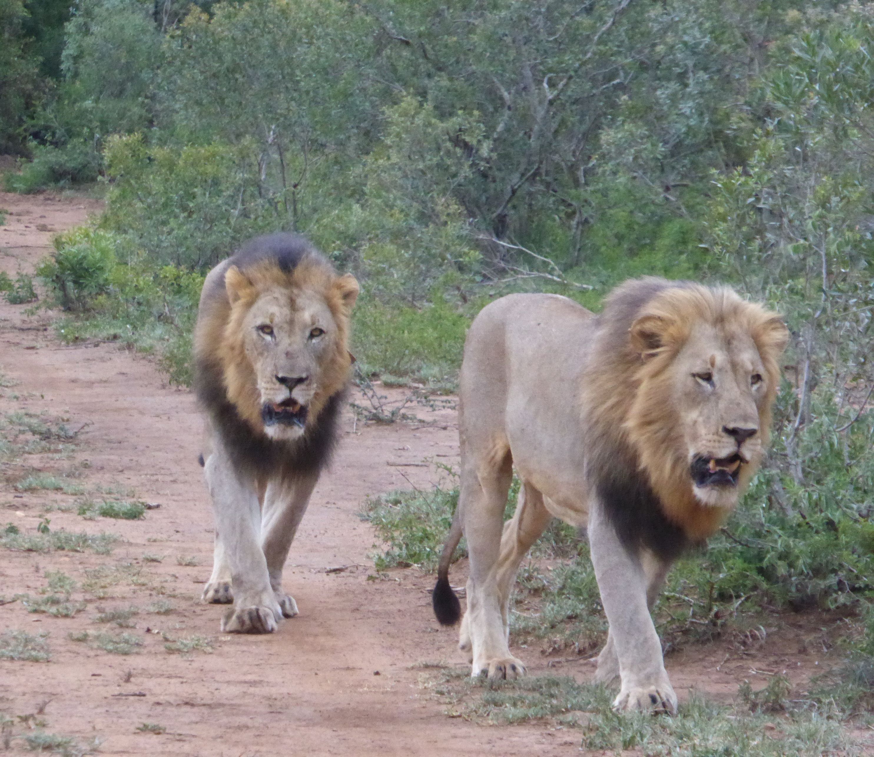 - Zwei Löwen-Männer sind gemächlich unterwegs und völlig unbeeindruckt von den menschlichen Beobachtern an uns vorbei getrottet.