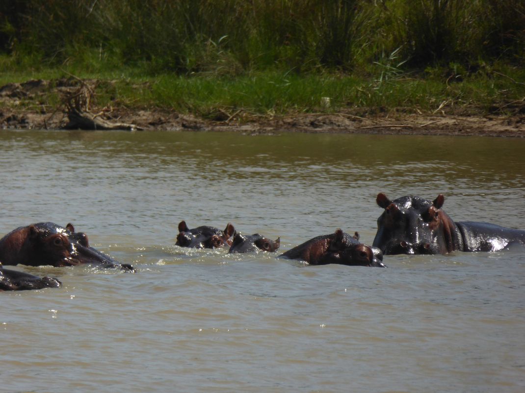 Wir stehen zeitig auf, fahren zum kleinen Ort St.Lucia und frühstücken an der Heckklappe unseres Mietwagens, bevor es um kurz nach acht zu unserer Bootstour geht. Auf einer Art Floß mit Außenbordmotor besuchen wir die Nilpferde. Von der Suche nach den Hippopotamus kann nicht die Rede sein. Man muss sie nicht suchen. Sie sind überall. Eine Mutter mit Baby, eine Gruppe aus fünf Halbstarken und zwei große Familien. Außerdem sehen wir Krokodile und viele Vögel wie ein Seeadler-Pärchen und den schönen „bee-eater“, der es heute nicht auf Bienen sondern die dicken Flusspferd-Fliegen abgesehen hat.