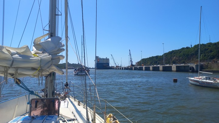 Um halb sechs gibt’s Kaffee und wir segeln langsam nach East London. Es gibt keinen Grund sich zu beeilen. Der Morgen ist wunderschön: schwacher Wind und goldenes Licht. Hunderte Delfine begrüßen uns in der Einfahrt. Leider haben wir wenig Zeit ihren Besuch zu genießen, Port Control möchte, dass wir uns beeilen. Hinter uns läuft ein Autotransporter ein.