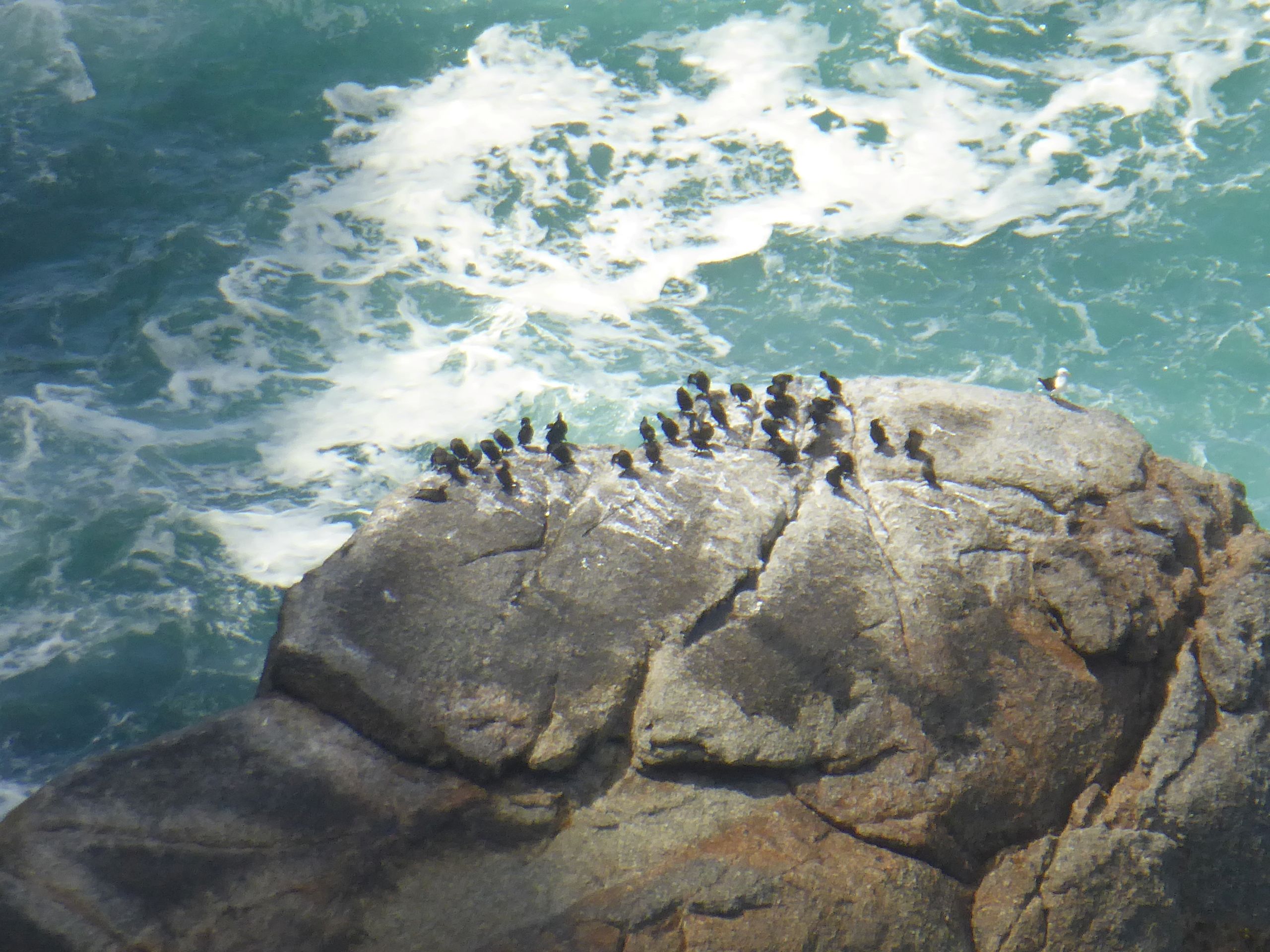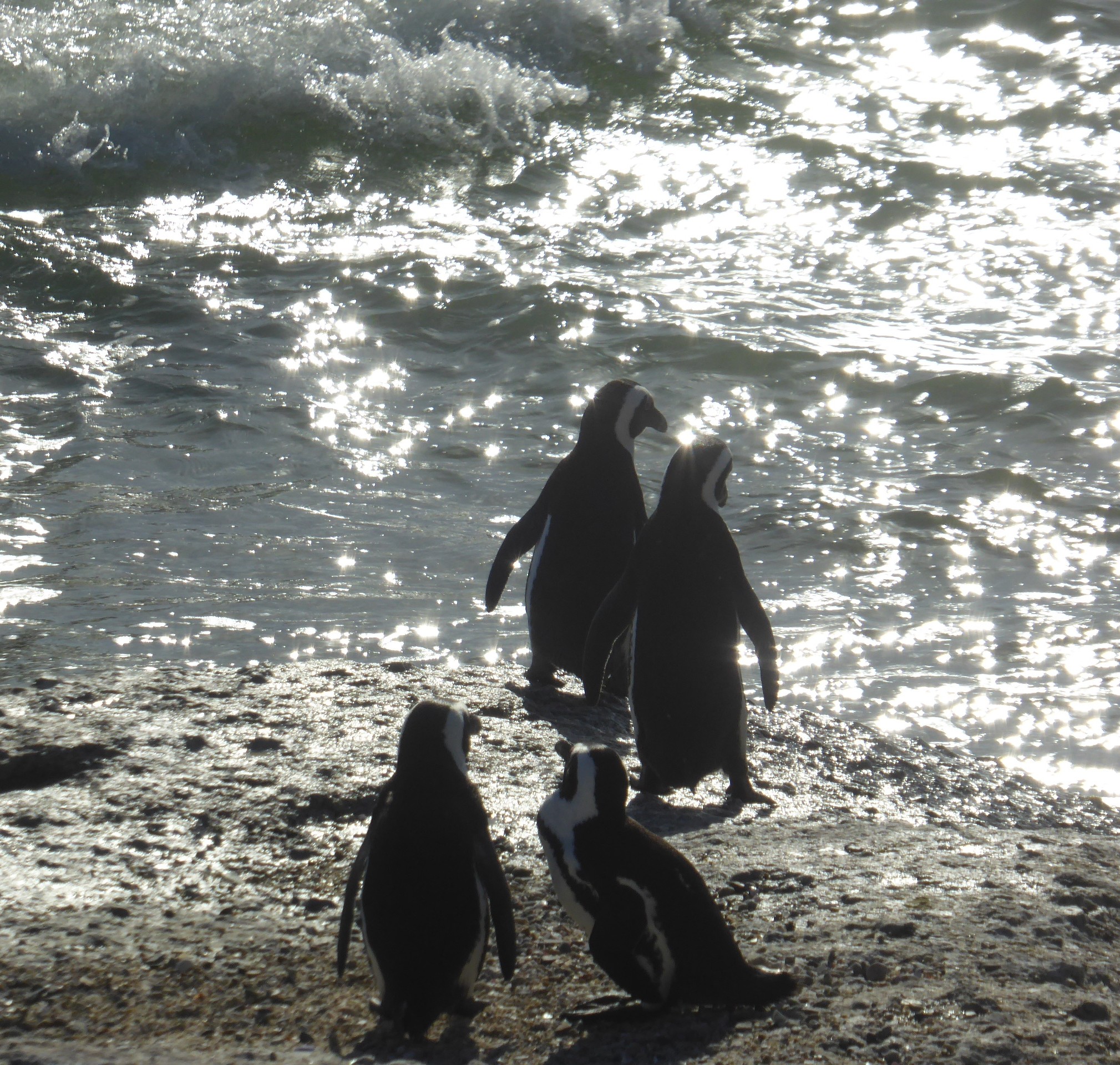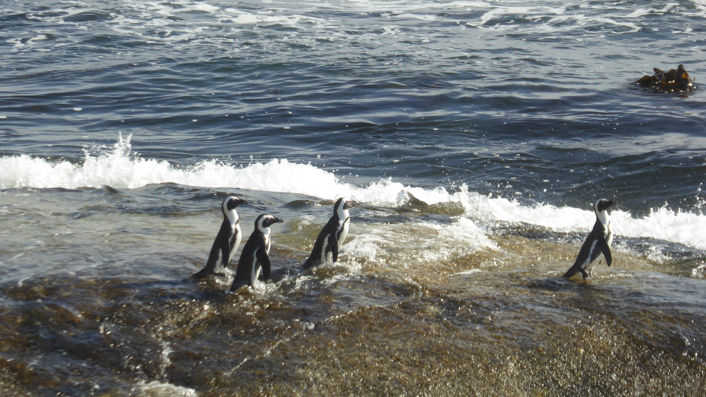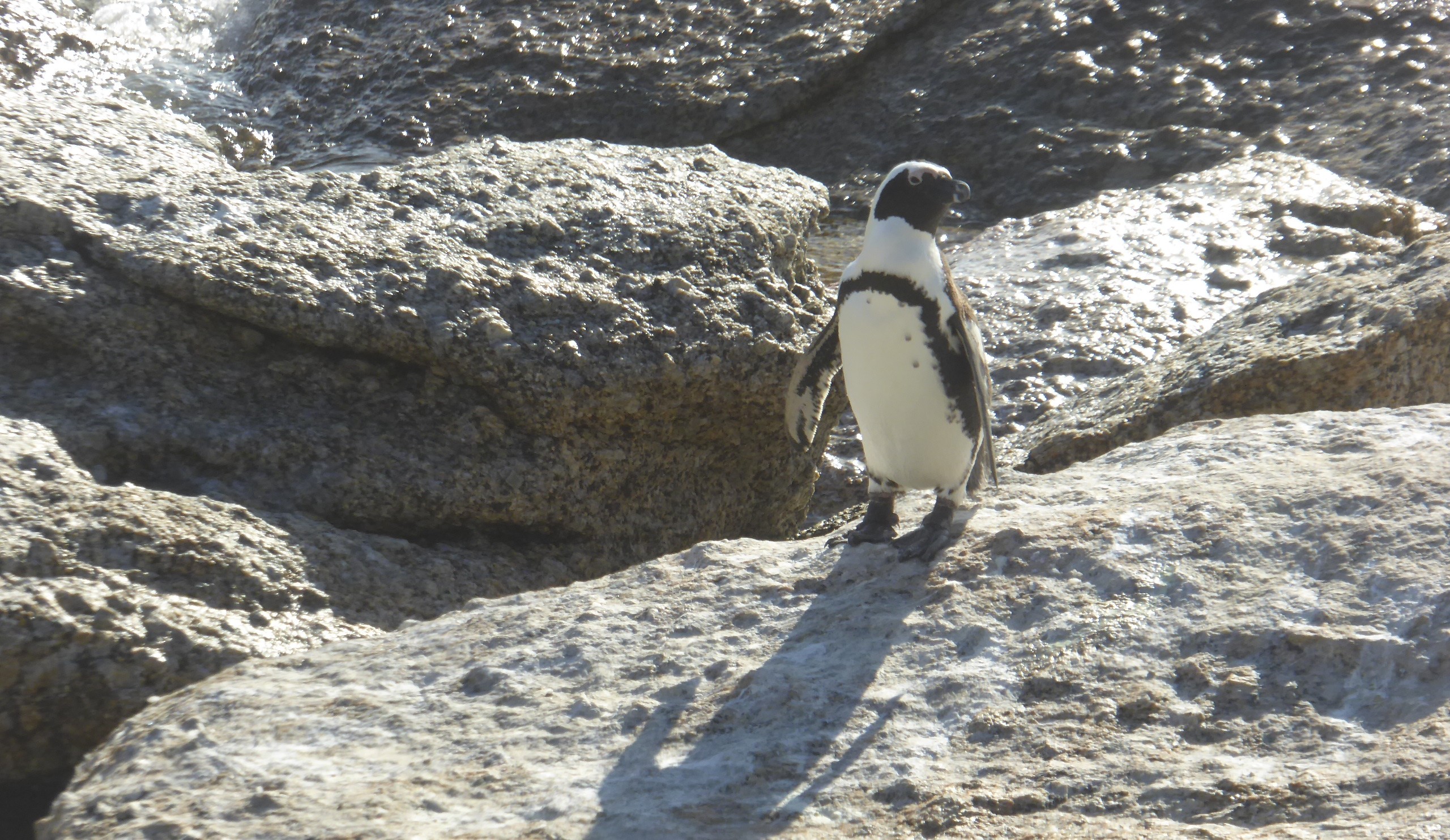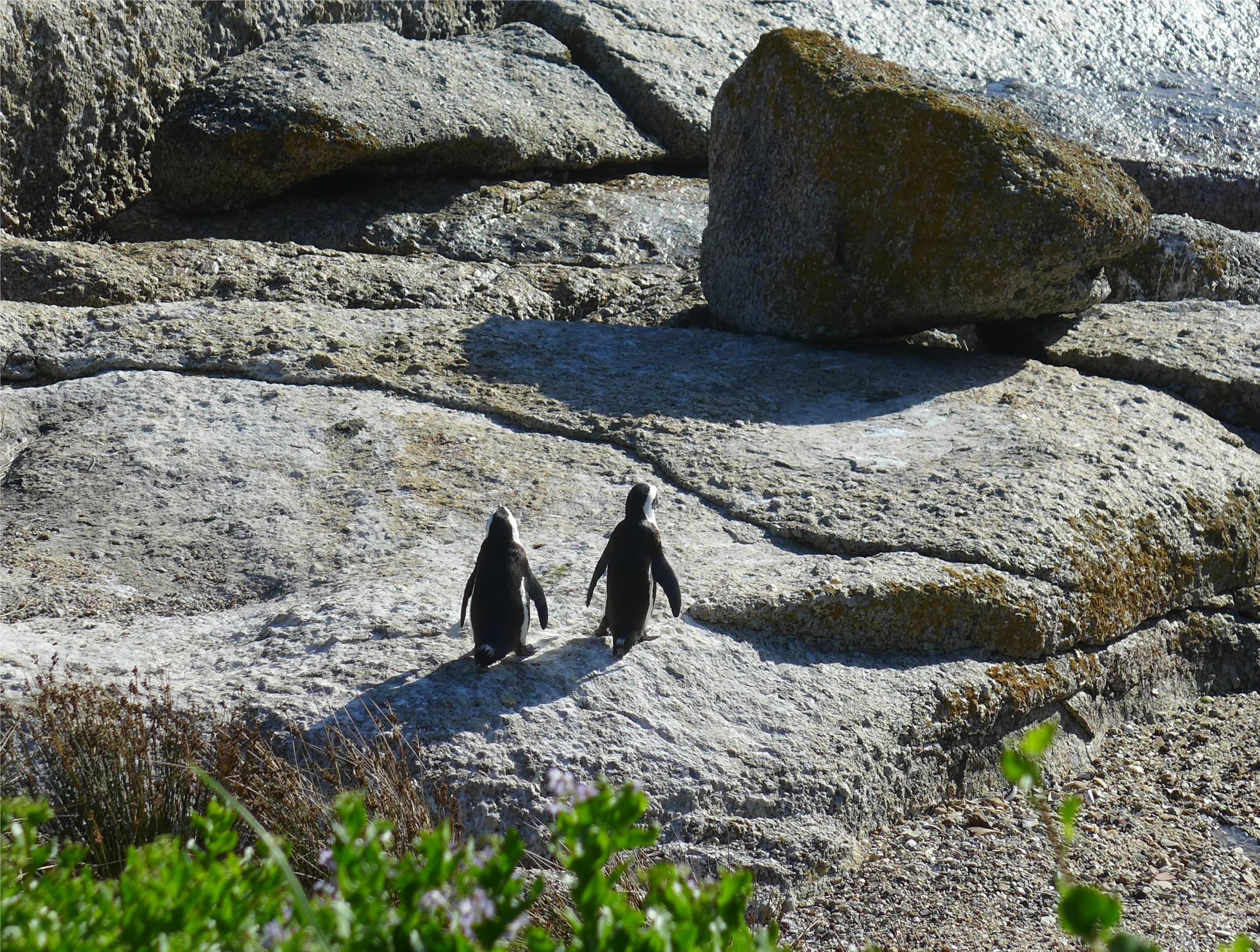 Am nächsten Morgen geht es früh los. Wir wollen uns das Kap der Guten Hoffnung auf dem Landweg ansehen. Auf dem Weg machen wir in der Nähe von Simonstown eine kleine Pinguin-Pause. Es gibt ein Pinguin-Zentrum mit Aussichtsplattform. Wir sind einfach auf einem Wanderweg in der nächsten Bucht unterwegs und sehen dort ebenfalls viele Pinguine. Die kleinen Brillenpinguine sehen putzig aus. Es bewahrheitet sich, man kann keine schlechte Laune haben kann, wenn man einen Pinguin anschaut. Nicht, dass schlechte Laune an so einem sonnigen Morgen ein Problem wäre.