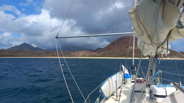 Und schließlich gibt es einen ernsteren Zwischenfall. Der Lümmel bricht. Als wir kurz vor Sonnenuntergang ein Reff einbinden wollen kracht es und das Unterliek des Segels ist plötzlich lose. Der Bolzen, der Baum und Mast verbindet und am oberen Ende zwei Haken hat, um die Reffs einzuhängen, ist durchgebrochen. Zunächst binden wir Segel mit einer Leine an den Baum, doch schnell wird klar, dass das keine Lösung ist. Der abgebrochene Bolzen bewegt sich. Fällt er raus, ist der Baum nicht mehr mit dem Mast verbunden. Die Reparatur ist überraschend einfach, wir haben den alten Lümmel noch an Bord. In Neuseeland hatten wir ihn, auf Anraten des Riggers, der zum Check bei uns an Bord war, ausgetauscht. Nun drücken wir den abgebrochenen Bolzen mit dem alten und einigen liebevollen Hammerschlägen raus und der alte Bolzen nimmt seinen Platz ein. Warum der alte Bolzen 30 Jahre gehalten hat und der neue nur drei, wissen wir nicht. Schöner Nebeneffekt: der Haken des alten Bolzens sind irgendwie etwas anders geformt. Es ist viel einfacher das Segel zum Reffen einzuhängen. Wir hätten schon lange tauschen sollen.