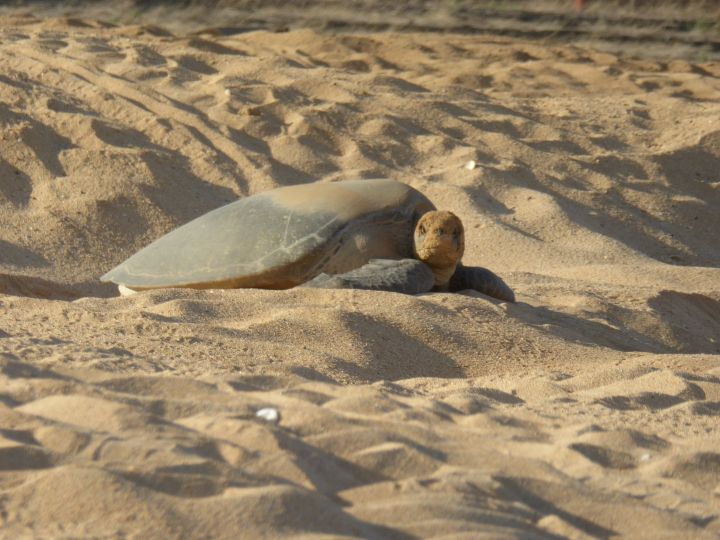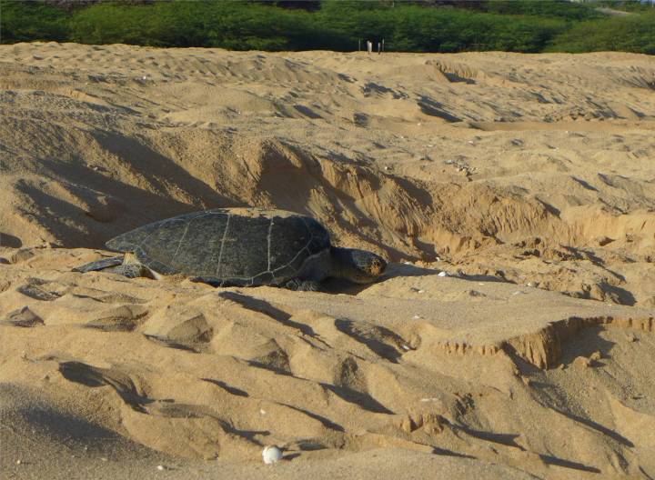 Die Schildkröten kommen im Dunkeln an den Strand und graben ein tiefes Loch, in das sie die Eier ablegen.