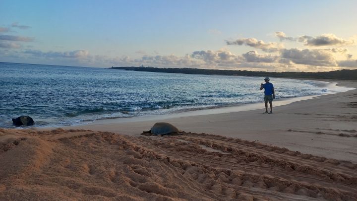 Sie schafft es trotzdem. Vielleicht auch, weil die Fregattvögel Respekt vor Nobbi haben, der die kleine Schildkröte bewacht, bis sie im Wasser ist.