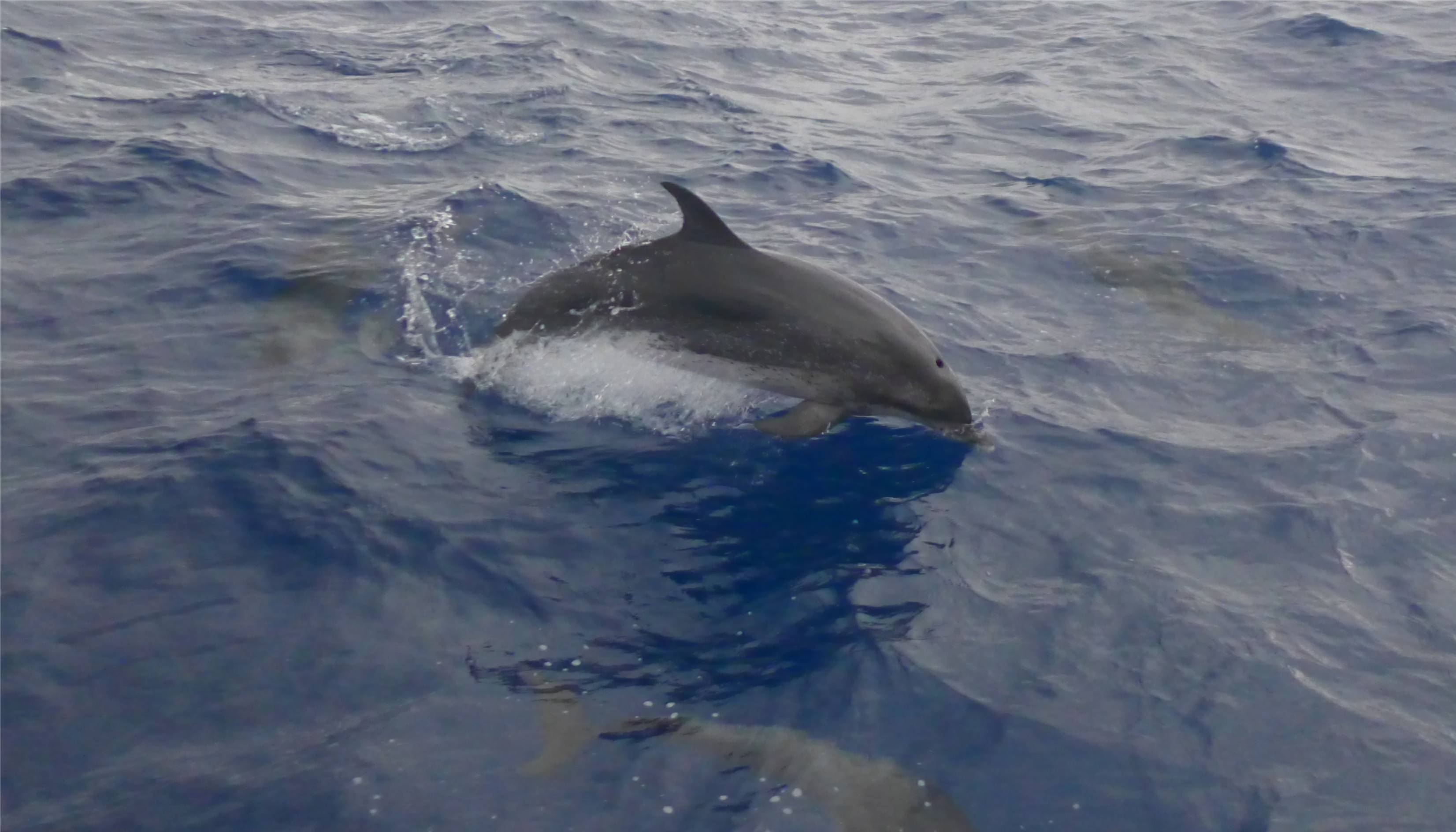 Am nächsten Morgen gewinne ich ein Ü-Ei, weil ich die Insel als Erste sehe. Genau genommen sind es zwei Inseln, Faial und Pico und so handle ich Nobbi auf zwei Ü-Eier hoch, später akzeptiere ich Schokolade als Ersatz. Viele kleine Delfine begleiten uns fast eine Stunde bei Sonnenaufgang und wir sehen zwei sehr große Wale, die leider nicht auf Fotodistanz ans Boot kommen möchten.