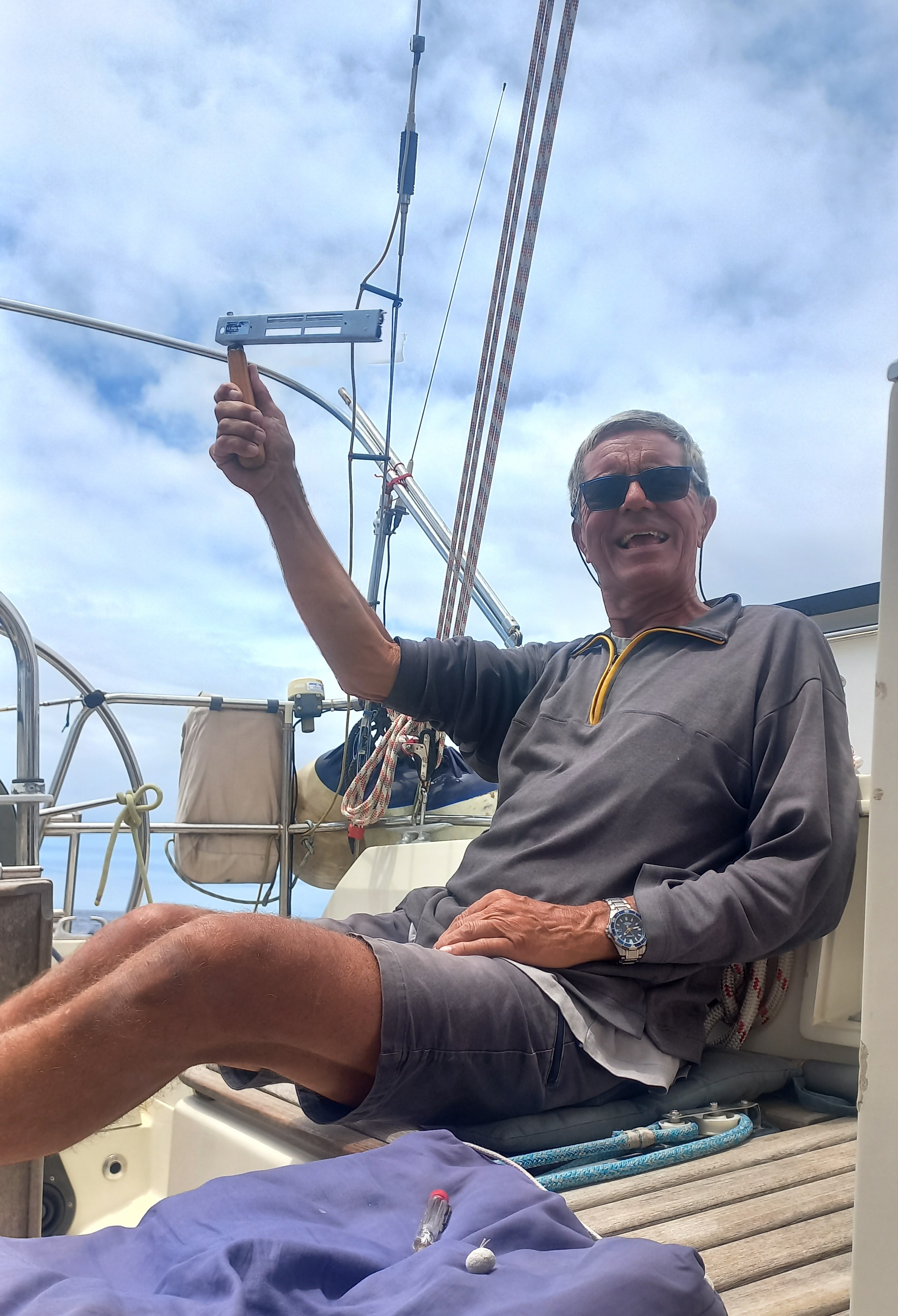 Wir haben Ersatz an Bord, ganz hinten im Kleiderschrank. Zum Glück ist das Wetter heute ruhig, die Wellen eher niedrig und der Wind sehr moderat. Nobbi geht in den Mast, pfriemelt den Rest vom alten Want heraus und hängt das neue ein. Das ist schnell gemacht, deutlich länger dauert es alles wieder einzuräumen.