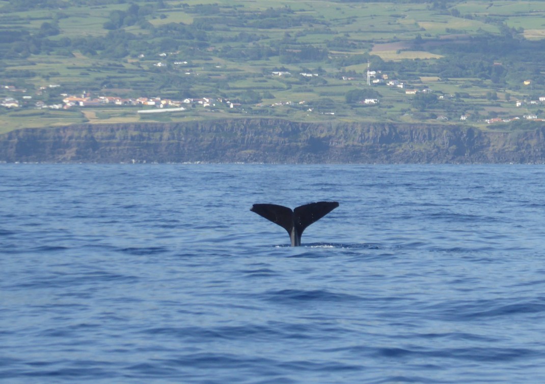 Im Hafen ist ein Anbieter für Whale-Watching neben dem anderen. Manchmal hören wir uns nachmittags die Nachbesprechung an und sind beeindruckt. Wir wollen auch Wale gucken. Bei schönstem Wetter geht’s mit einem äußerst flotten Schlauchboot aufs Wasser. Nördlich von Faial sollen die Wale heute sein. Und tatsächlich, schon bald sehen wir den ersten Pottwal. Ein Wissenschaftler füttert uns mit Informationen und hat auch ein Hydrophon dabei, so dass wir die Klick-Laute der Pottwale hören können. Das viele Klicken verrät, dass mehrere Tiere unter uns tauchen. Tatsächlich tauchen immer wieder Wale auf, die wir dann einige Zeit beobachten können, bevor sie, mit dem beeindruckenden Heben der Fluke, wieder abtauchen. Sie tauchen einen Kilometer tief, jagen Tintenfische und kommen erst nach einer Dreiviertelstunde wieder an die Oberfläche. Auf dem Rückweg machen wir noch einen kleinen Umweg, um eine Gruppe von 40 bis 50 Großen Tümmlern zu besuchen. Die Delfine springen, kommen neugierig näher, sind dann aber doch sehr mit sich beschäftigt. Unterwegs sammeln wir einen toten Vogel und ein angebissenen Trompetenfisch ein. Beide sind für die Forschung interessant, mittels DNA- Untersuchung kann man feststellen von wo die Tiere hier eingewandert sind. Der Ausflug hat sich gelohnt, wir hätten nicht gedacht, dass wir so viele Wale aus der Nähe sehen!