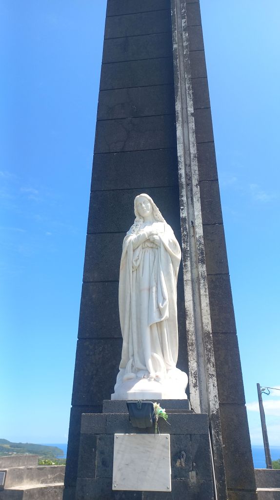 Im Norden der Bucht blickt Nossa Senhora da Conceicão über den Hafen. Das große Kreuz mit der Jungfrauenstatue sehen wir von unserem Liegeplatz aus und beschließen dorthin zulaufen. Die Landstraße ist unattraktiv als Wanderweg und wir suchen uns eine schöne Strecke, vorbei an schmalen Häusern und Kuhweiden. Vom Aussichtspunkt mit Kreuz und Senhora kann man nicht nur über den Hafen, sondern auch in die Nachbarbucht und hinüber nach Pico und São Jorge schauen.