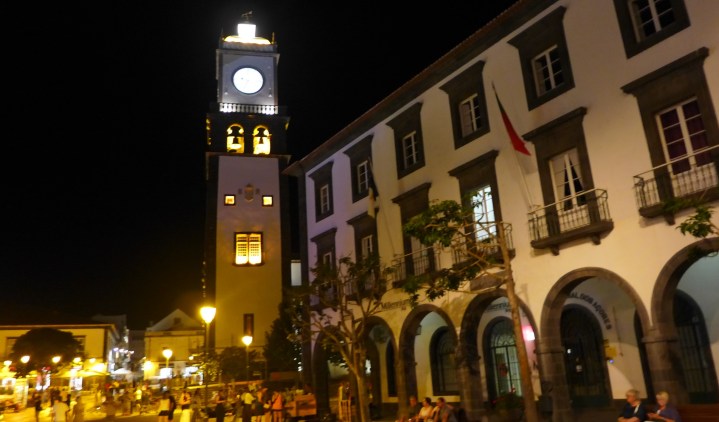 Ponta Delgada wurde 1499 gegründet und blickt auf eine bewegte Geschichte zurück. Davon zeugen herrschaftliche Häuser, Kirchen, Klöster, Türme und viele Parks. Das alte Stadttor von 1783 steht heute auf dem Platz gegenüber des Hafens, ganz in der Nähe des Rathauses. Der Glockenturm des Rathauses ist stolze 301 Jahre alt, eine seiner Glocken gar aus dem 16. Jhd. Wir erklimmen die schmalen Stufen und erfreuen uns am Ausblick über Ponta Delgada.
