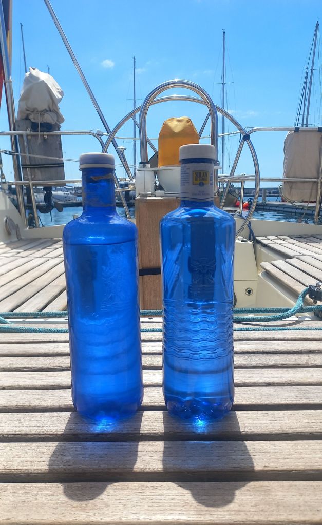 Beim Einkaufen entdecken wir die blauen Plastikwasserflaschen, die wir seit Jahren benutzen. Wir haben sie 2017 gekauft und sind mit ihnen um die Welt gesegelt. Hunderte Male haben wir sie gefüllt (meistens mit unserem selbst gemachten Wassermacher-Wasser). Immer mal wieder haben wir nach Ersatz gesucht, aber haben nie die ideale Flasche gefunden. Nun wandern unsere weitgereisten Exemplare in den Plastikmüll und wir gönnen uns ein paar neue. Es ist sehr unwahrscheinlich, dass diese Flaschen ebenfalls 40.000 Meilen unter Segeln erleben werden.
