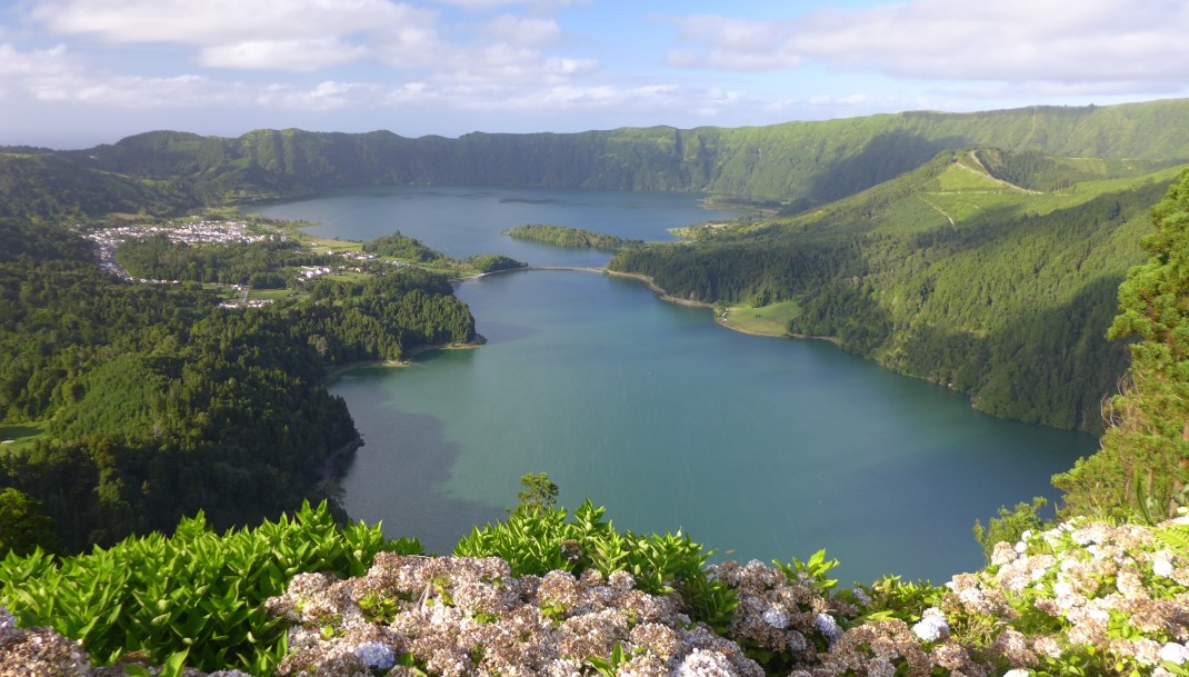 Unsere erste Tour soll uns zu einem Aussichtspunkt im Westen der Insel führen. Bei gutem Wetter fahren wir los. Die Straße schlängelt sich die Berge hoch und es wird zunehmend grau. Angekommen am Aussichtspunkt sehen wir nichts, wir stehen in der Wolke und werden nass genieselt. Also drehen wir um und sehen uns an der Südküste um. Wir besuchen den Leuchtturm, der uns nachts willkommen geheißen hat, und sehen uns eine sehr überlaufene Badestelle an. Am späten Nachmittag fahren wir von der Westseite der Insel auf die Berge, an deren Südseite wir ein paar Stunden zuvor umgekehrt waren. Die Wolkendecke hat sich aufgelockert und die tiefstehende Sonne beleuchtet die spektakulären Krater mit ihren Seen. Sete Cidades, so heißen die vulkanische Caldera, der Ort und der See, ist ausgesprochen schön. Der See besteht aus zwei Teilen, einer soll grün, einer blau schimmern.