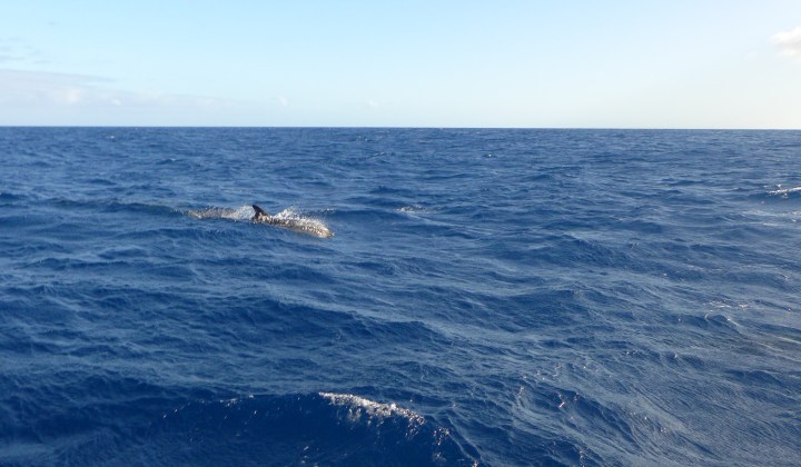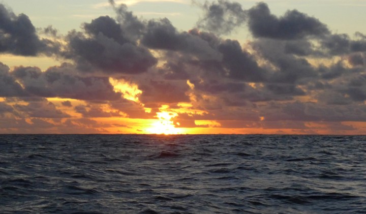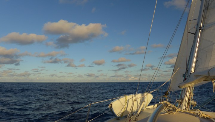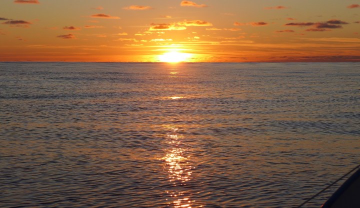 Am Samstag, 27. September, ist noch immer sehr schwachwindig. Der Wind hat auf West gedreht und wir segeln langsam in die richtige Richtung. Wir hatten Delfinbesuch, wurden von einer Golddorade begleitet und haben kleine schwarz-weiß gestreifte Fische, die uns bei dieser geringen Geschwindigkeit vorausschwimmen. In der letzten Nacht hatten wir einen wolkenlosen, ganz klaren Sternenhimmel mit einer Milchstraße bis zum Horizont und vielen Sternschnuppen. Die Nächte sind angenehm warm. Die Temperatur sinkt kaum unter 22 Grad. Kein Grund Strümpfe anzuziehen, wir sind weiterhin auf unserer persönlichen Barfuß-Route.