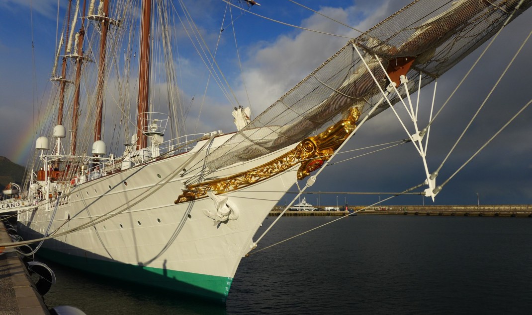 Es gibt auch erfreulicheren Besuch. Die “Juan Sebastián de Elcano“ ist ein imposanter Vier-Master, Ausbildungsschiff der spanischen Armada und auf seiner 98. Ausbildungsreise. Das 113 m lange Schiff wurde 1927 in Cadiz gebaut. Die Gelegenheit es zu besichtigen, lassen wir uns nicht entgehen. Die Taklinge auf den Leinen sind in den Farben der spanischen Flagge angemalt. Das schlägt sogar die Rattenbleche in französischen Farben, die wir bei der französischen Marine in Nouméa gesehen haben. Das Schiff ist in hervorragendem Zustand und die Kadetten haben fleißig Messing geputzt. Der Schiffsbesuch hat uns Spaß gemacht, auch weil die junge Crew so begeistert ihr Schiff vorgestellt hat.