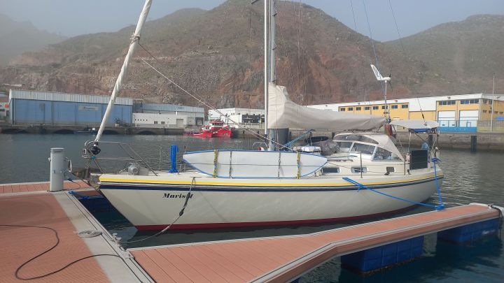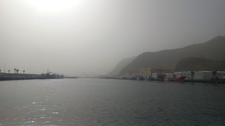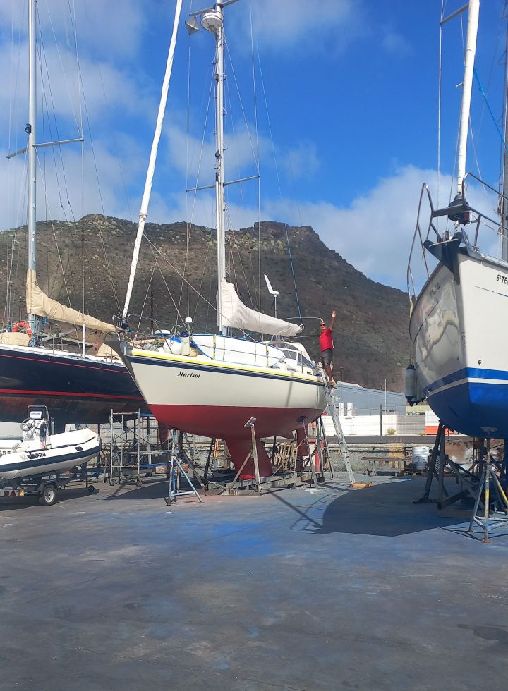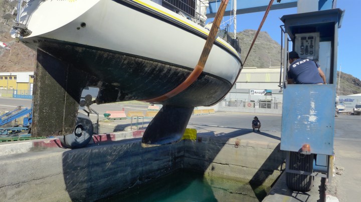 Am Montagmittag hängt Mari wieder in den Gurten des Travellifts und wir können auf die Stellen, an denen sie auf den Stützen stand, Antifouling auftragen. Danach wird Mari wieder ins Wasser gesetzt, Nobbi kuppelt rückwärts ein und grinst. Kein Rumpeln, kein schwarzer Qualm. Das Einstellen des Propellers war erfolgreich! Rückwärts fahren wir durchs Hafenbecken und machen dann am Steg der Werft-Marina fest. Zunächst bekommt unser Boot eine ausgiebige Dusche, um den Werftstaub abzuwaschen, auch wenn schon neuer Staub im Anmarsch ist. Calima. Heißer Ostwind trägt feinen Saharastaub auf die Kanaren (und Kapverden!). Die Sichtweite nimmt sehr stark ab. Wir können kaum das andere Ende des Hafenbeckens erkennen, Santa Cruz ist bereits morgens im Dunst verschwunden und es ist viel wärmer als an den Tagen zuvor.