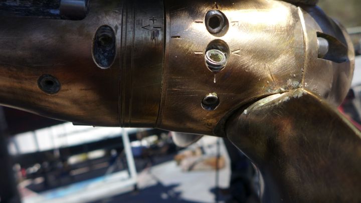 Wir haben einen Verstellpropeller. Der Anschlagpunkt der drehbaren Propellerblätter und somit die Steigung des Propellers, lässt sich einstellen. Wir haben den Verdacht, dass die Einstellung nicht mehr passt. Legen wir den Rückwärtsgang ein, rüttelt der Motor und es kommt schwarzer Qualm aus dem Auspuff. Ein Zeichen für Überlastung. Tatsächlich ist die Steigung des Propellers rückwärts deutlich zu hoch. Nobbi verändert die Einstellung. Anschließend muss er nur noch gefettet werden. Wir pressen Fett in den Propeller, bis wir den Eindruck haben, dass Wasser und altes Fest vollständig verdrängt wurden. Nachdem wir die neuen Anoden angebracht haben, verschwindet der glänzende Propeller in einem eleganten lila Müllbeutel.