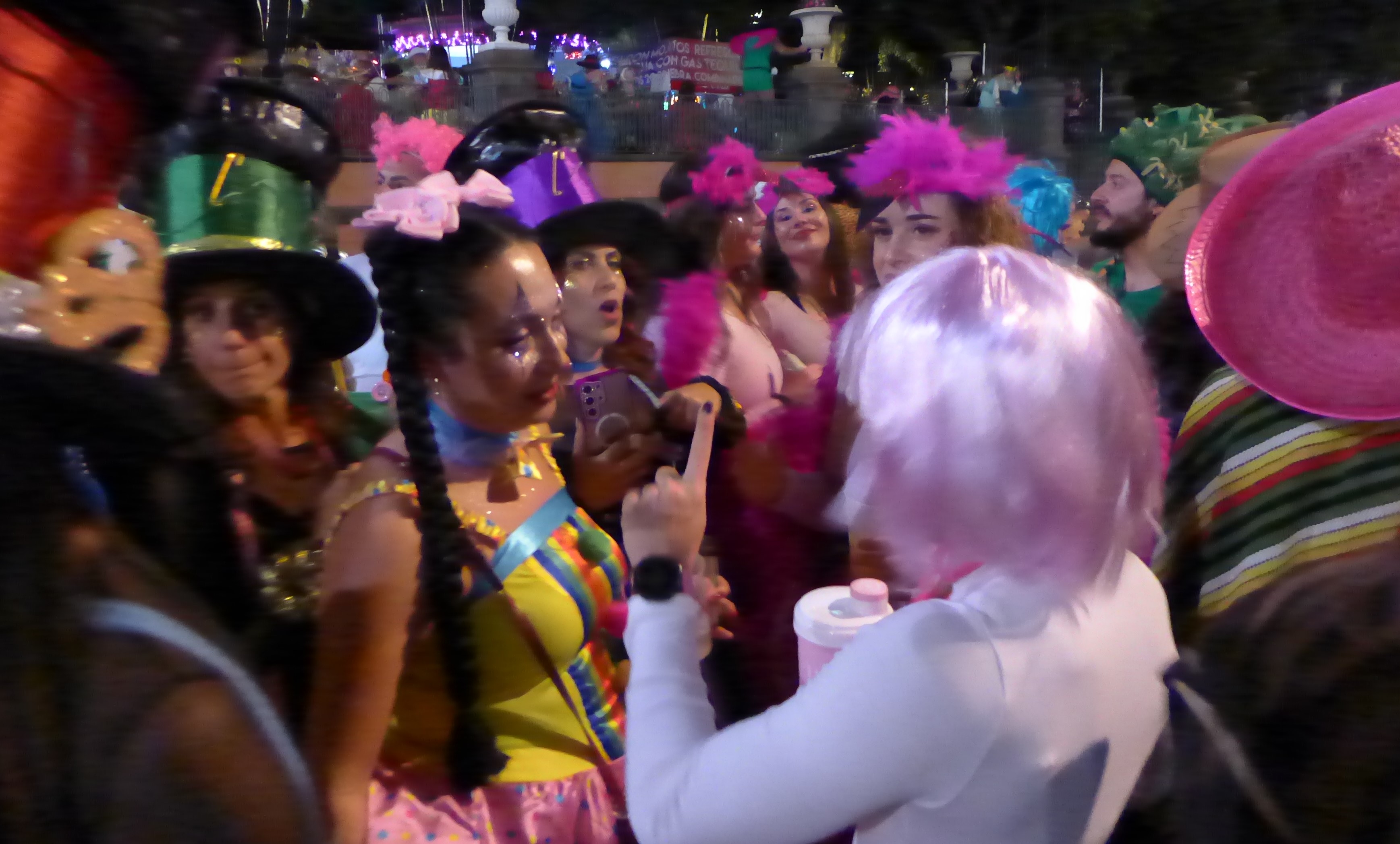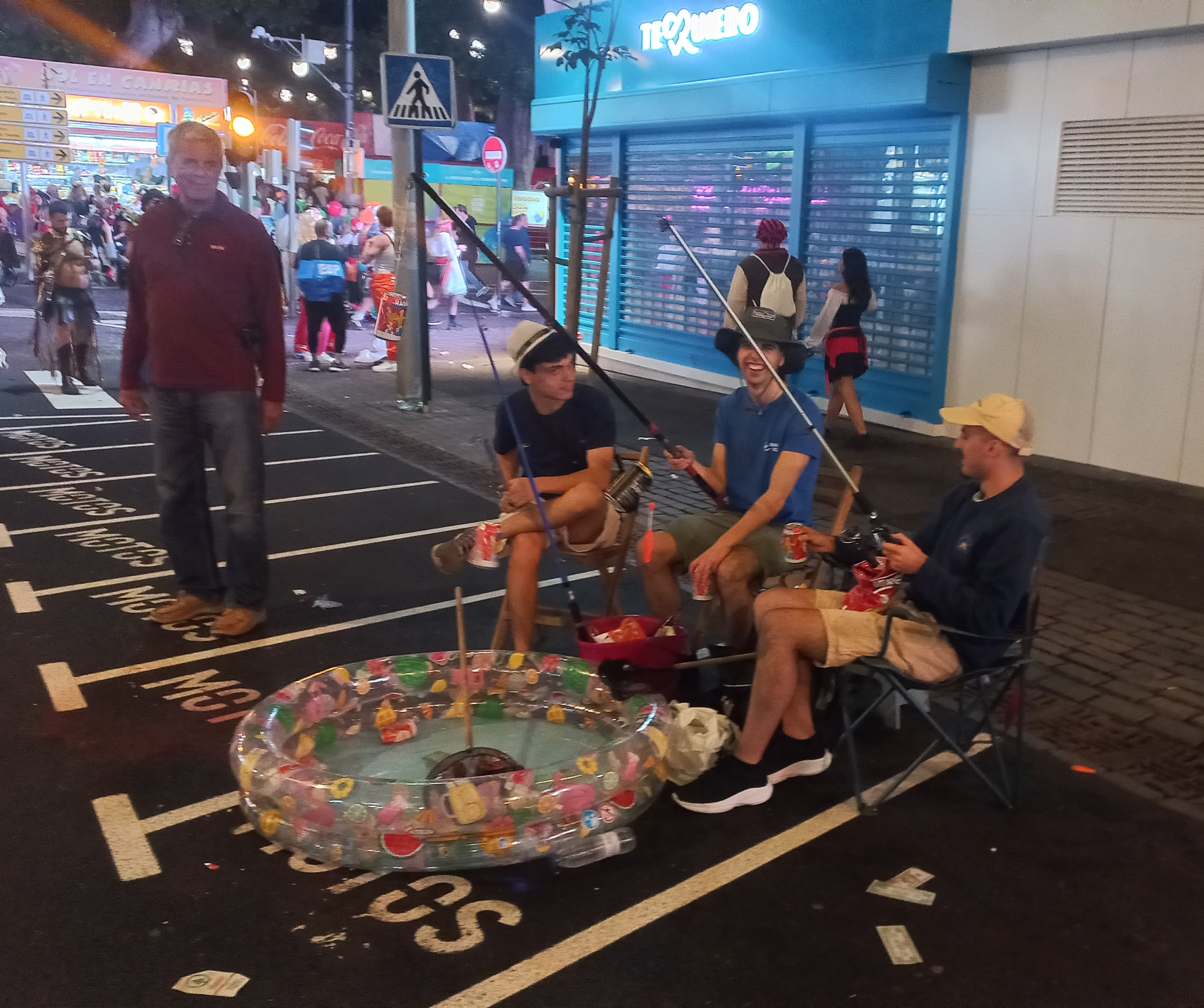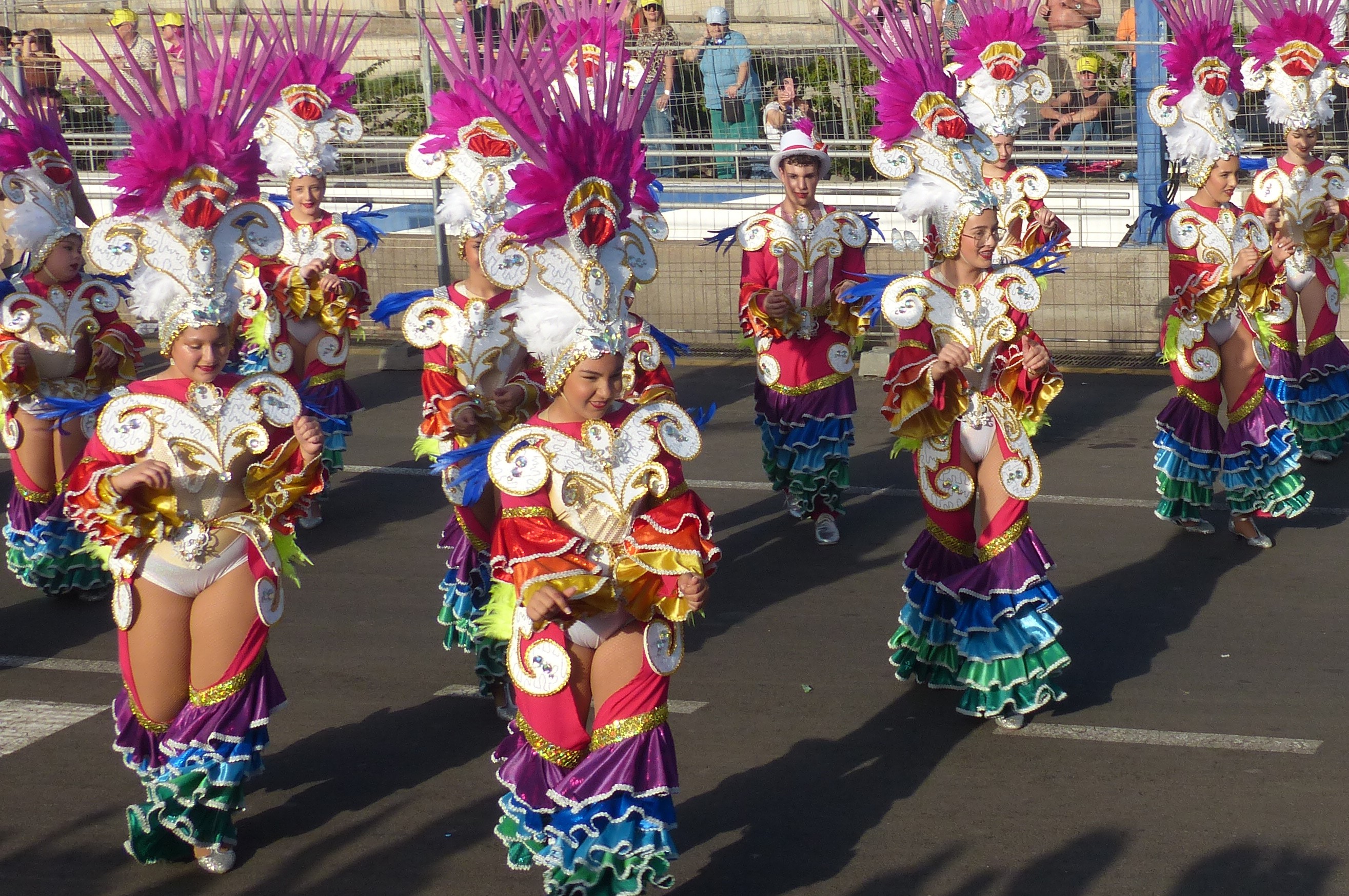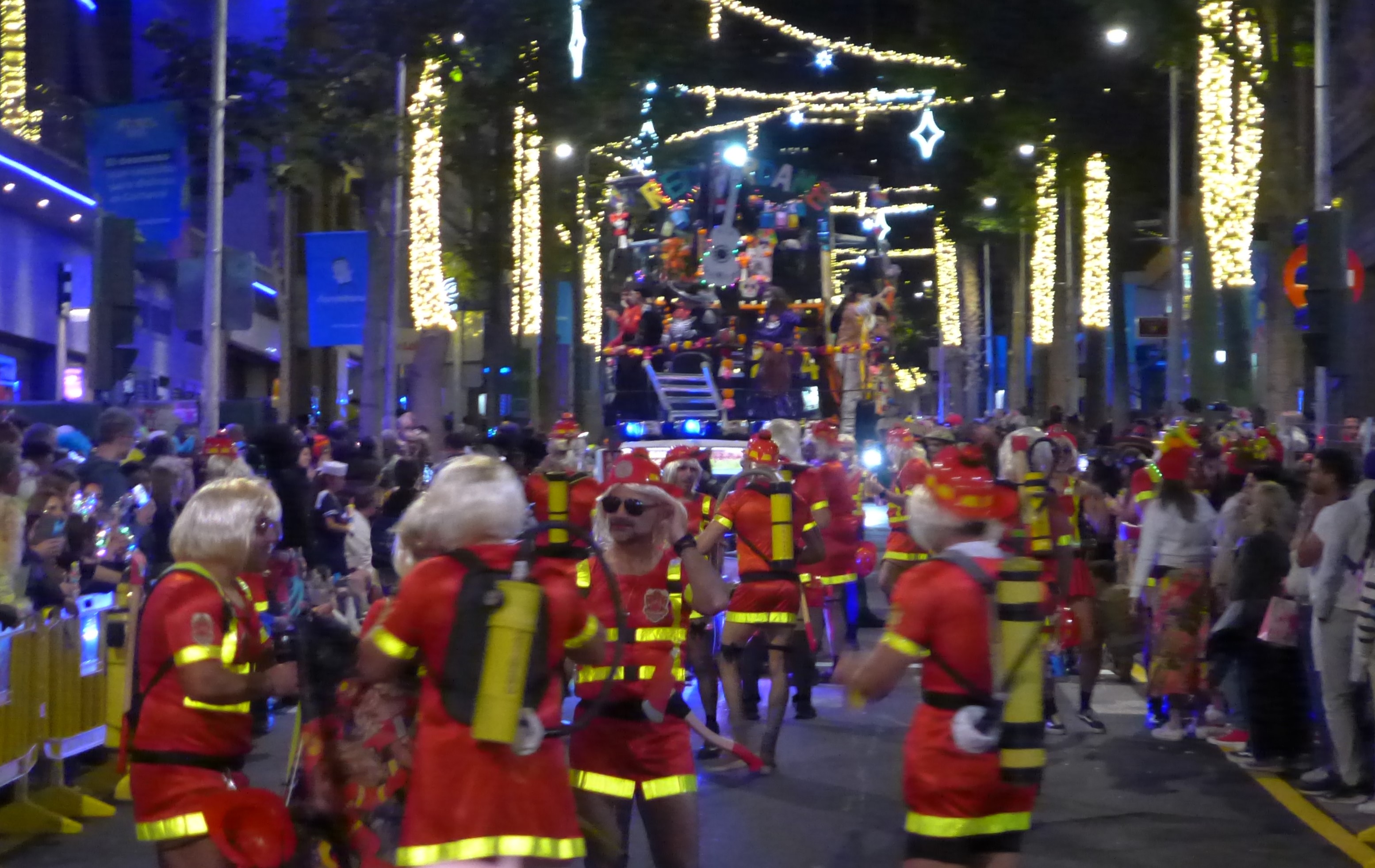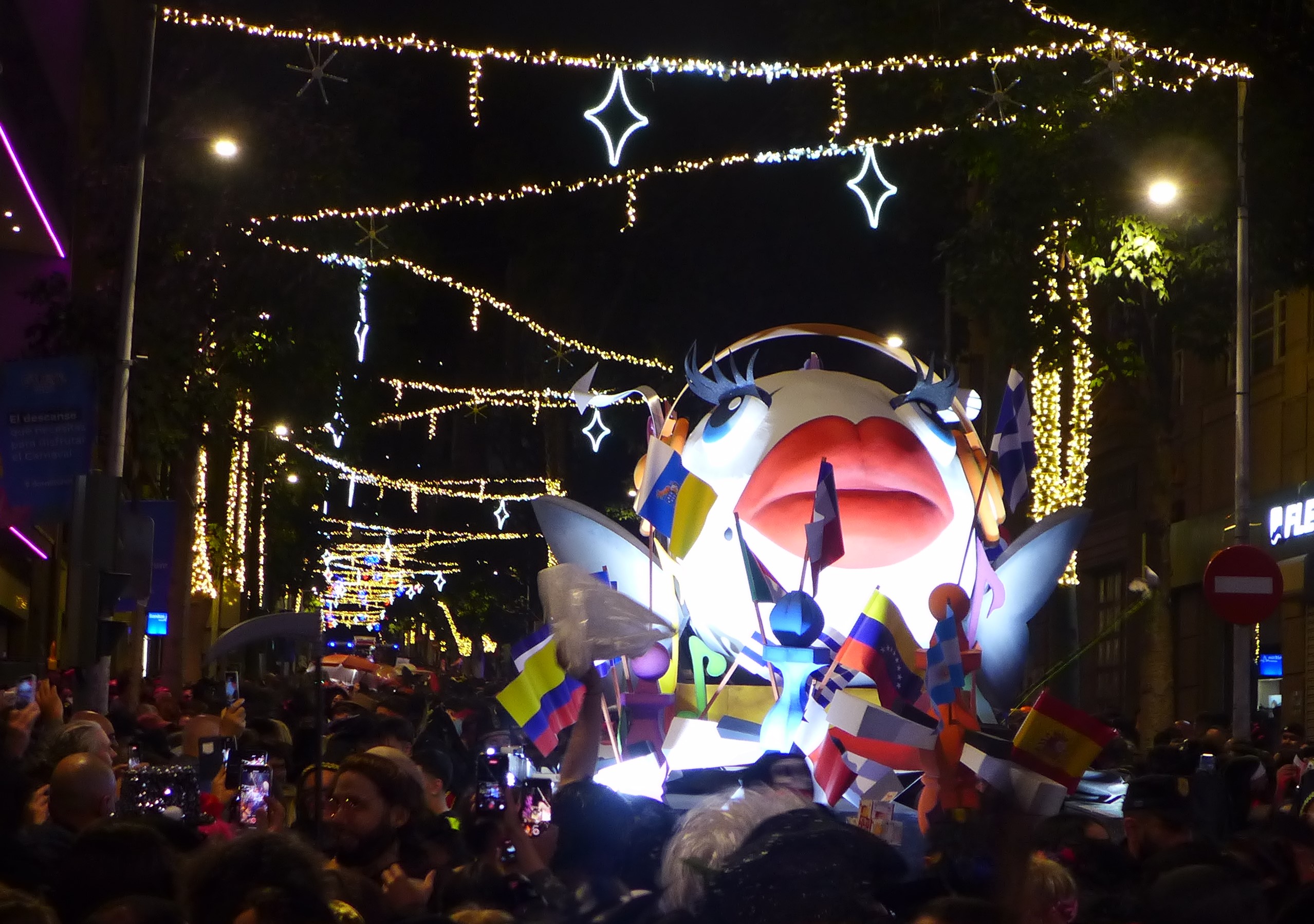 Beim Inklusionskarneval gefällt uns die (Salsa)-Musik am besten und das Publikum tanzt toll. Der Kinderumzug hat leider Pech mit windigem kühlem Wetter. Wir tragen eine Jacke, viele der Kinder sehen sehr verfroren aus. Die Tanzschulen, die wir schon von anderen Events kennen, haben schöne Choreografien einstudiert und begeistern das Publikum. Am Wochenende findet Freitag der Karneval der Nacht (den ganzen Tag) und Samstag der Karneval des Tages (den ganzen Tag) statt. Die hübsche, wie ich finde, sehr spanische Formulierung, stammt nicht von mir, sondern von der Veranstaltungsseite. Ab mittags wird gefeiert, abends wird es voll. Sonnabend sollen 420.000 Menschen auf der Straße gewesen sein. Beeindruckend! Mit einem Segelfreund stürzen wir uns ins Gewusel. Schnell wird es uns zu voll, auch wenn die Stimmung sehr fröhlich ist. Neben den viele tollen Kostümen und freundlichen Menschen wird mir leider der intensive Pipi-Geruch in Erinnerung bleiben. Ob es am Mangel an Toiletten oder den bereits am frühen Abend gefallenen Hemmungen liegt, kann ich nicht beurteilen. Nun wird auch mehr als deutlich, weshalb Ladenbetreiber und Hausbesitzer ihre Fassaden in Pastik verpackt haben und die Bierstände mit Bauschaum zum Boden abgedichtet wurden. Auf unserem Nachhauseweg steht die Straße unter Wasser. Nur, dass es sich eben nicht um Wasser handelt…