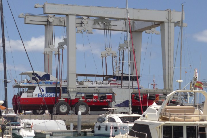 Die Marina Lanzarote hat laut eigener Aussage den stärksten Travel-Lift Spaniens. 820 t kann das Monster heben. Das Ding lässt nicht nur Segel- und Motorboote, sondern auch Fischkutter, kleine Fähren und Rettungskreuzer mühelos an Land schweben und übt eine gewisse Faszination auf Nobbi aus.