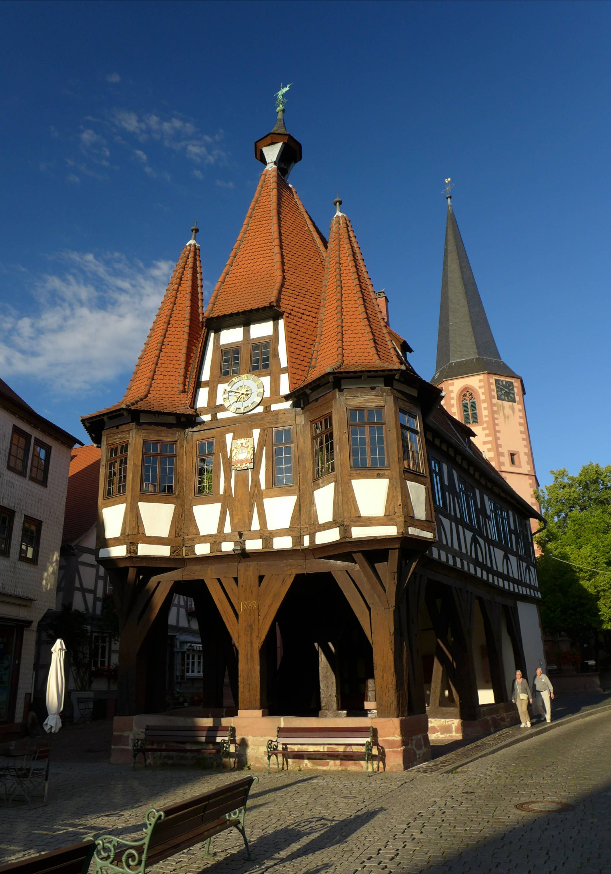 Unser Ausflug ist schon zu ende, der Abschiedsschmerz wird allerdings vom einem kräftigen Regen weggespült. Wir haben ein unglaubliches Wetterglück, kaum lassen wir den Alpenrand hinter uns, wird es freundlicher und schon bald scheint die Sonne. Wir übernachten in Michelstadt im Odenwald und trinken auf dem Marktplatz mit Blick auf das Rathaus von 1484 Ebbelwoi. Erstaunlicherweise schmeckt der ganz ohne Trainingsphase. Normalerweise brauche ich immer ein bis zwei Gläser bis ich Apfelwein wieder mag.