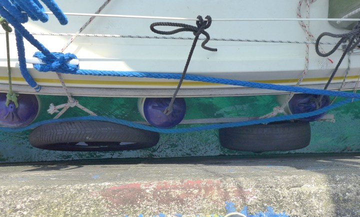 Diese Konstruktion aus Reifen, Fenderbrett und Fendern schützen unseren Rumpf vor der rauen Betonmauer.
