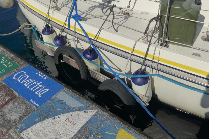 Weiterhin warten wir auf unsere Pakete. Bei jedem ankommenden Containerschiff bin ich mir „sicher“, dass mein Paket an Bord ist. Langsam würden wir gerne weitersegeln. Wir wollten nicht den ganzen Sommer in Horta verbringen. Aber es hilft nichts, wenn wir uns ärgern kommt unsere Post auch nicht schneller. Nach dem gelungenen Wochenende mit Inselrundfahrt soll das Wetter schlechter werden. Erwartet wird nicht nur Regen, sondern auch starker Wind aus Süden. Während einige Segler einen „strong blow“ erwarten, haben andere erst gar nicht den Wetterbericht beobachtet und sind so völlig entspannt. Es herrscht ein allgemeines Chaos, weil viele Boote umgeparkt werden. Als das schlechte Wetter einsetzt und viele Segler in Regenjacken auf der Pier stehen, vordergründig um ihre Leinen zu kontrollieren, in Wirklichkeit aber um mit ihren Nachbarn zu schnacken, fahren vier Mädels im Badeanzug in einem Dinghi auf und ab und fragen nach Schokolade. Etwas absurd, aber lustig. Wir sind froh um unsere Konstruktion aus Fenderbrett und Reifen, so werden unsere Fender nicht an der rauhen Betonpier aufgerieben. Letztlich pustet es draußen ganz ordentlich, im Hafen ist davon aber nicht viel zu spüren. Ein paar starke Böen, mehr nicht. Wir beschäftigen uns mit kleinen Bootsaufgaben. Die Starlink-Antenne haben wir nach nur einem Jahr im Einsatz weggeworfen. So genial es ist Internet an Bord zu haben, so nervig ist die Tarifstruktur von Starlink. Um unsere Antenne auf einen regionalen Tarif umzumelden, sollen wir 300 Euro bezahlen. Neu kostet die komplette Anlage hier gerade etwa 200 Euro. Das sehen wir nicht ein. Die Summe von Hochseemeilen, die wir in näherer Zukunft segeln wollen ist überschaubar, also beschließen wir, dass wir nun wieder ohne Satelliten-Internet unterwegs sein werden. Nach so vielen Ozeantagen in den letzten Monaten hat Mari sich ein wenig Pflege wirklich verdient. Wir polieren Edelstahl-Teile, entfernen Rostflecken, nähen das Bimini nach und tauschen Filter aus. Die Sofakissen und die Vorhänge werden gewaschen, Schimmelflecken im Vorschiff entfernt und der Herd geputzt. Ganz normaler Haushaltskram. Leider wird bei vielen dieser Arbeiten die ToDo-Liste länger. Ein Mosquito-Netz zerlegt sich und die Vorhänge sind nicht nur sehr ausgeblichen, es zeigen sich auch kleine Löcher. Auch bei Ausrüstung und Kleidung gibt es einige Verluste. Nobbis Schuhe verlieren die Sohlen, manch ein vermeidlich gutes Kleidungsstück wird nach Inspektion bei Tageslicht als Bordkleidung klassifiziert. Wir fühlen uns wohl in Horta, auch wenn das Duschen drei Euro kostet. Die teuerste Dusche unserer Reise. Auch die Warnung, dass Duschen auf Helgoland noch teurer sei, versöhnt mich nicht, sondern sorgt höchstens dafür, dass Helgoland auf der Liste der Wunschziele noch weiter nach hinten rutscht. Für drei Euro bekommt man hier im Supermarkt eine Flasche guten Wein, zwei Espressi und ein Stück Kuchen oder ein großes, frisch gezapftes Bier bei der Lieblingsbäckerei. Es gilt also Prioritäten zu setzen. Trotz der attraktiven Alternativen duschen wir, allerdings nicht statt des Kaffeetrinkens sondern zusätzlich. Das Wasser im Hafen ist glasklar und man kann bis auf den Grund in fünf Meter Tiefe sehen. Unter unserem Boot leben unterschiedliche bunte Fische, die Tomatenstückchen lieben. Der Hafen ist auch als Badestelle beliebt. Oft verbringen die Gruppen eines Feriencamps den Tag an der Bootsrampe mit baden, paddeln und sonnen, dann herrscht Freibad-Atmosphäre. Dieses Wochenende war schon wieder ein kleines Festival mit Konzerten. Freitagnachmittag gab es ein fröhliches Badebootrennen, das wir uns natürlich angesehen haben. Während Zweier-Teams im k.o.-System versuchen die trägen Gummiboote um die Bojen zu paddeln, haben wir einen Logenplatz im Schatten einer Mauer ergattert. Samstag gab es ein Konzert auf der anderen Seite des Hafenbeckens, die Zuschauer kamen mit allem was schwimmt: Schlauchboote, Kanus, Segelyachten, Walboote und SUPs. Wir hatten gewissermaßen einen Logenplatz und haben aus der zweiten Reihe von unserem Deck aus zugehört.