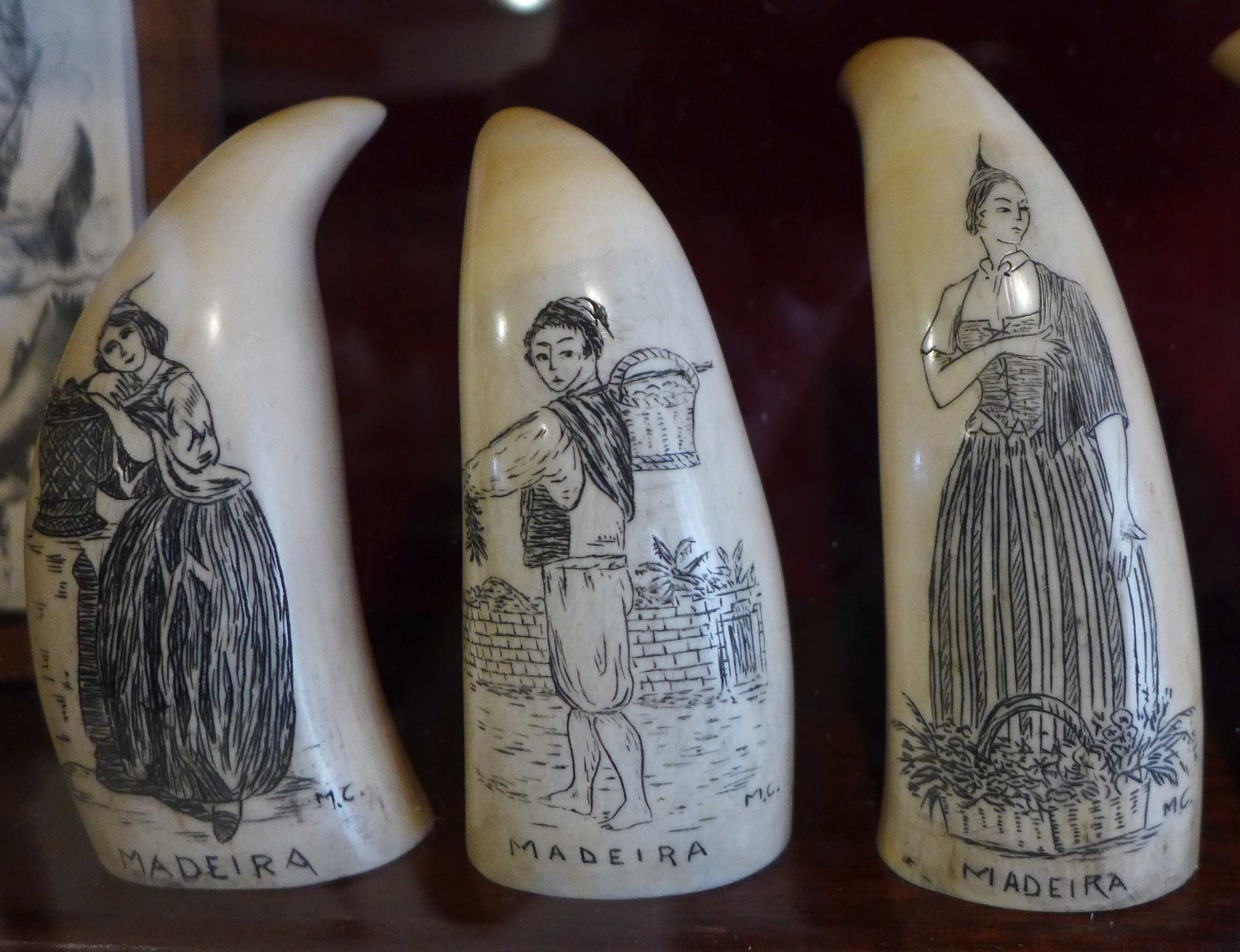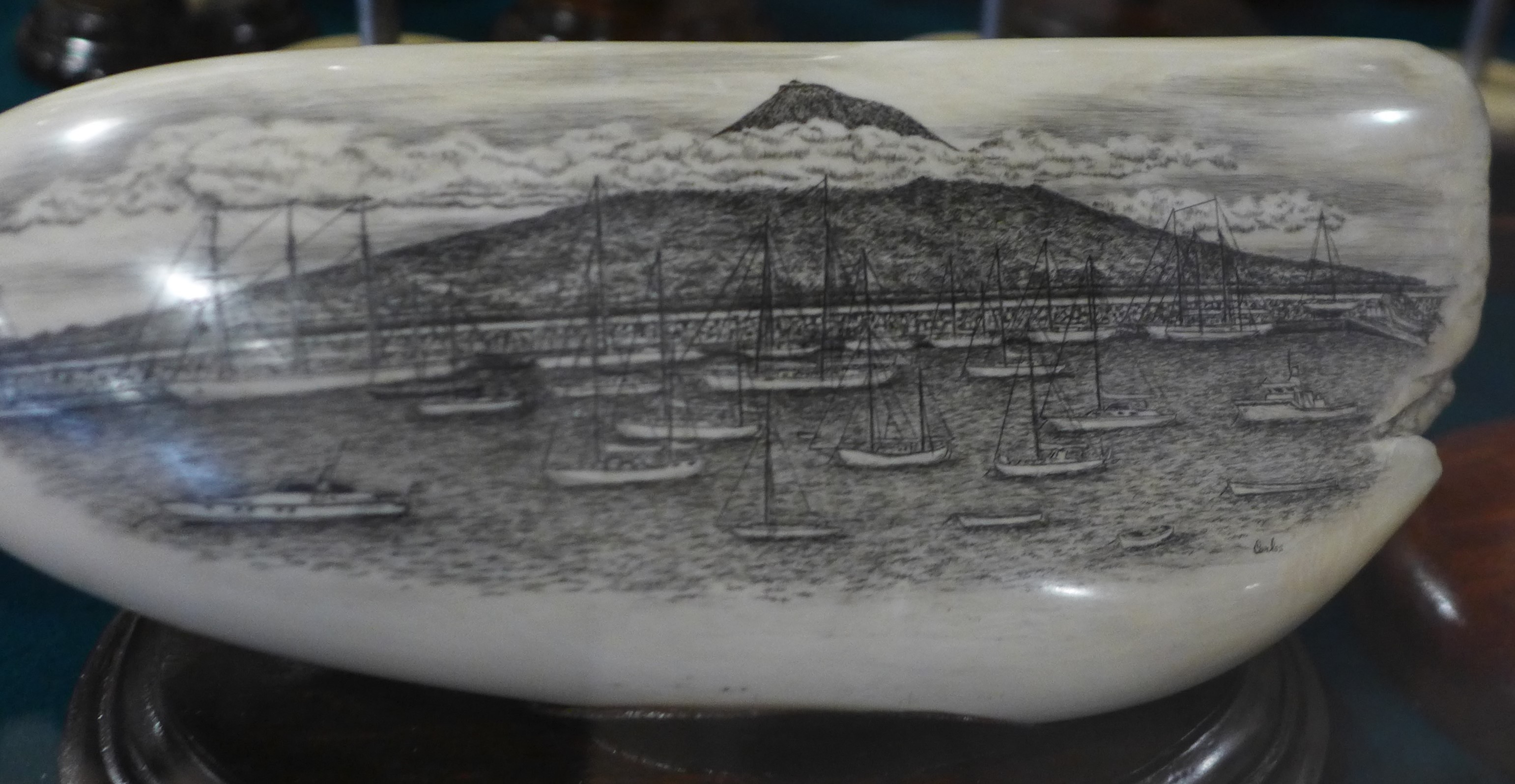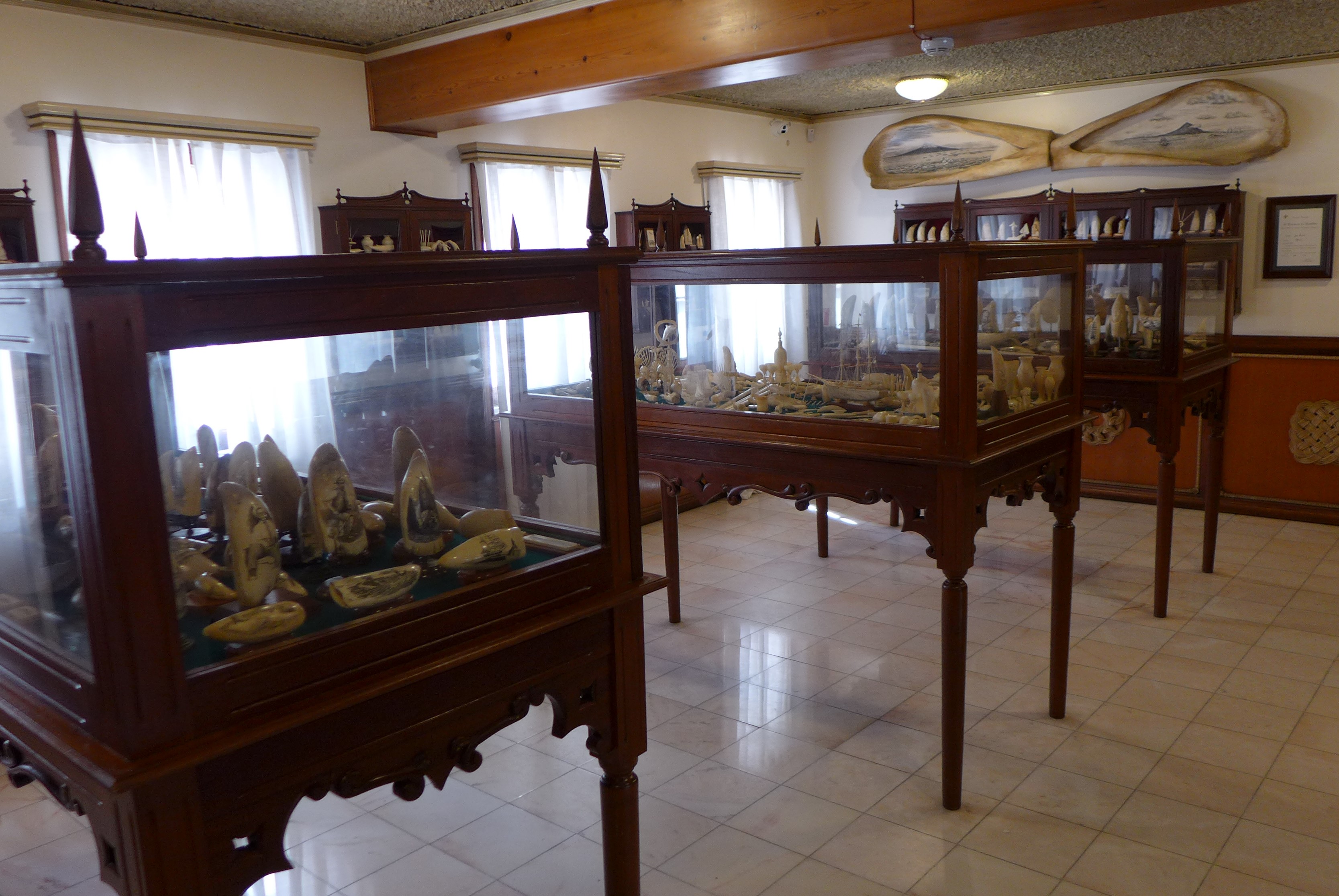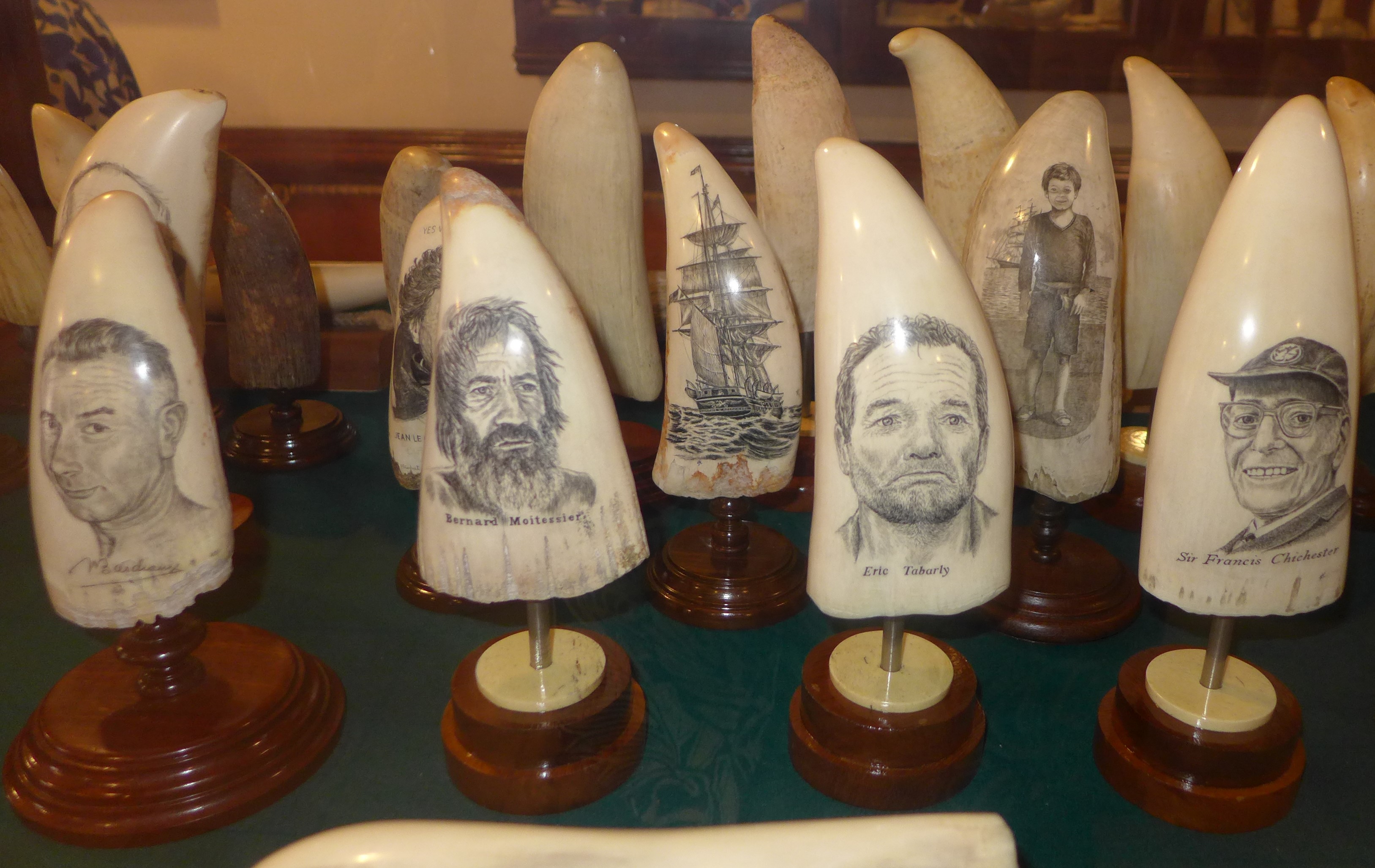 Letzte Woche waren wir im Scrimshaw-Museum. Scrimshaw nennt man die Gravur von tierischen Zähnen oder Knochen. Der Begriff stammt von den Walfängern, die zum Zeitvertreib Pottwal-Zähne verzierten. Es hatte zunächst keine positive Bedeutung, galt es doch nur als faules Vergnügen um die Zeit totschlagen, inzwischen werden die Kunstwerke sehr geschätzt. Die Sammlung des kleinen Museums über Café Sport gilt als eine der größten und schönsten für Scrimshaw-Kunst. Wir fragen an der Bar, ob wir das Museum besuchen können. Nach kurzer Zeit holt uns eine Frau ab, die uns eine fantastische Führung durch die Sammlung mit vielerlei Hintergrundwissen gibt. Der größte Pottwalzahn der Ausstellung ist zwei Kilo schwer, die meisten der verzierten Zähne sind zehn bis fünfzehn Zentimeter groß. In der Sammlung gibt es alte und neue Stücke, natürlich herrschen Walfang-Motive vor, aber es wurden auch Alltagsszenen und bekannte Persönlichkeiten abgebildet. Nicht nur die Mitglieder der Café-Sport Familie, auch viele berühmte Segler haben es auf die Zähne geschafft. Mir gefallen die klassischen Abbildungen von Großseglern jedoch am besten. Der Nachschub an Walzähnen dürfte sehr begrenzt sein, irgendwann werden alle alten Zähne eine Gravur erhalten haben. Der Handel mit Pottwalzähnen ist in der EU zum Glück inzwischen verboten.