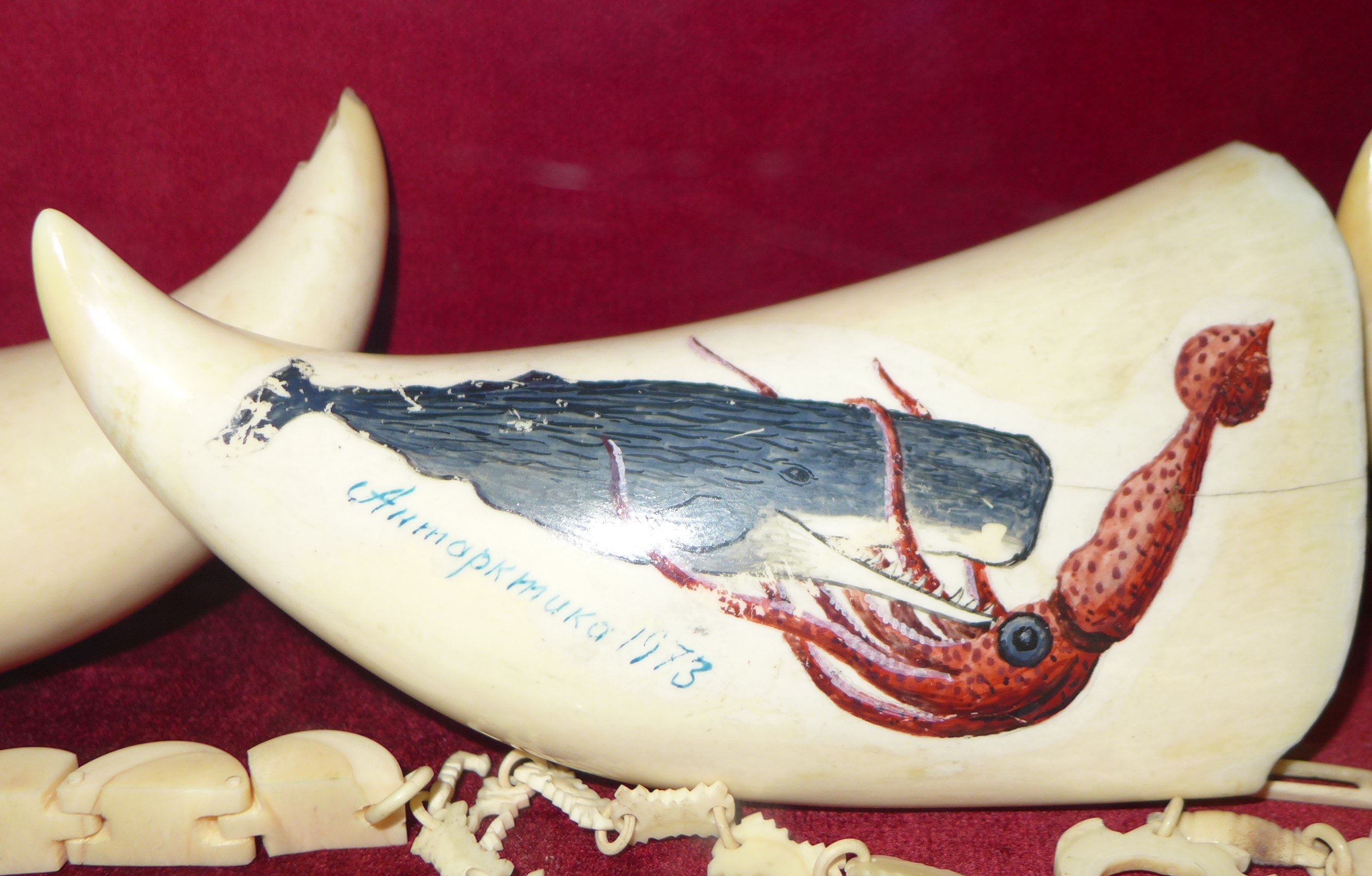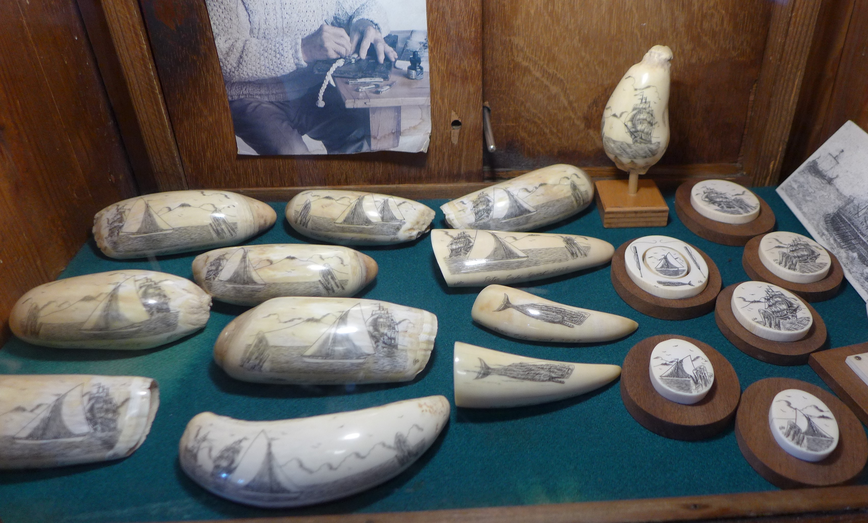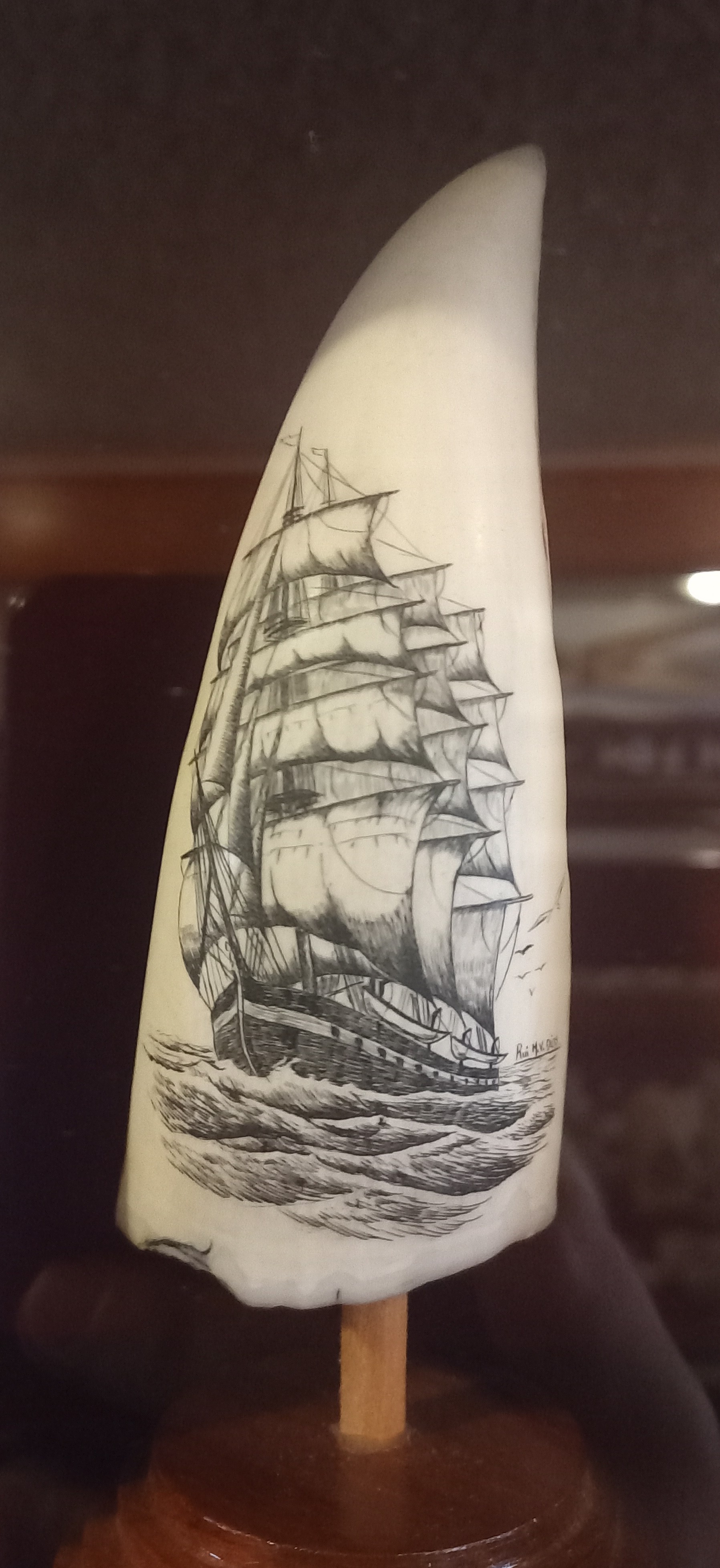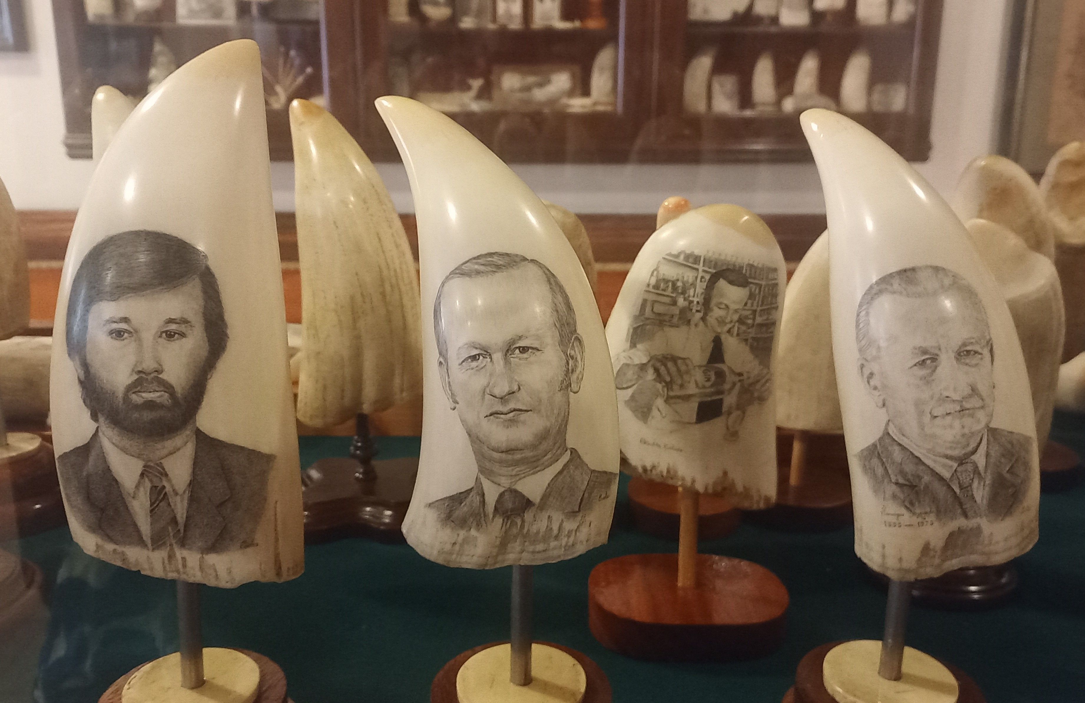 Letzte Woche waren wir im Scrimshaw-Museum. Scrimshaw nennt man die Gravur von tierischen Zähnen oder Knochen. Der Begriff stammt von den Walfängern, die zum Zeitvertreib Pottwal-Zähne verzierten. Es hatte zunächst keine positive Bedeutung, galt es doch nur als faules Vergnügen um die Zeit totschlagen, inzwischen werden die Kunstwerke sehr geschätzt. Die Sammlung des kleinen Museums über Café Sport gilt als eine der größten und schönsten für Scrimshaw-Kunst. Wir fragen an der Bar, ob wir das Museum besuchen können. Nach kurzer Zeit holt uns eine Frau ab, die uns eine fantastische Führung durch die Sammlung mit vielerlei Hintergrundwissen gibt. Der größte Pottwalzahn der Ausstellung ist zwei Kilo schwer, die meisten der verzierten Zähne sind zehn bis fünfzehn Zentimeter groß. In der Sammlung gibt es alte und neue Stücke, natürlich herrschen Walfang-Motive vor, aber es wurden auch Alltagsszenen und bekannte Persönlichkeiten abgebildet. Nicht nur die Mitglieder der Café-Sport Familie, auch viele berühmte Segler haben es auf die Zähne geschafft. Mir gefallen die klassischen Abbildungen von Großseglern jedoch am besten. Der Nachschub an Walzähnen dürfte sehr begrenzt sein, irgendwann werden alle alten Zähne eine Gravur erhalten haben. Der Handel mit Pottwalzähnen ist in der EU zum Glück inzwischen verboten.