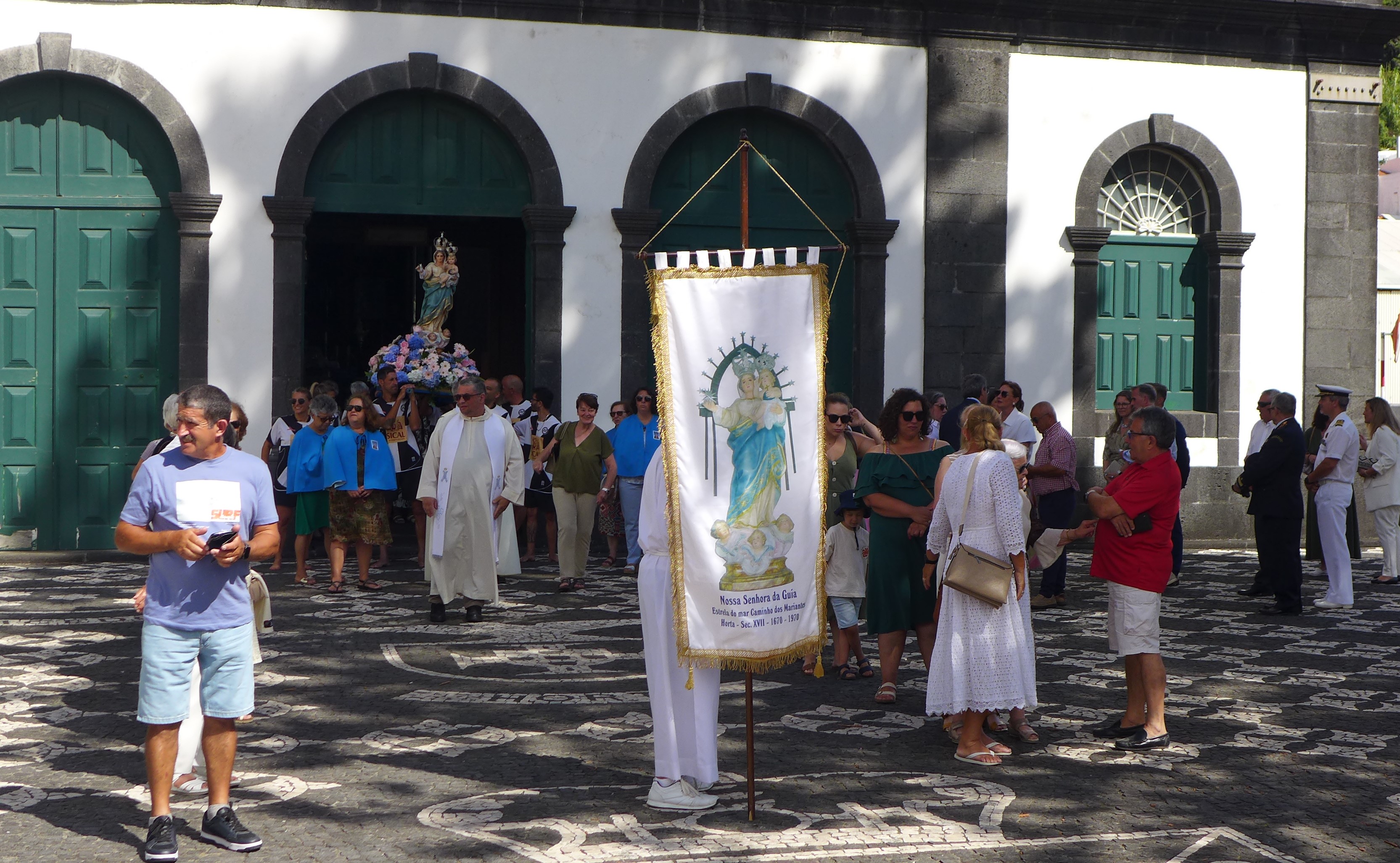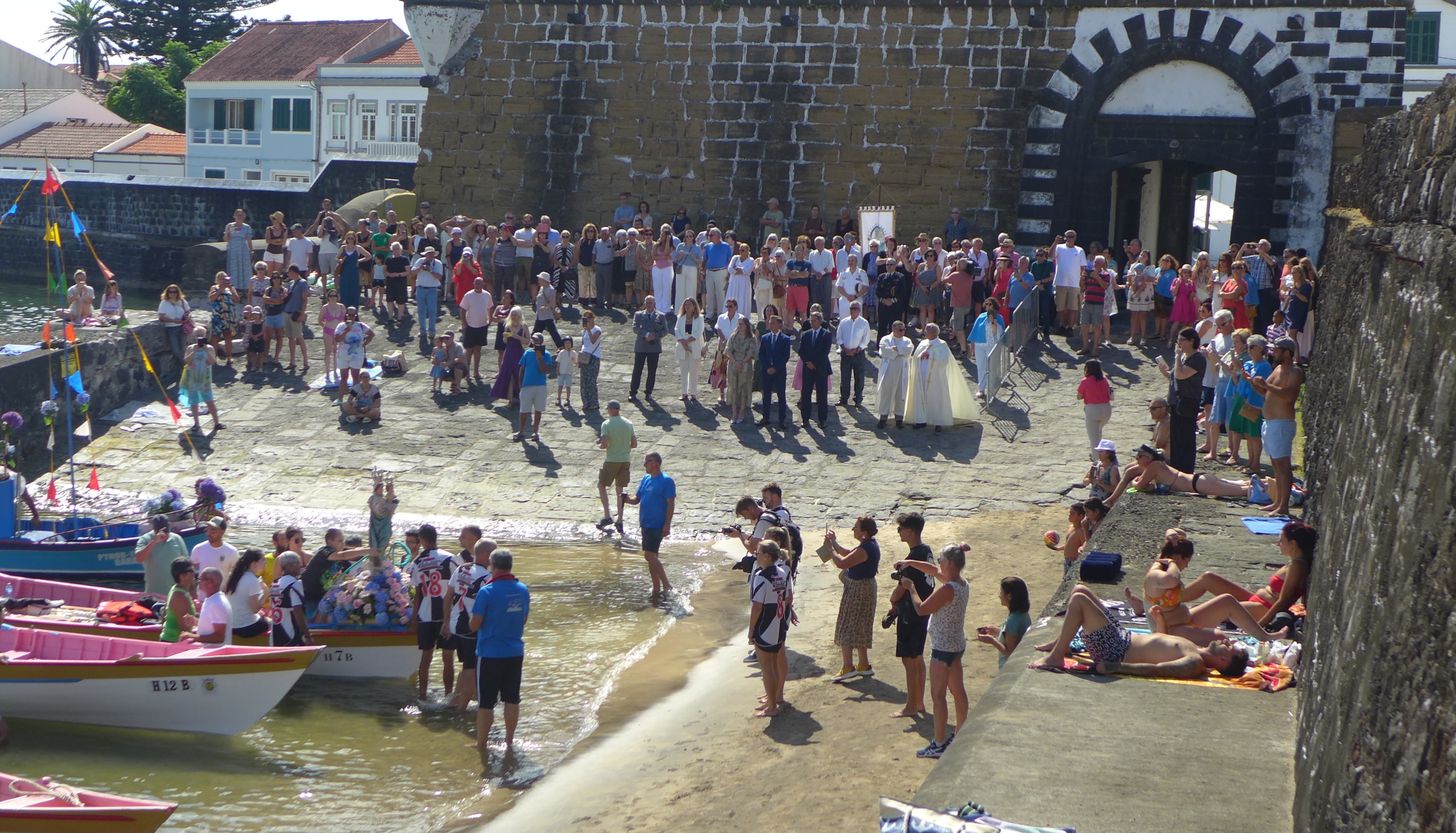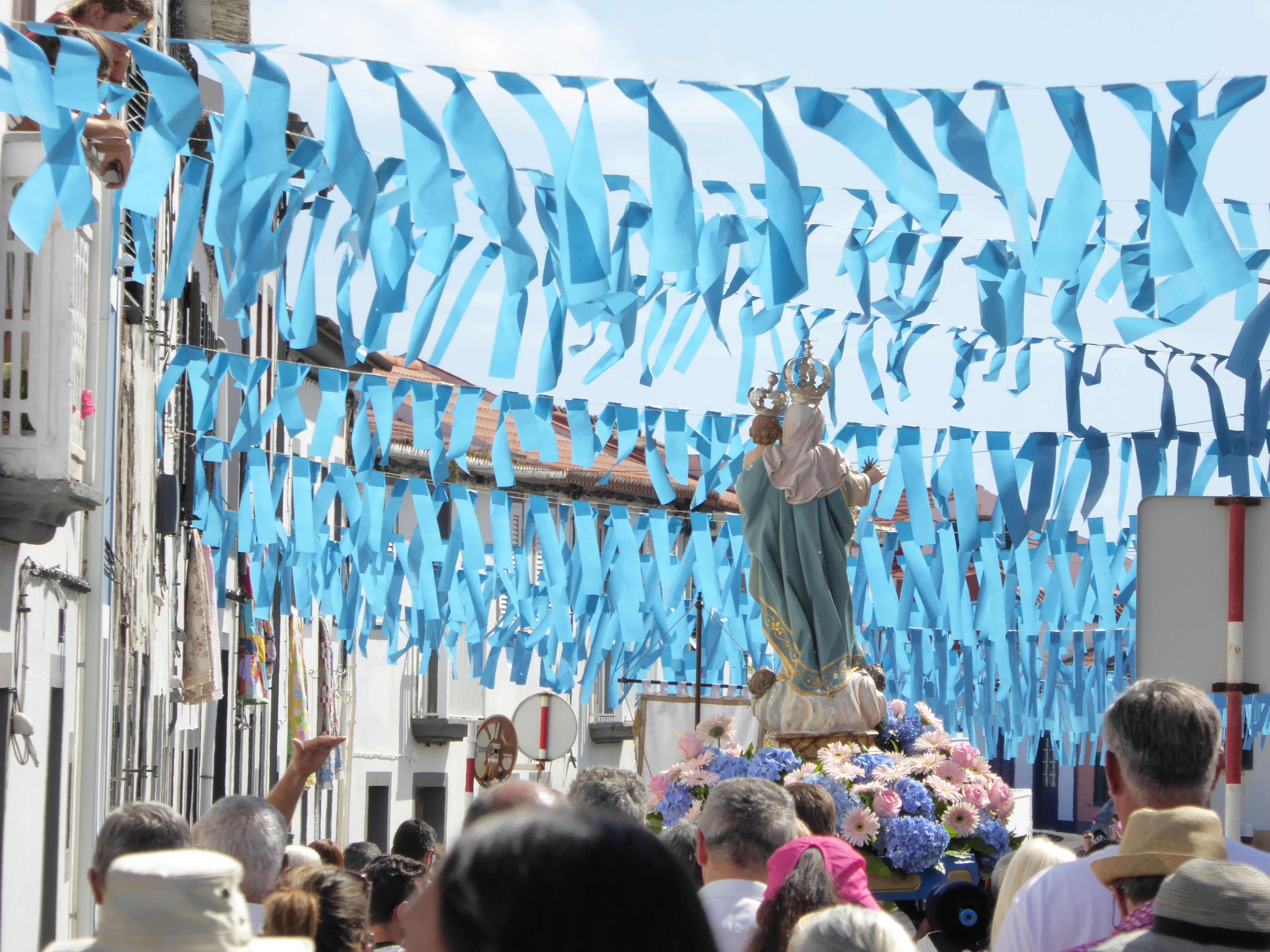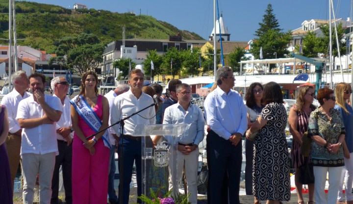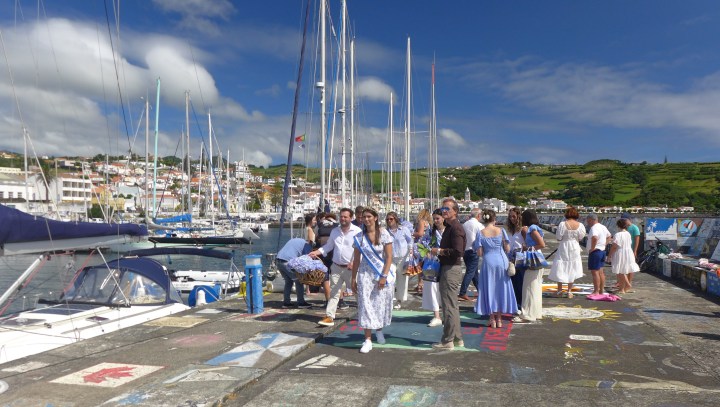 Jetzt, wo wir weitersegeln könnten, steppt hier der Bär. Die Semana do Mar, die Woche des Meeres, hat begonnen. Eine Woche voller Konzerte, kultureller Veranstaltungen und sportlicher Wettbewerbe. Wir Segler sind ausdrücklich eingeladen. Der Bürgermeister und die „Semana do Mar“-Königin gehen von Boot zu Boot und verschenken Hortensien, Käse, Honig und einen kleinen hölzernen Wal. Eine Frau von portugiesischen Fernsehen fragt mich, ob uns die Azoren gefallen. Das ist eine einfache Frage! Bei der Vorstellung eines Buchs werfen wir einen kurzen Blick auf den portugiesischen Präsidenten, den Zieleinlauf der Atlantis-Regatta beobachten wir von der Mole. Die verrückten Schwimmer, die 4sm von Faial nach Pico schwimmen, sehen wir nur im Fernglas. Natürlich verfolgen wir die Prozession bei der die „Nossa Senhora da Guia“ von der Kirche nach Porto Pim an Bord eines Bootes getragen wird, dann an ein größeres Schiff übergeben wird und auf dem Seeweg um den Monte Guia in den Hafen von Horta zurückgebracht wird. Nach einem Schlenker entlang der Hafenpromenade gelang die Jungfrau wieder in ihre Kirche. Die großen Rockkonzerte beginnen erst um 23:30 Uhr, danach gibt es jeweils eine After-Show-Party. Zum Konzert schaffen wir es, wenn die anschließende Party beginnt schlafen wir schon. Vor den Konzerten auf der großen Bühne, gibt es viele kleinere Auftritte der lokalen Musikgruppen. Wir stellen fest, dass es viele gute Blechbläser auf Faial gibt. Auch wenn die Meereswoche ein guter Anlass wäre zu bleiben, wollen wir uns nun endlich wieder bewegen. Morgen geht es ein paar Meilen weiter.