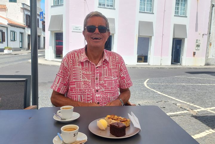 Am Dienstag trinken wir noch einen letzten Kaffee in einer kleinen Bar, bevor wir uns vom nettesten Hafenmeister der Nordhalbkugel verabschieden und uns auf den Weg nach Terceira machen. Wir segeln im Süden der Insel São Jorge entlang und haben genug Zeit uns die spektakuläre Küste anzusehen. Gerne hätten wir ein bisschen mehr vor São Jorge gesehen, doch wir hatten nicht viel Zeit und der Preis von 139 Euro (kein Tippfehler) für einen Mietwagen hatte eine abschreckende Wirkung. Schmale Täler schneiden sich tief in die schroffe Küste und kleine Orte sitzen hoch auf der grünen Insel. Zunächst kommen wir gut voran, dann schläft der Wind ein und schließlich motoren wir eine Stunde. Dann können wir wieder segeln und bei Sonnenuntergang lassen wir die Insel São Jorge hinter uns zurück und können Terceira bereits sehen. Wir haben wenig, wenn auch etwas unruhigen, schaukligen Seegang, und schwachen Wind, der uns jedoch mit vier Knoten vorankommen lässt. Die Nacht ist warm und fast wolkenlos. Der Sternenhimmel ist sehr klar und erst in den frühen Morgenstunden erscheint eine schmale Mondsichel. Ein Segler überholt uns mit großem Abstand, ein kleiner Frachter kommt uns entgegen, ein paar Fischer kreuzen unseren Kurs und ein Kriegsschiff macht anscheinend eine Übung und blinkt dabei mit großen Scheinwerfern. Was das wohl heißt?
