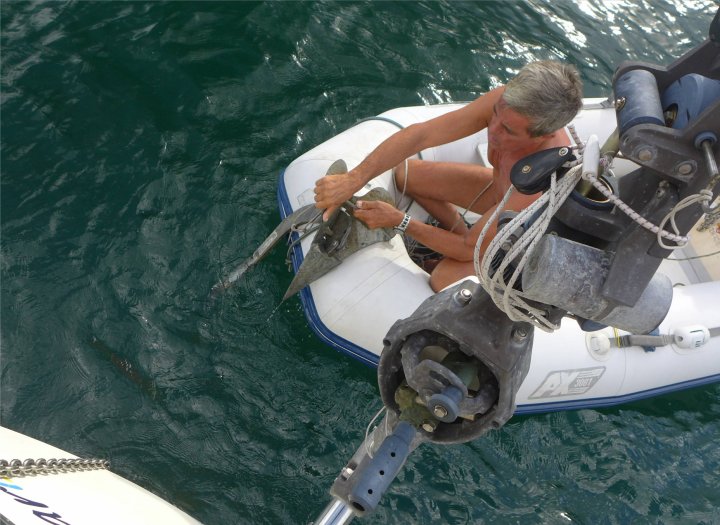 Am naechsten Morgen fuettern wir noch ein wenig die Doktorfische unterm Boot, sie moegen Kraecker, Schwarzbrot mit Leberwurst und Baguette-Kruemel, dann geht es fuer uns weiter.