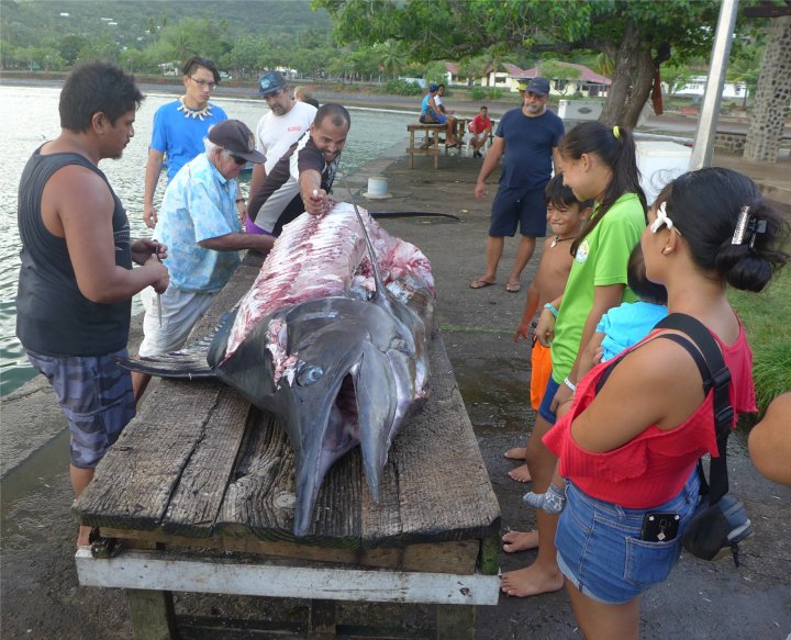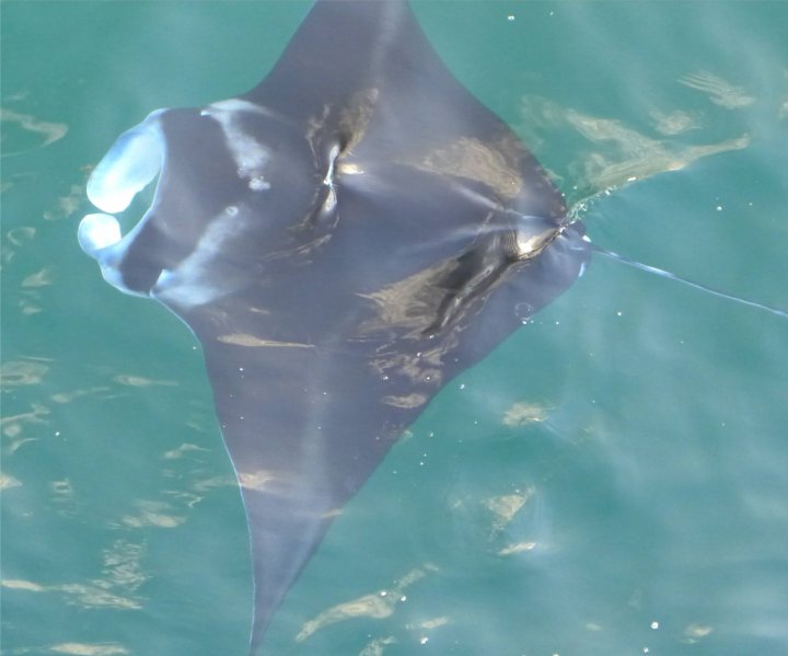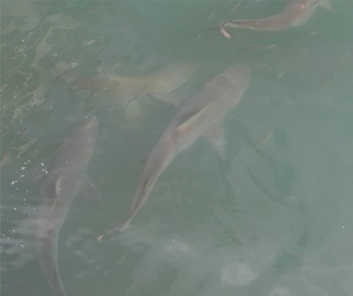 Montag hat der Wind auf Ost gedreht und wir machen uns auf den Weg zurueck zum Dorf am Pass. Der frische Wind hat eine erstaunlich hohe Welle in der Lagune aufgebaut, die die Lagunennavigation noch anstrengender macht. Die Korallenbloecke, die dicht an die Oberflaeche reichen, sind besser zu sehen, weil sie die Welle an ihnen bricht, die anderen schlechter. Ausserdem schaukelt Mari in der kurzen Welle. An dem Ankerplatz vorm Ort sind wir das einzige Schiff und so parken wir diesmal in der ersten Reihe. Wie immer kontrollieren wir schnorchelnd unseren Anker und erleben so zufaellig das beste Schnorcheln der Reise. Unterm Boot haben wir einen Schwarm Doktorfische, ich verzaehle mich bei ueber 200, ihnen gefaellt es anscheinend unter Mari. Unsere Schiffshalter haben wir uebrigens verloren, die sind nicht mit umgezogen. Das Wasser ist ganz klar und die Sicht hervorragend, ein Barrakuda und einige grosse Makrelen sind unterwegs. Da wird es dunkel. Ein Fischschwarm naehert sich. Tausende (oder noch viel mehr ?) Fische bilden eine riesige Wolke. Wenn der Schwarm ganz kompakt ist, quasi Fisch an Fisch, hat er einen Durchmesser von etwa 8m und eine Hoehe von ca. 6m. Um den Schwarm kreisen Haie. Immer wieder stossen sie in den Schwarm vor, worauf dieser sich teilt. Fantastisch! Natuerlich haben wir schon Schwaerme gesehen und auch viele Haie. Aber noch nie einen so riesigen Schwarm aus so vielen Individuen und noch nie mit Haien auf der Jagd. Wir halten uns am Rande des Geschehens und koennen uns gar nicht satt sehen. Was fuer ein Schnorchelglueck.
